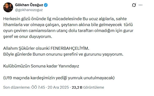 "Herkesin gözü önünde lig mücadelesinde bu ucuz algılarla, sahte ithamlarla var olmaya çalışan, şeytanın aklına bile gelmeyecek türlü oyun çeviren camiamsıların utanç dolu taraftarı olmadığım için gurur şeref ve onur duyuyorum. Allahım şükürler olsun ki FENERBAHÇELİYİM. Böyle günlerde bunun onurunu şerefini ve gururunu yaşıyorum. Kulübümüzün sonuna kadar yanındayız (U19 maçında kardeşimizin yediği yumruk unutulmayacak)"