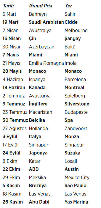 F1'den yapılan açıklamaya göre, 5 Mart 2023'te Bahreyn Grand Prix'siyle başlayacak organizasyonda, ilk kez bir sezonda 24 yarış düzenlenecek.