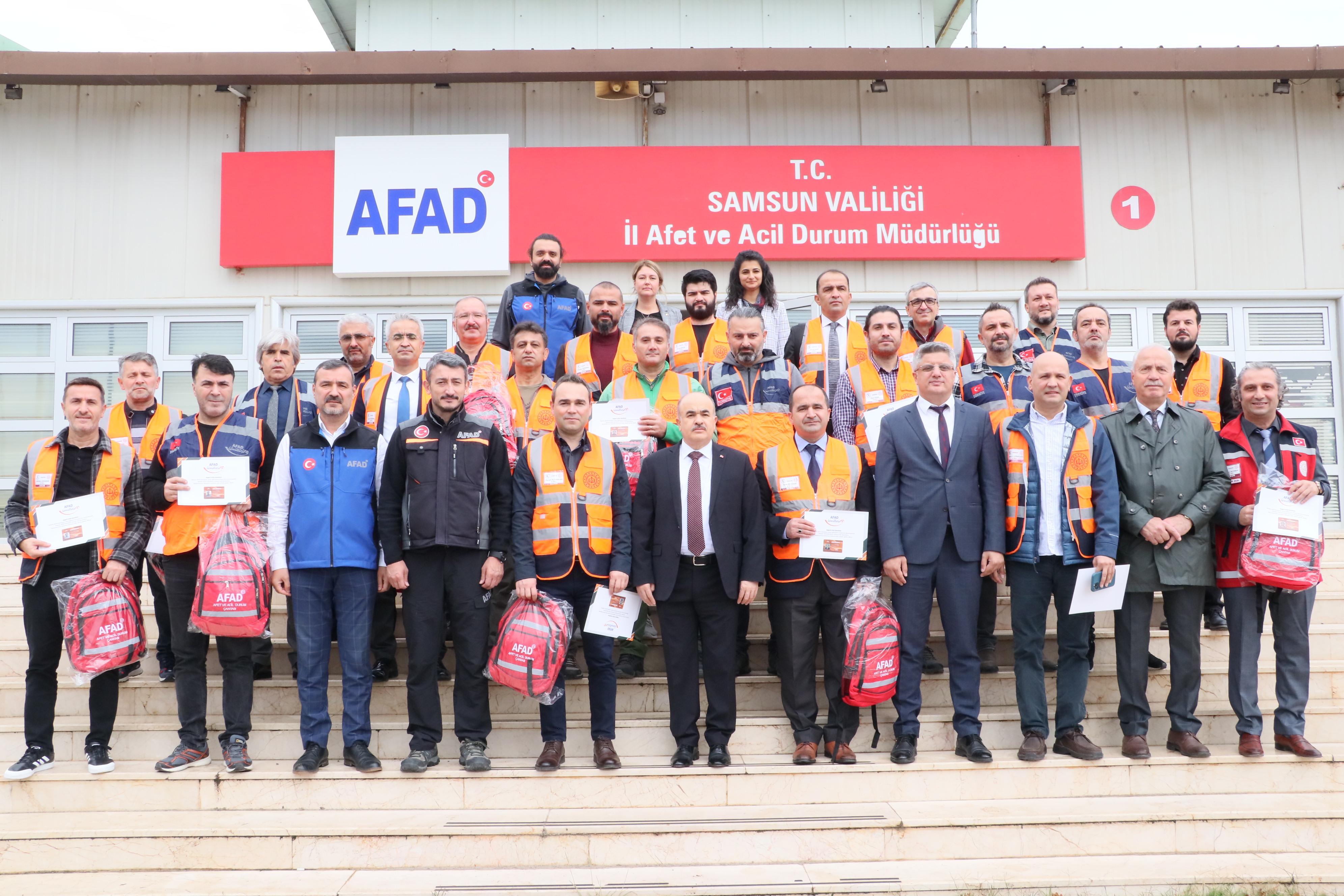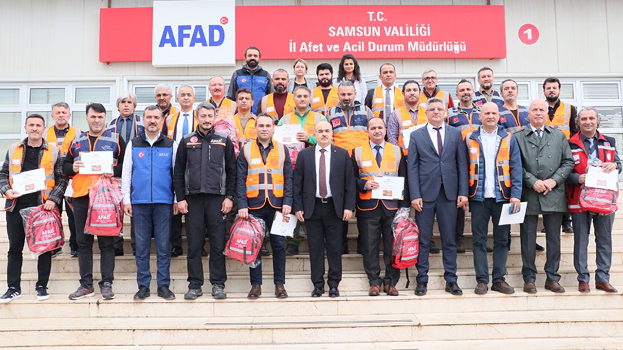 Samsun'da, Afet ve Acil Durum Müdürlüğü (AFAD) ile İl Milli Eğitim Müdürlüğü iş birliğinde eğitimlerini tamamlayan 24 öğretmen, Destek AFAD Gönüllüsü belgelerini aldı.