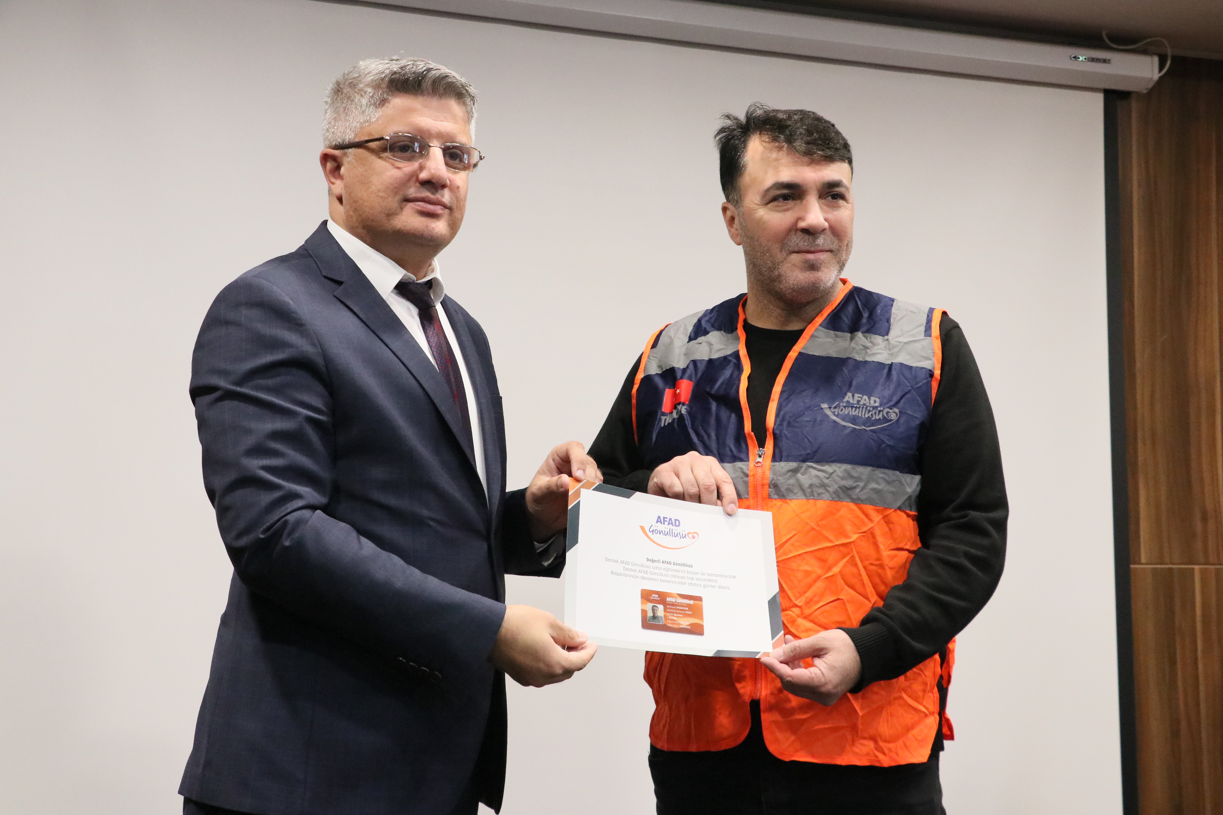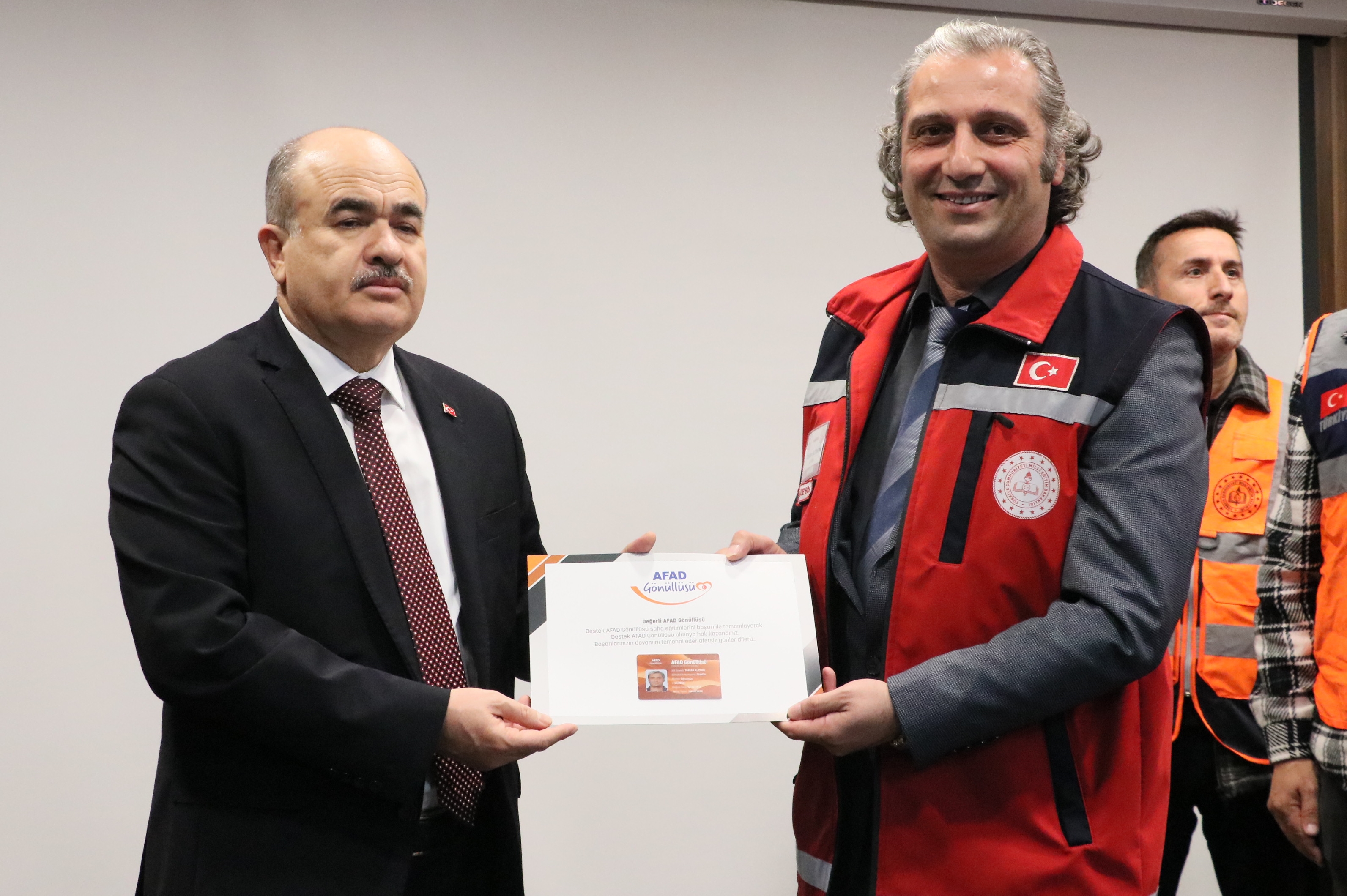 Konuşmaların ardından Destek AFAD Gönüllüsü 24 öğretmene belgeleri ve afet acil durum çantaları verildi.