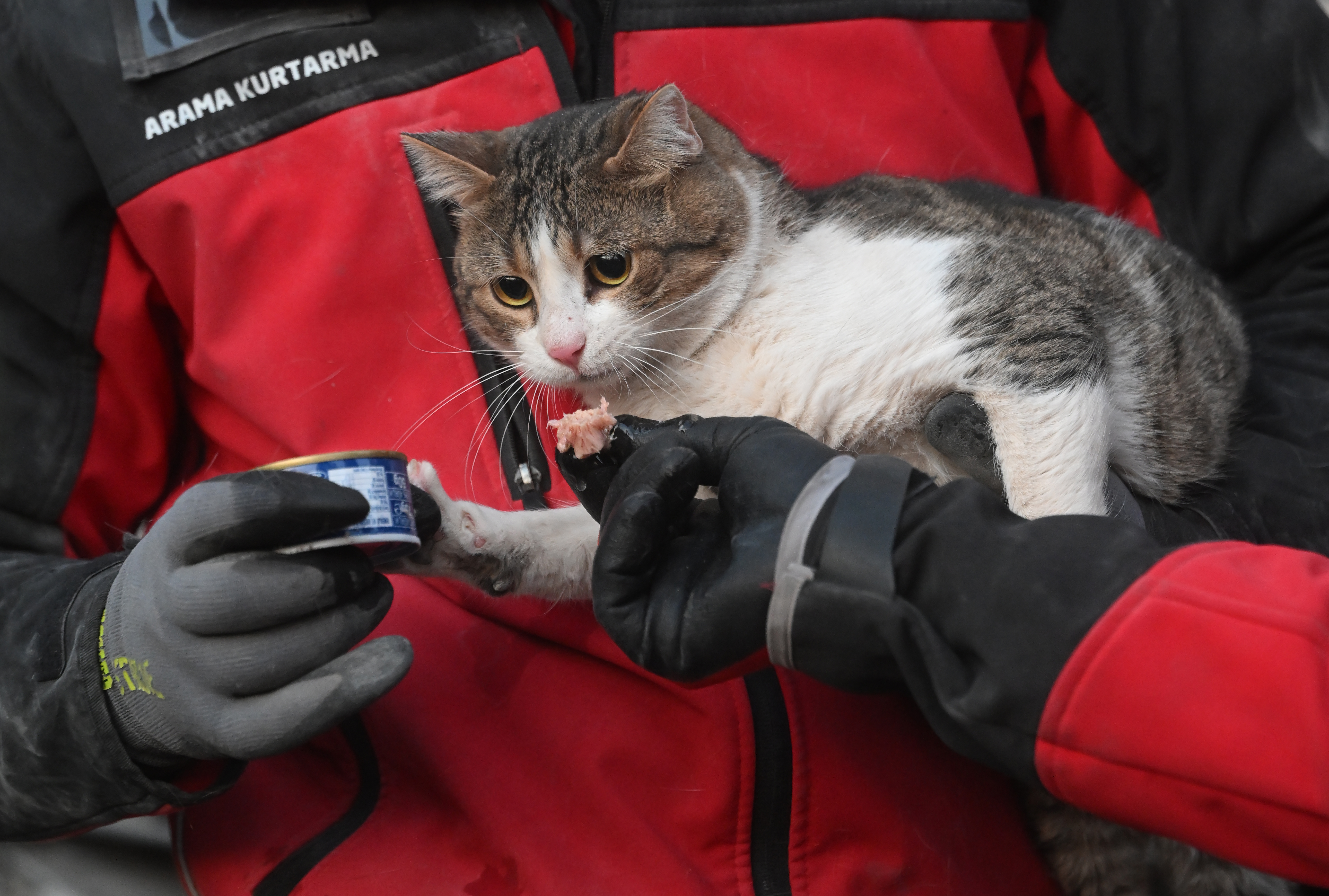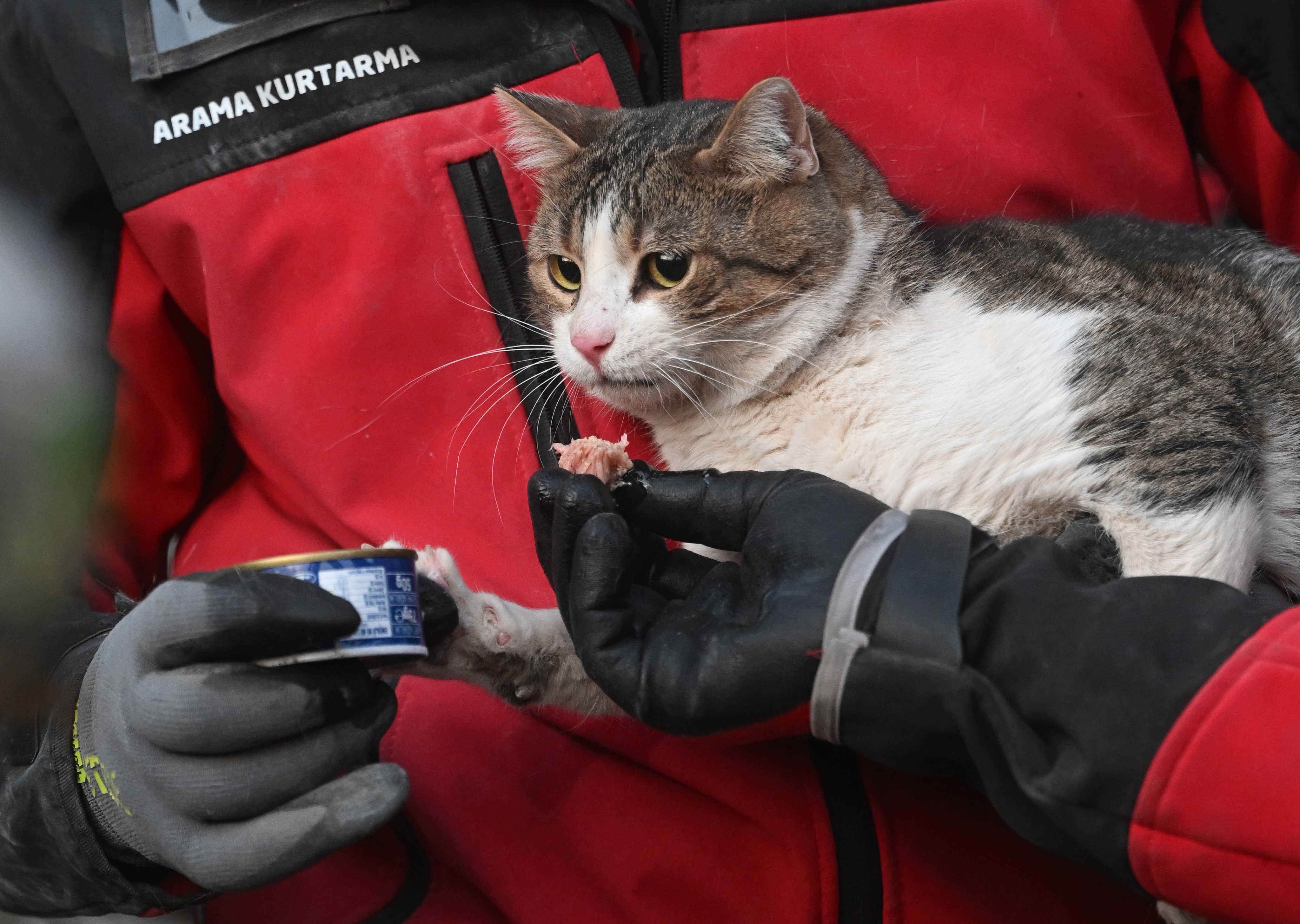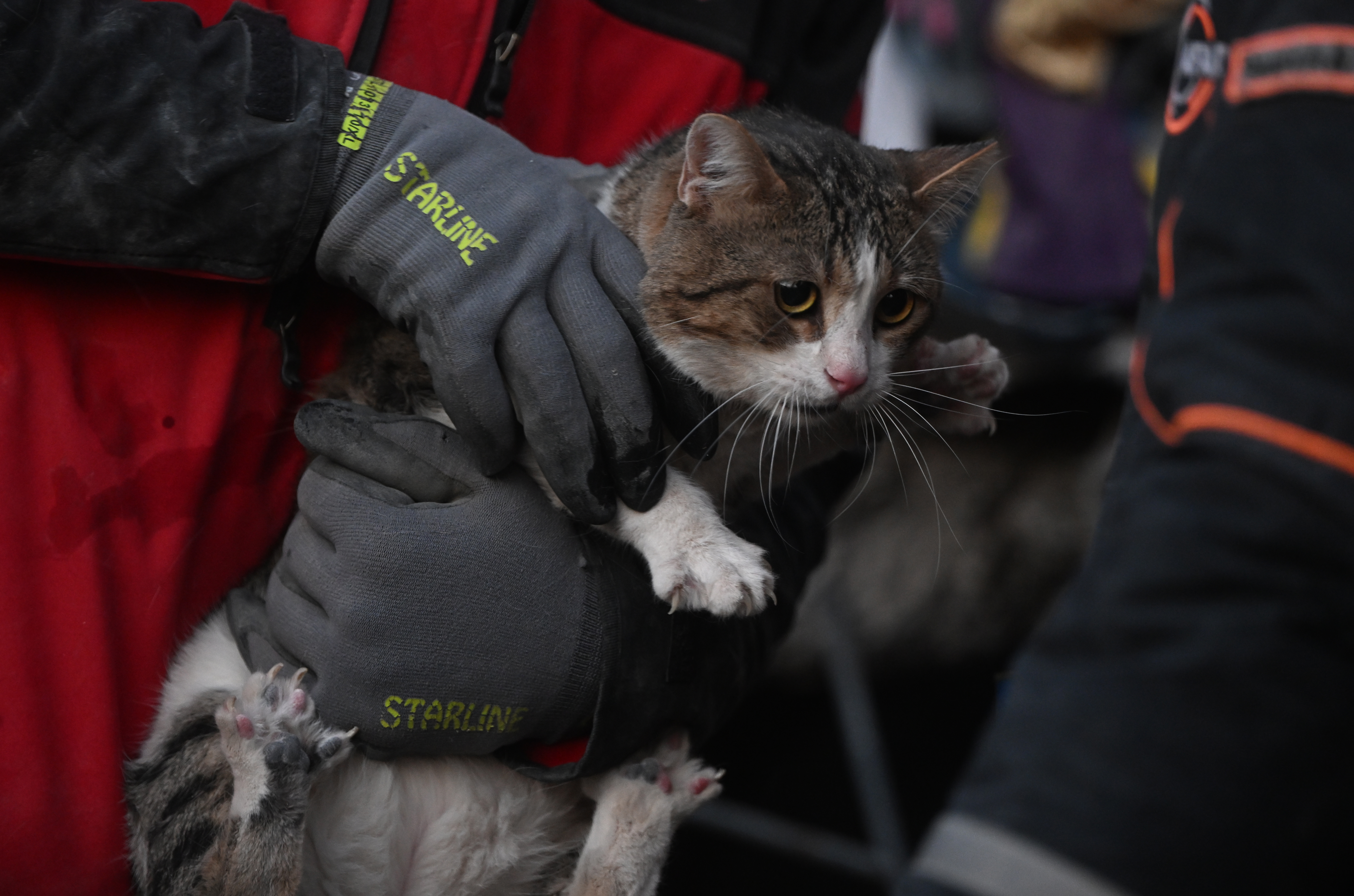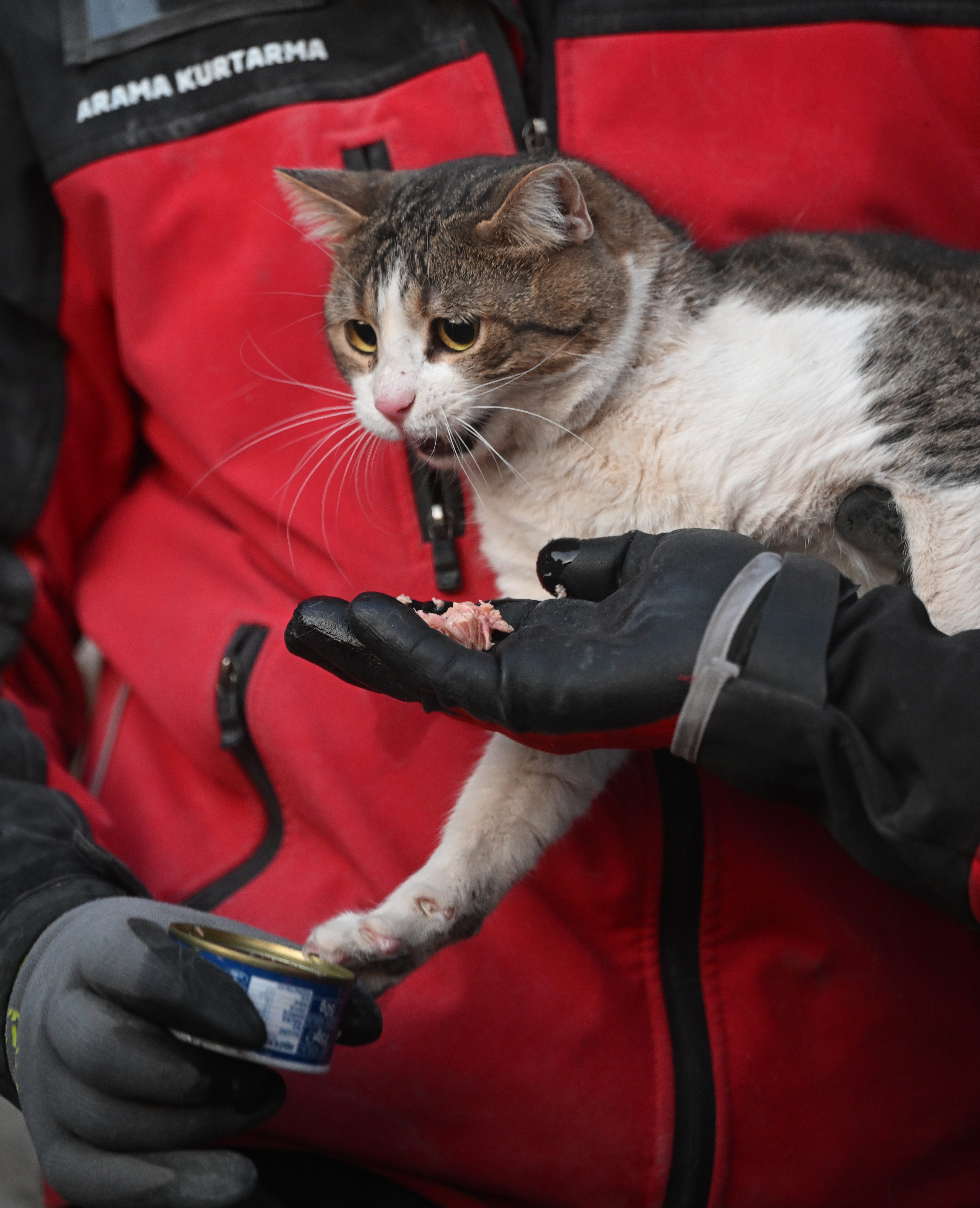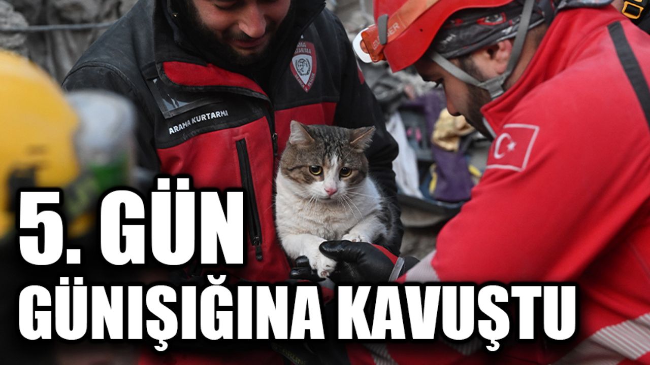 Kahramanmaraş'ta meydana gelen 7,7 ve 7,6 büyüklüğündeki depremler nedeniyle yıkılan binalarda arama kurtarma çalışmaları devam ediyor. Depremin 5. gününde arama kurtarma ekipleri enkazdan bir kedi çıkardı.
