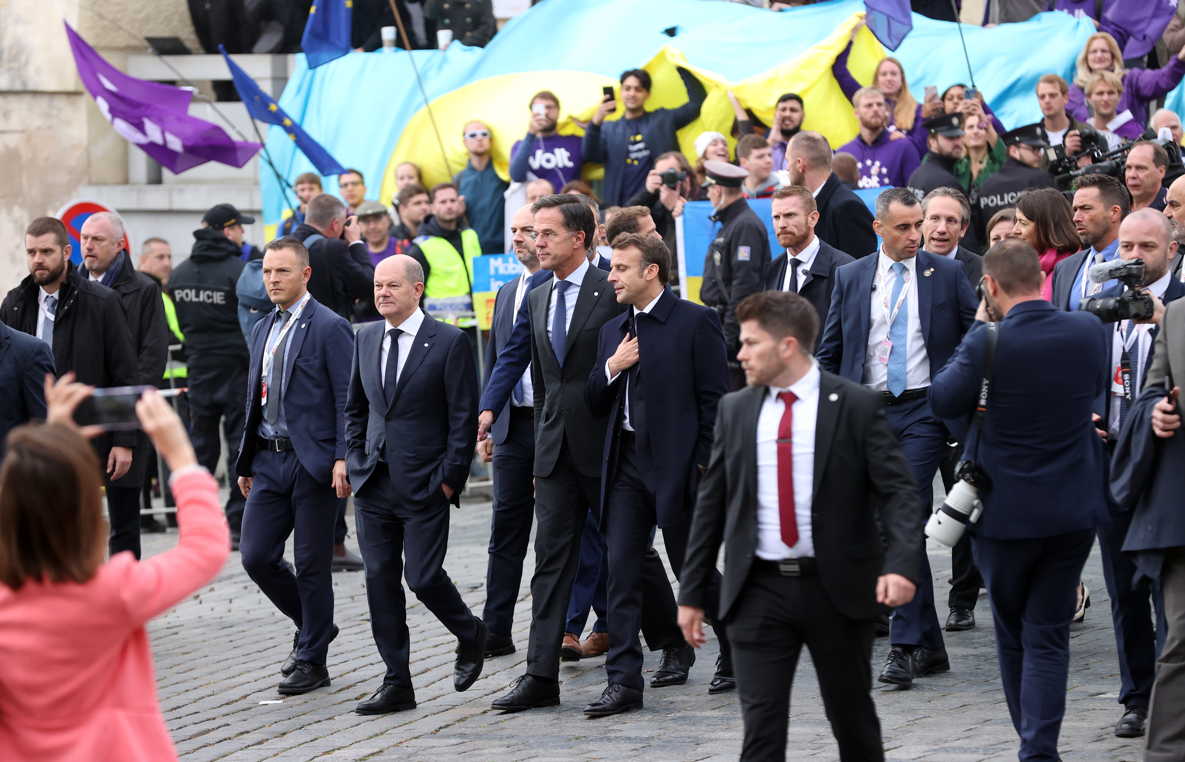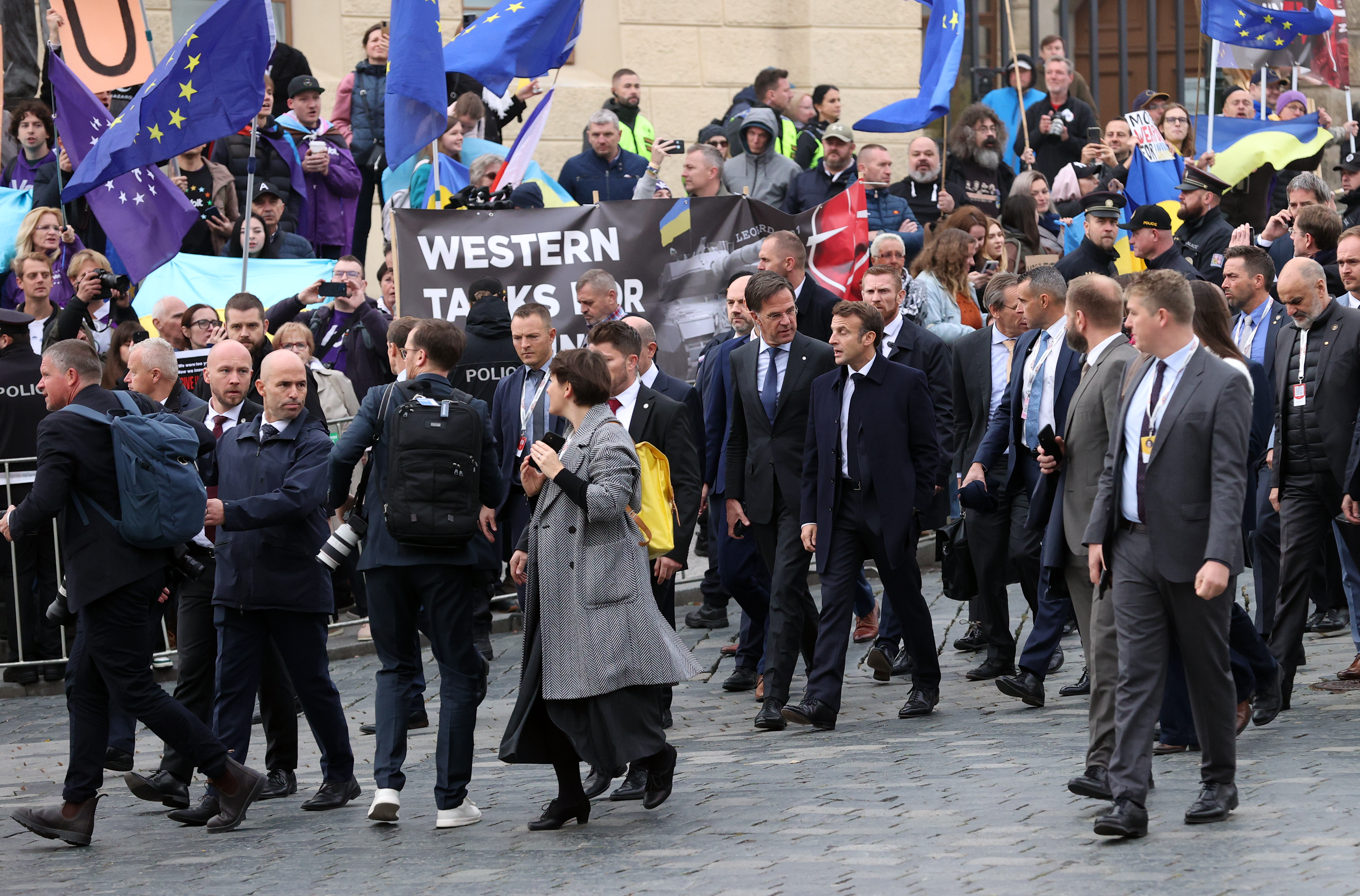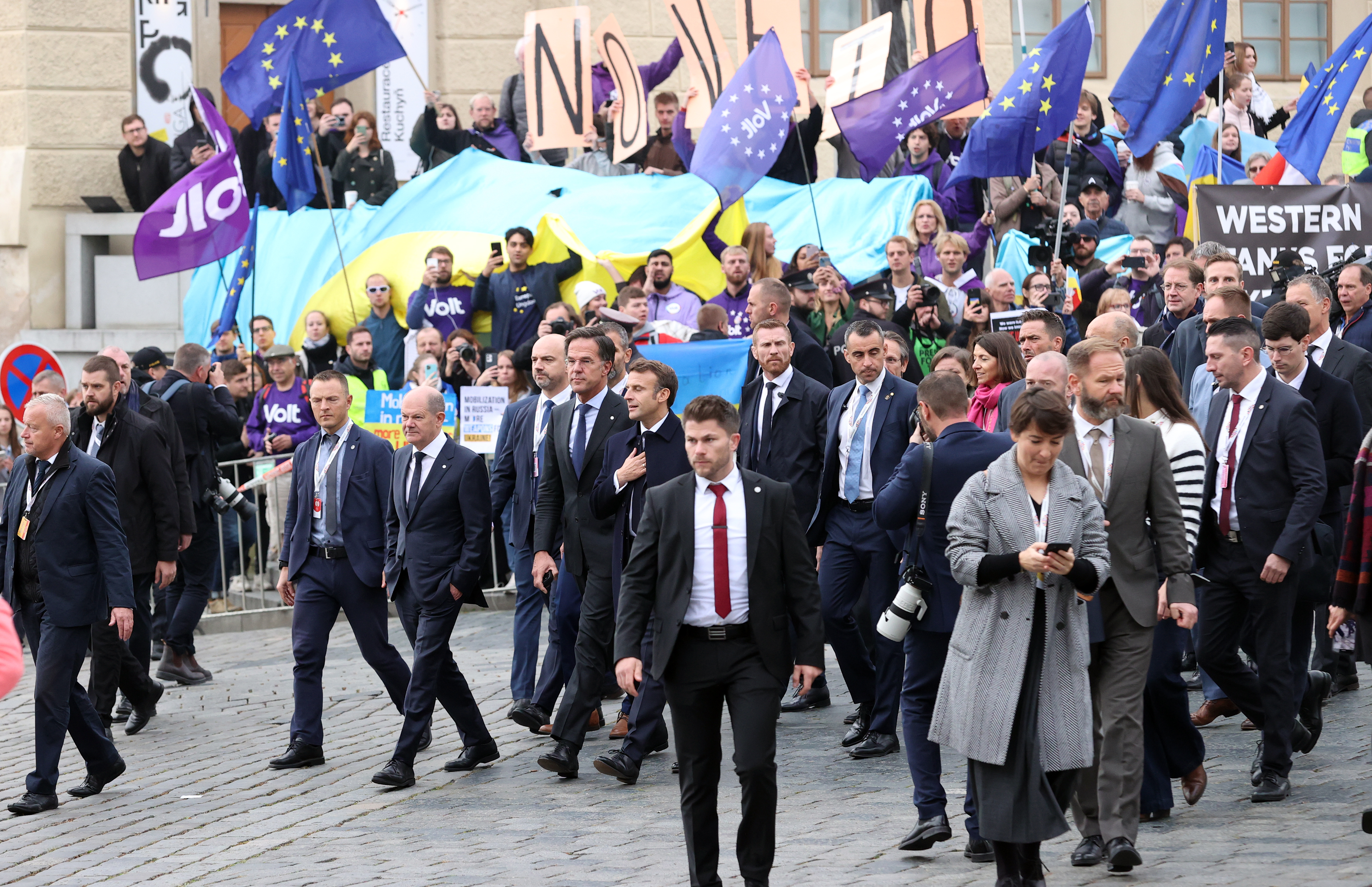 Fransa Cumhurbaşkanı Emmanuel Macron, Almanya Başbakanı Olaf Scholz ve Hollanda Başbakanı Mark Rutte, zirve toplantısı için Prag Kalesi'ne gelirken kısa bir süre göstericilerin yanına uğradı.