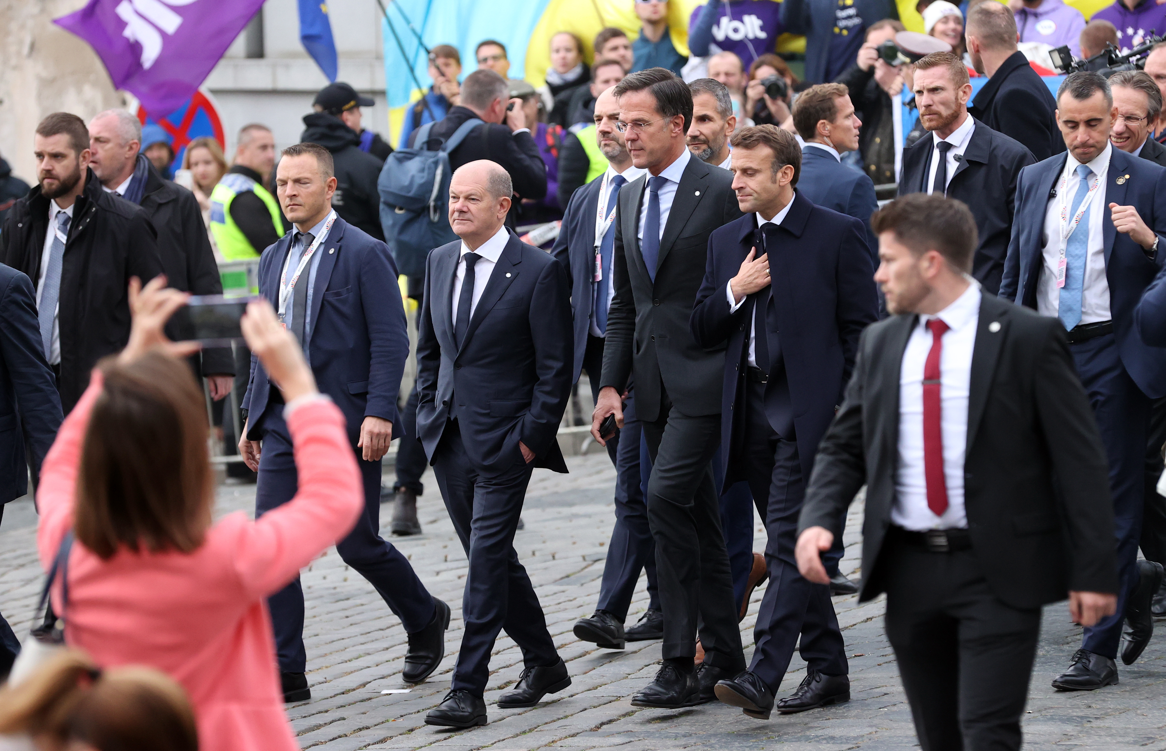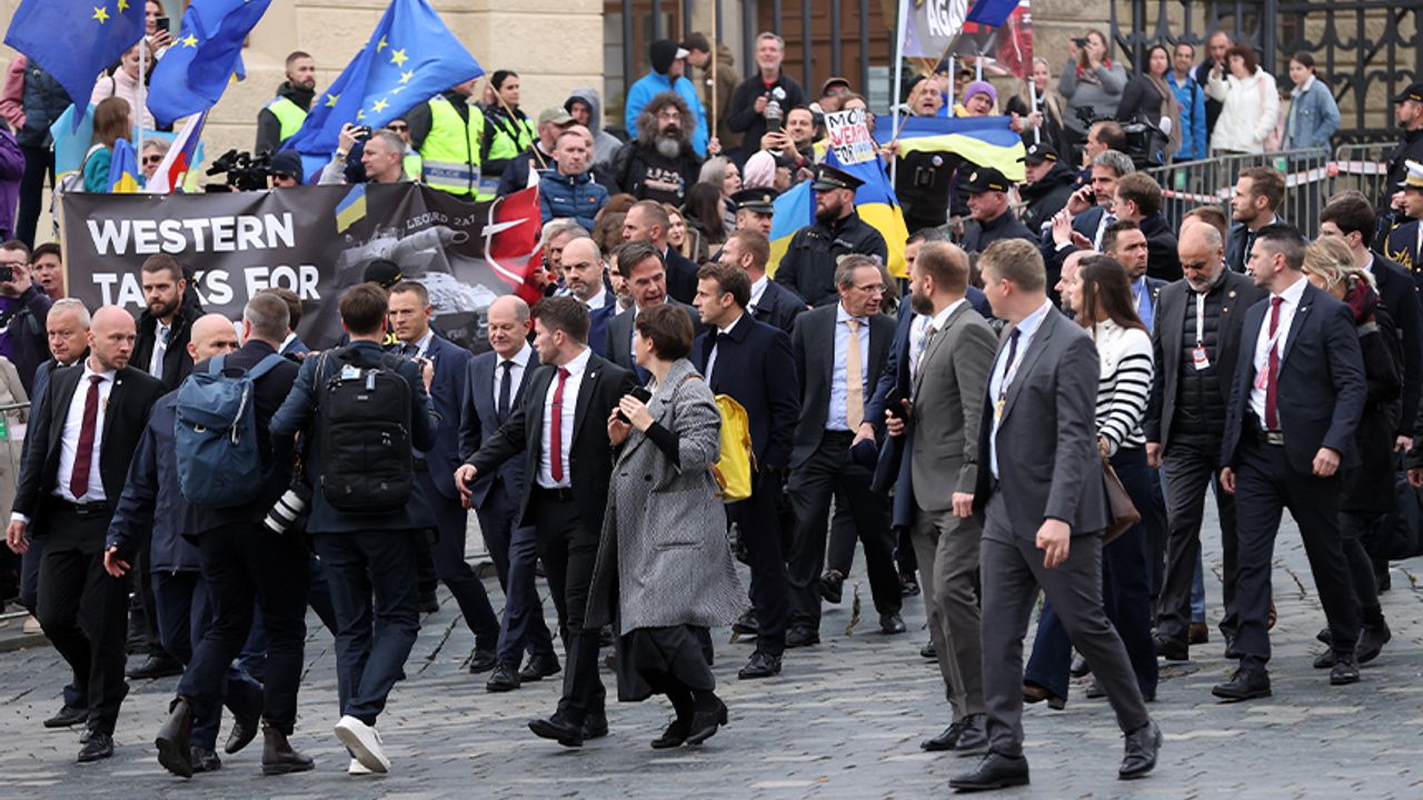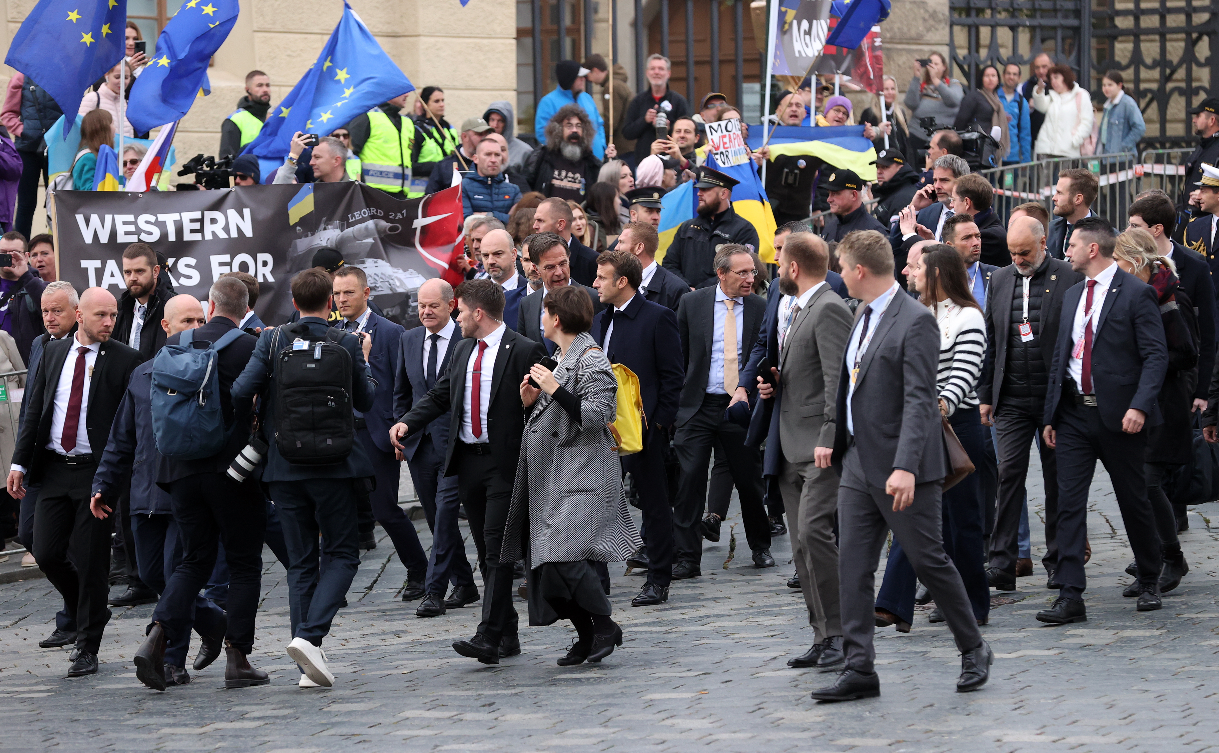 Fransa Cumhurbaşkanı Emmanuel Macron, Almanya Başbakanı Olaf Scholz ve Hollanda Başbakanı Mark Rutte, zirve toplantısı için Prag Kalesi'ne gelirken kısa bir süre göstericilerin yanına uğradı.