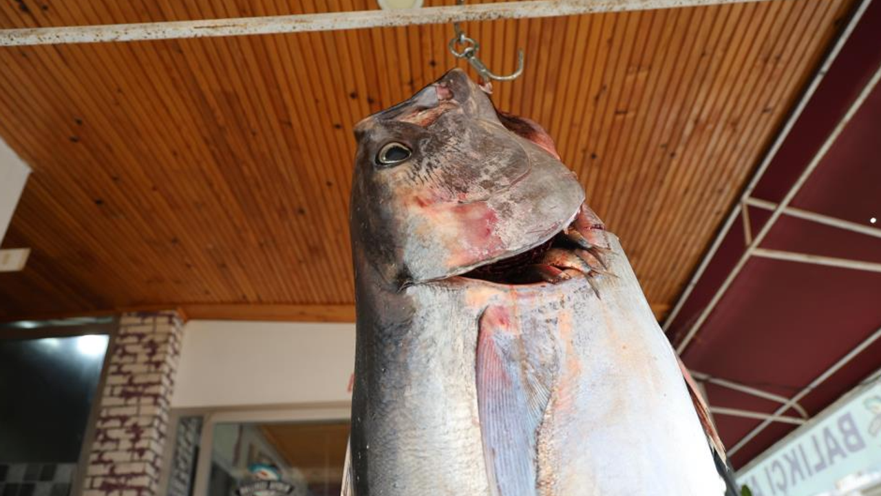 Kozan'da balıkçı Aydın Beştepe, 55 kilogram ağırlığında 1 metre 75 santimetre büyüklüğünde yakaladığı orkinos cinsi balığı dükkanının girişine astı.