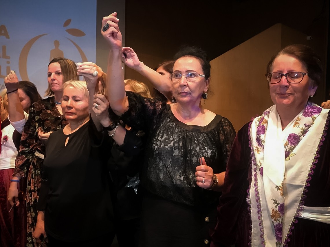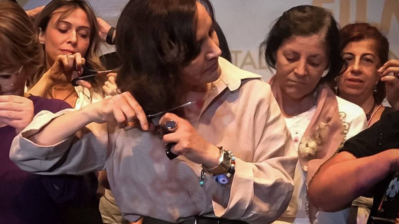 Yönetmen ve oyuncular söyleşi bitiminde “Hepimiz Mahsa Aminiyiz” diyerek ellerine aldıkları makaslarla saçlarını kestiler, izleyiciler ise ekibe alkışlayarak destek verdi.