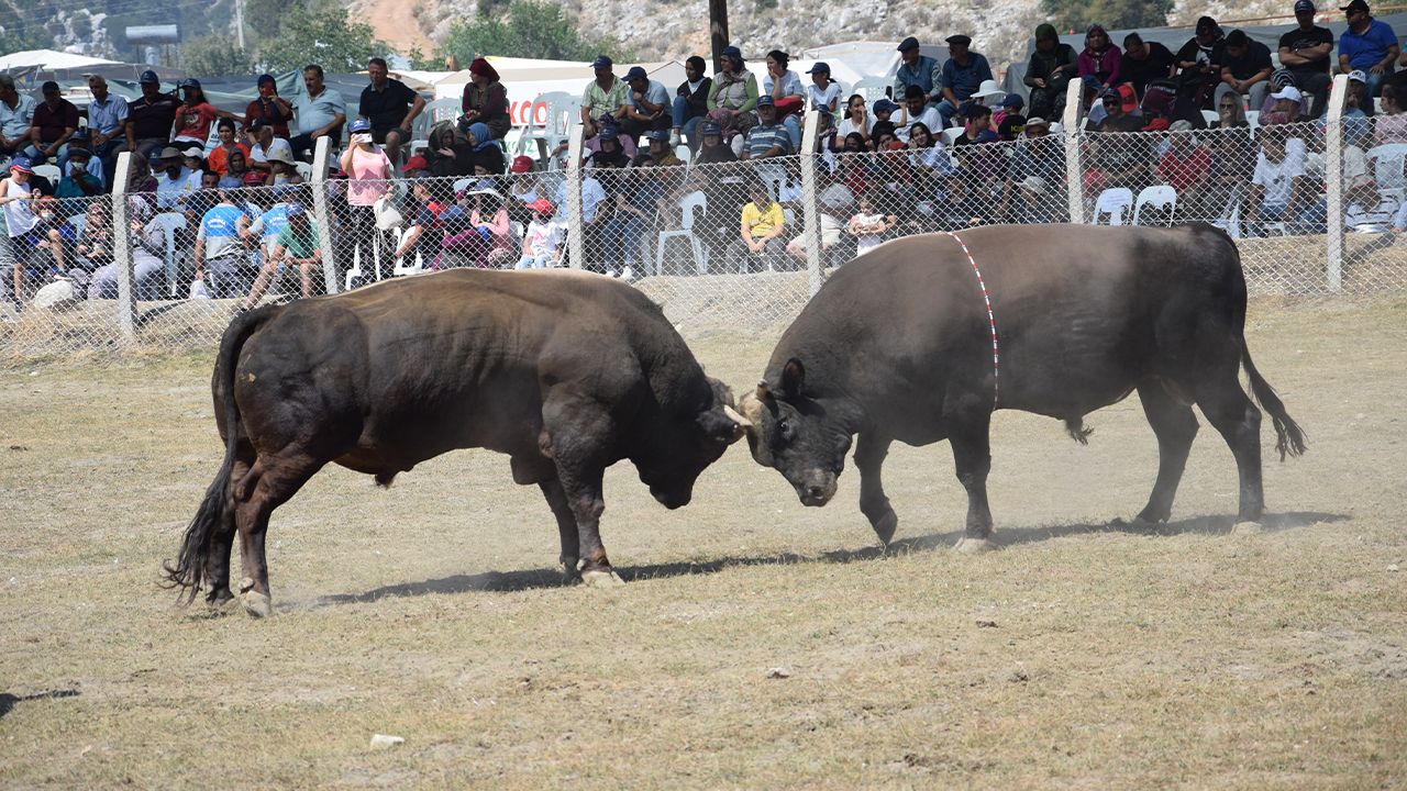Boğa güreşlerine Muğla ve Aydın yöresinden 40 güreş boğası katıldı. Şampiyon boğalar, rakip boğalara üstünlük sağlamak için çetin mücadeleler verdi.