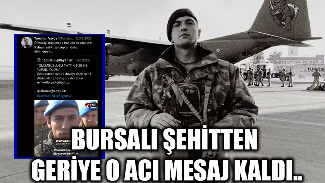 27 yaşındaki Bursalı şehit Tunahan Yavuz ise Şehit Abdullah Taha Koç'un şiiri okuduğu videoyla birlikte sosyal medya hesabında "Ölmezliği düşünmek boşuna bir emektir, kahramanlık saldırıp bir daha dönmemektir" yazarak paylaşırken şehitten geriye o acı mesaj kaldı.