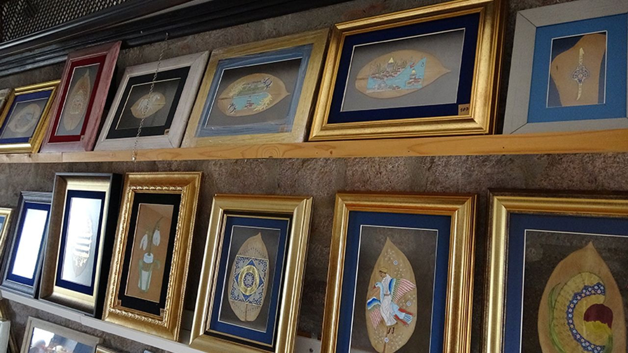 “Çalışmalarda Assos Ören Yeri’ni, Çanakkale Savaşları’yla alakalı olarak Şehitler Abidesi ve Seyit Onbaşı’yı işliyorum. Çalışmaya göre süresi değişiyor. Önce tasarım aşamasını yapıyorum, sonra boyayarak ürünü ortaya çıkarıyorum. Bu yaklaşık 2-3 ayımı alıyor. Kendi karışımlarımı ve kendi renklerimi kullanıyorum. Çalışmalarda 22 ayar altın kullanıyorum. Bu yaprak yumuşak bir yapıya sahip, yaprakta damar da çok az. Pürüzsüz bir yapıya sahip olduğu için boyamak daha kolay oluyor. O yüzden difenbahya yaprağını tercih ediyorum.”