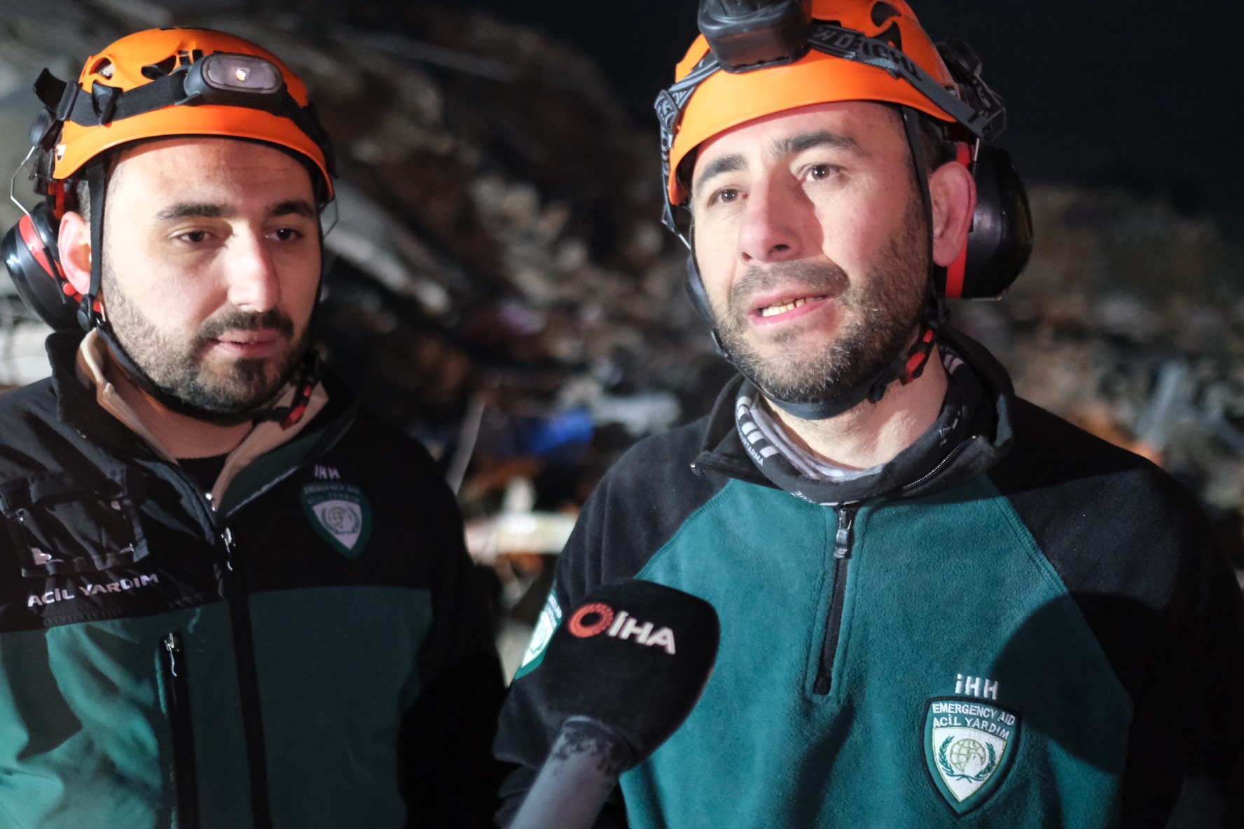 Gönüllü olarak arama kurtarma çalışmalarına katılan Serkan Temur ve Mücahit Edkü, büyük sevinç yaşadıklarını dile getirerek, “Tarifi mümkün değil. Çok duygulandık, 3 günden beri çalışma yapıyoruz. Diğer enkazlardan vefat eden insanlar çıkardık. 72 saat sonra bir son salise sesli arama yaparken iki can kurtardık. Buradaki insanları çıkarmanın mutluluğunu yaşıyoruz. Çok büyük bir acı, bunun yanında bunları görünce de sevinç yaşadık. Biz arama kurtarma ekibi olarak iki vefat haberini aldık. Buraya intikal ettiğimizde vefat edenleri çıkarmak için çaba harcayalım dedik. 72 saat geçmiş, kimse olmaz diye düşünmedik. Burada bir kişiyi daha kurtarmanın telaşına düştük. İnşaat etrafında son kez sesli arama yaptık. Birkaç kez sesli arama yaptık. Son sesli aramada Soner kardeşimizin son salisede diyeceğimiz inanılmaz bir şekilde sesini duyduk. Allah duyurdu. O salisede orada olduğunu öğrendik. Son saniyede duyduğumuz sesle teyit aldık, çabaladık. 3-4 saattir yoğun şekilde buradayız. Ekip olarak çalışıyoruz. Sağ salim çıkardık” dedi.