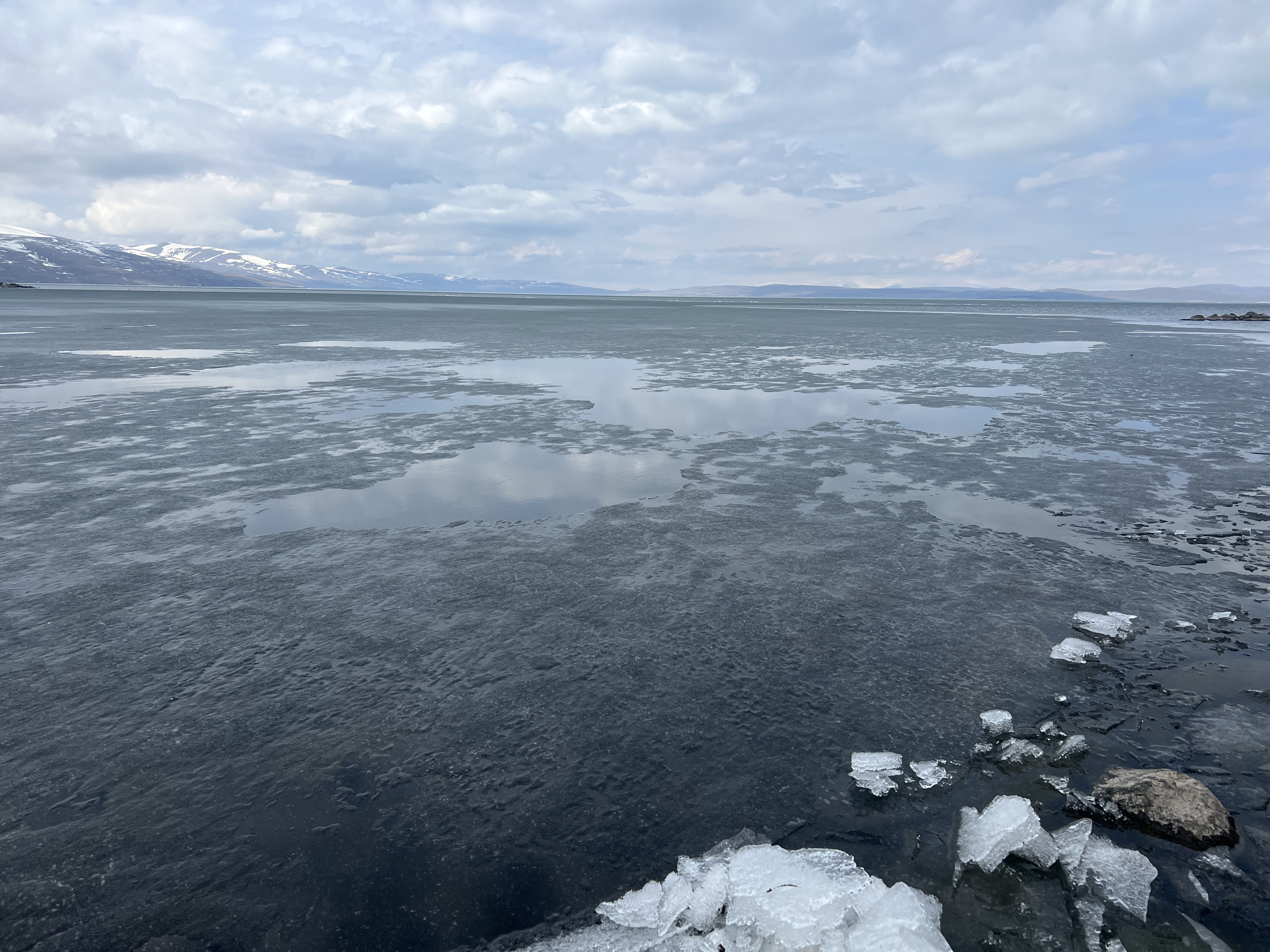 Göl yüzeyindeki donun açılmasıyla, buz parçaları kıyıya doğru vurmaya başladı.