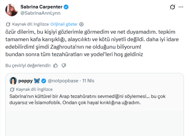 Artan tepkilerin ardından Sabrina Carpenter, sosyal medya hesabından bir açıklama yaparak geri adım attı. Ünlü şarkıcı, kimseyi kırmak istemediğini belirterek farklı kültürlere saygı duyduğunu ifade etti.