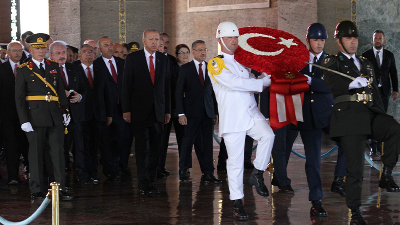Cumhurbaşkanı Erdoğan’ın, Atatürk'ün mozolesine ay yıldız motifli çelenk bırakmasının ardından saygı duruşunda bulunuldu ve İstiklal Marşı okundu.