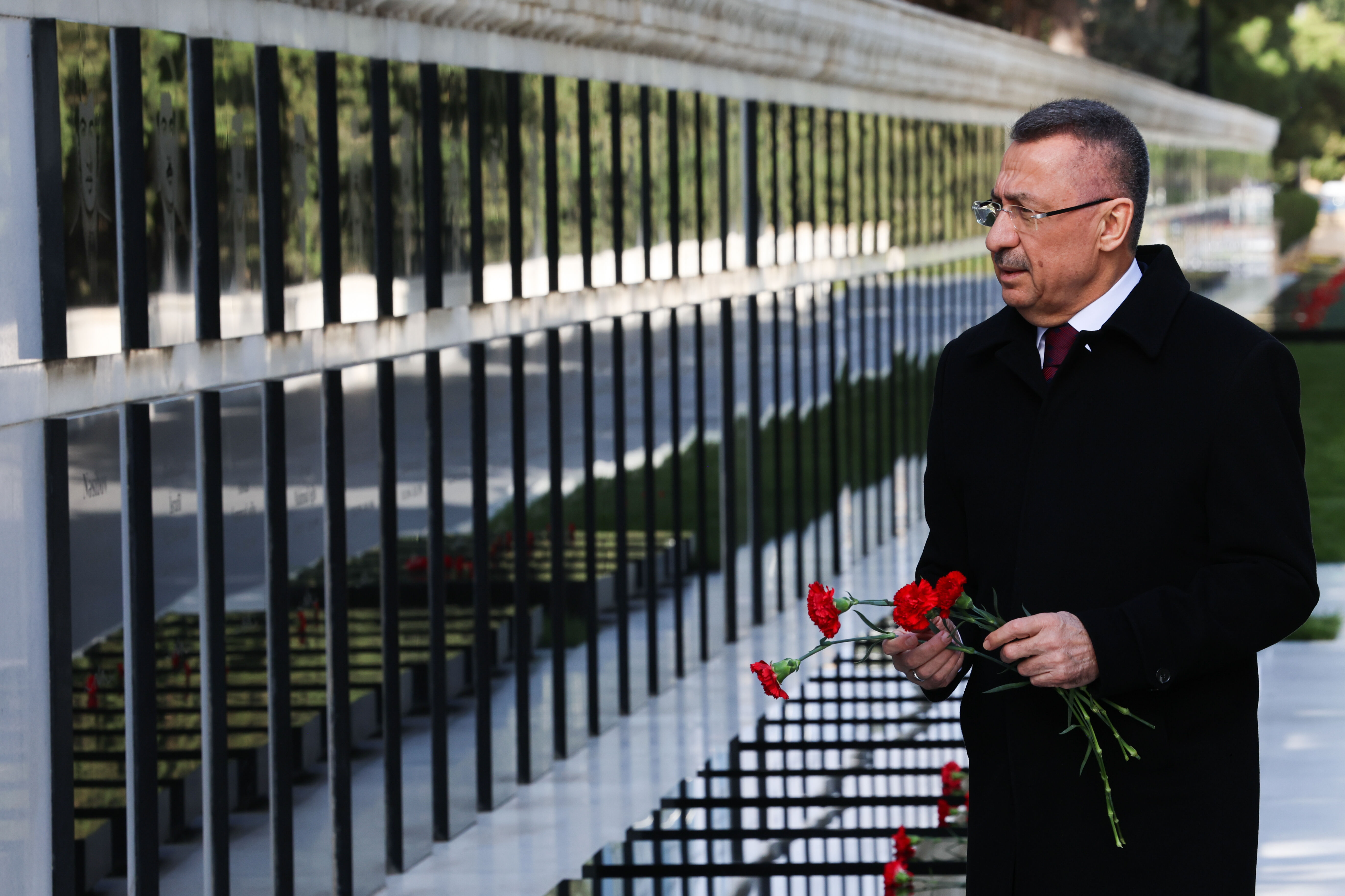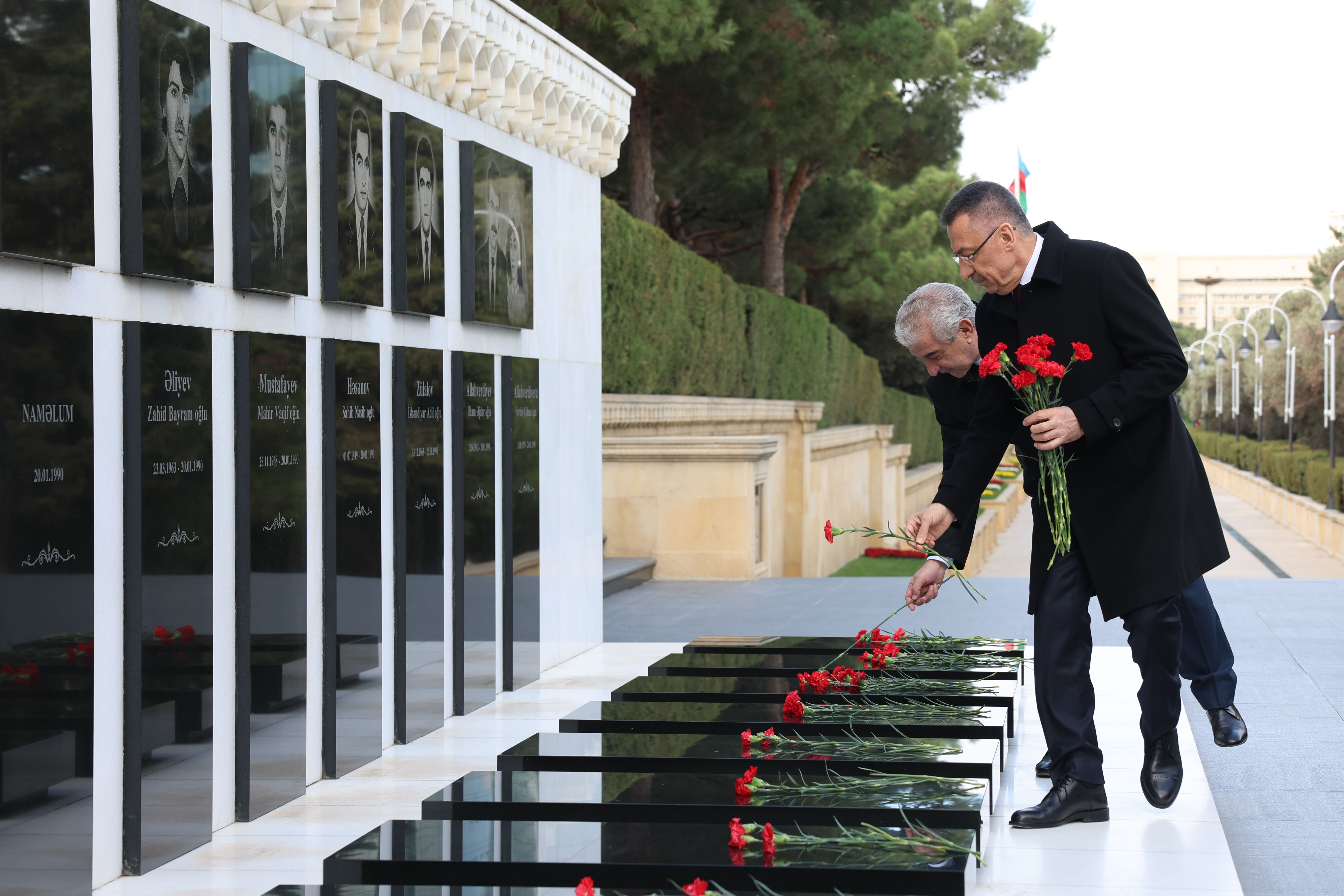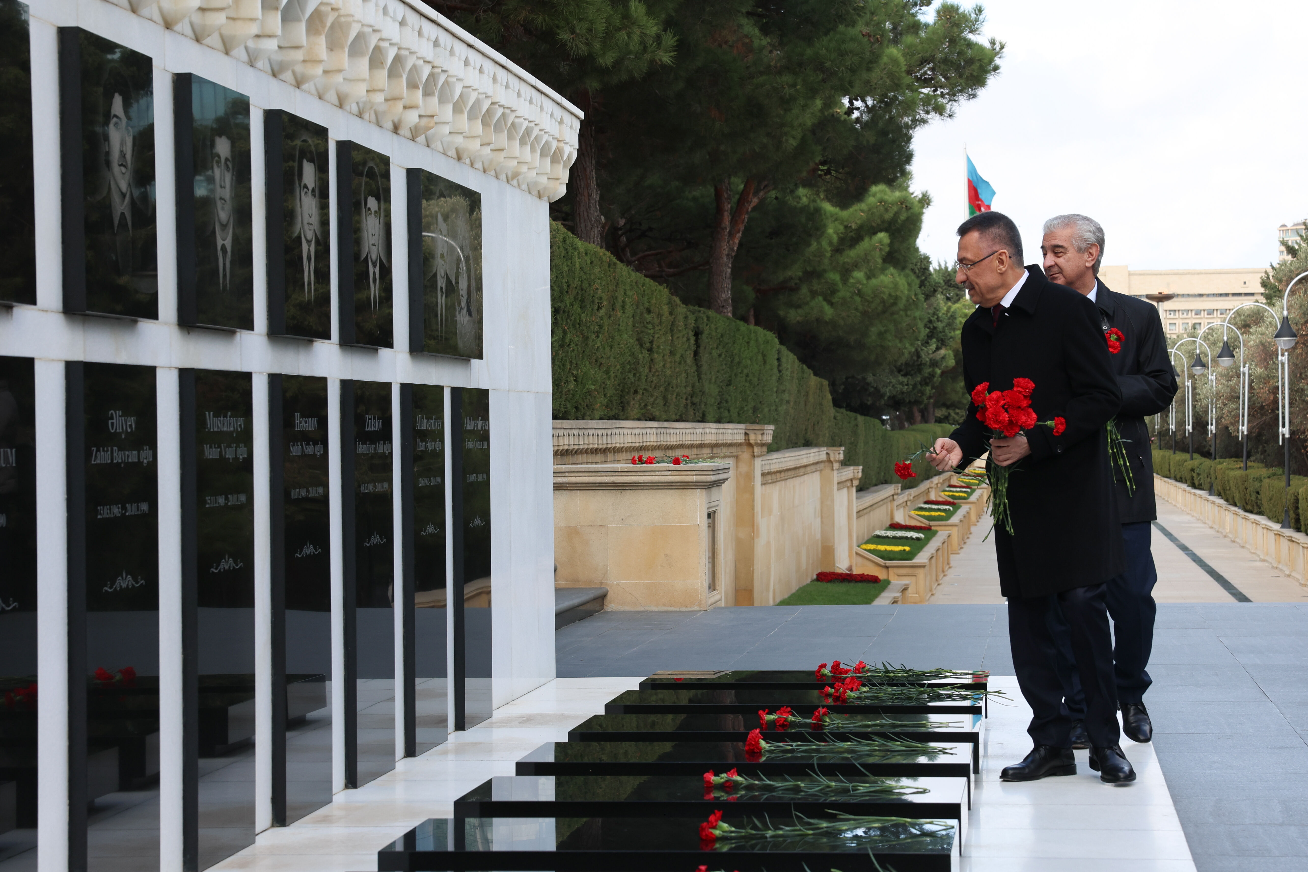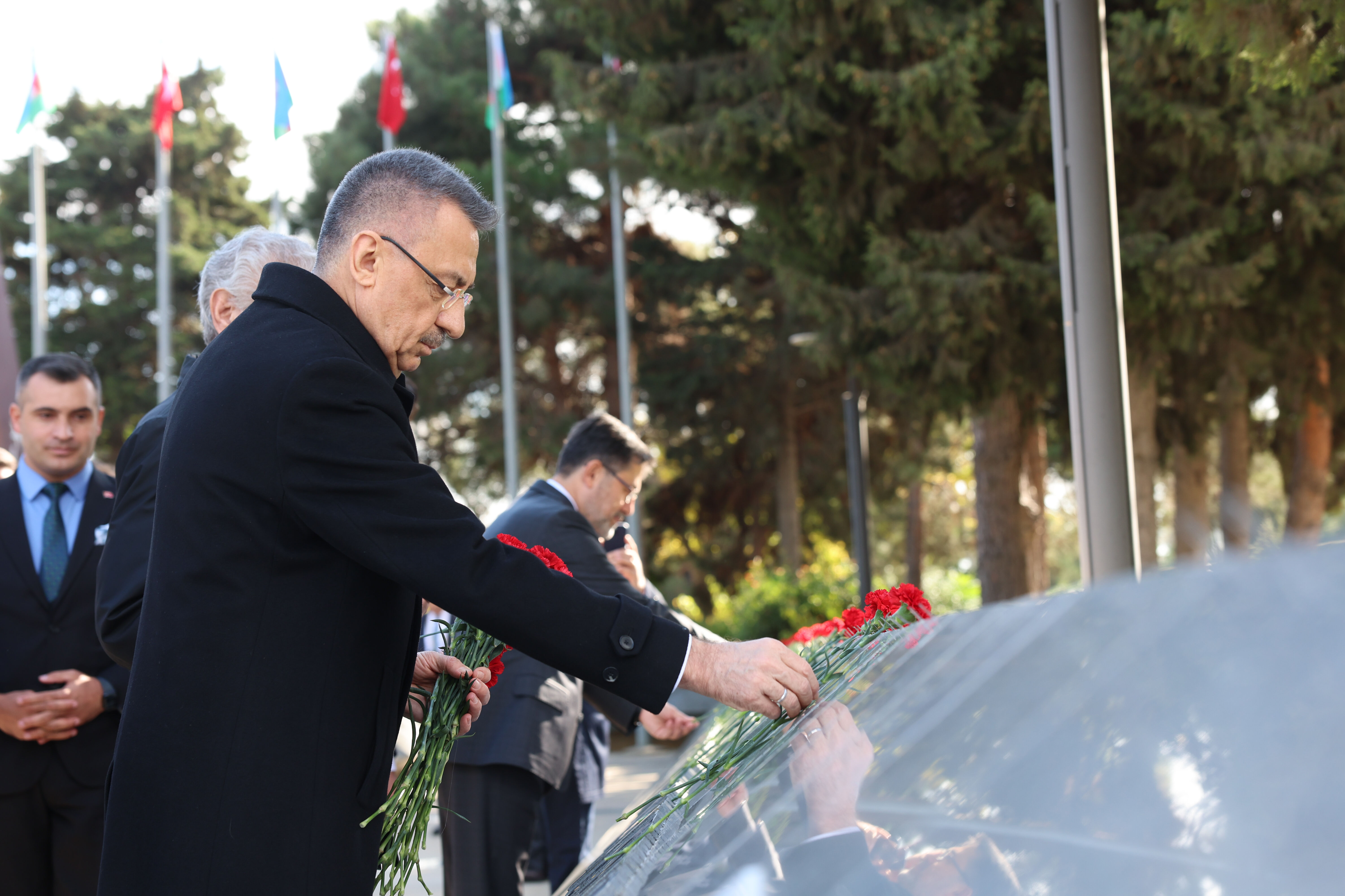 Türk ve Azerbaycan şehitliklerini de ziyaret eden Oktay, şehit mezarlarına karanfil bıraktı, dua etti.
