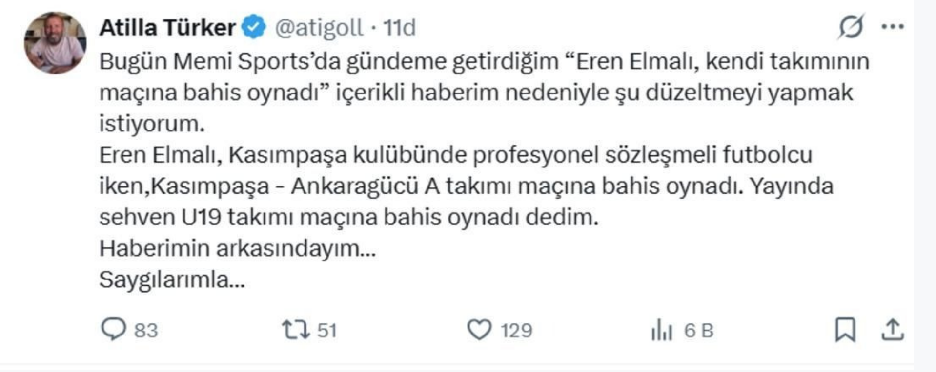 Türk futbolunda gündemi sarsan bahis iddiaları büyürken, gazeteci Atilla Türker’in Galatasaraylı futbolcu Eren Elmalı hakkında dile getirdiği iddia tartışmaları alevlendirmişti. Türker, Elmalı’nın yaklaşık 6 yıl 4 ay önce Kasımpaşa’da forma giydiği dönemde, sahada görev aldığı bir maç için bahis oynadığını öne sürmüştü.