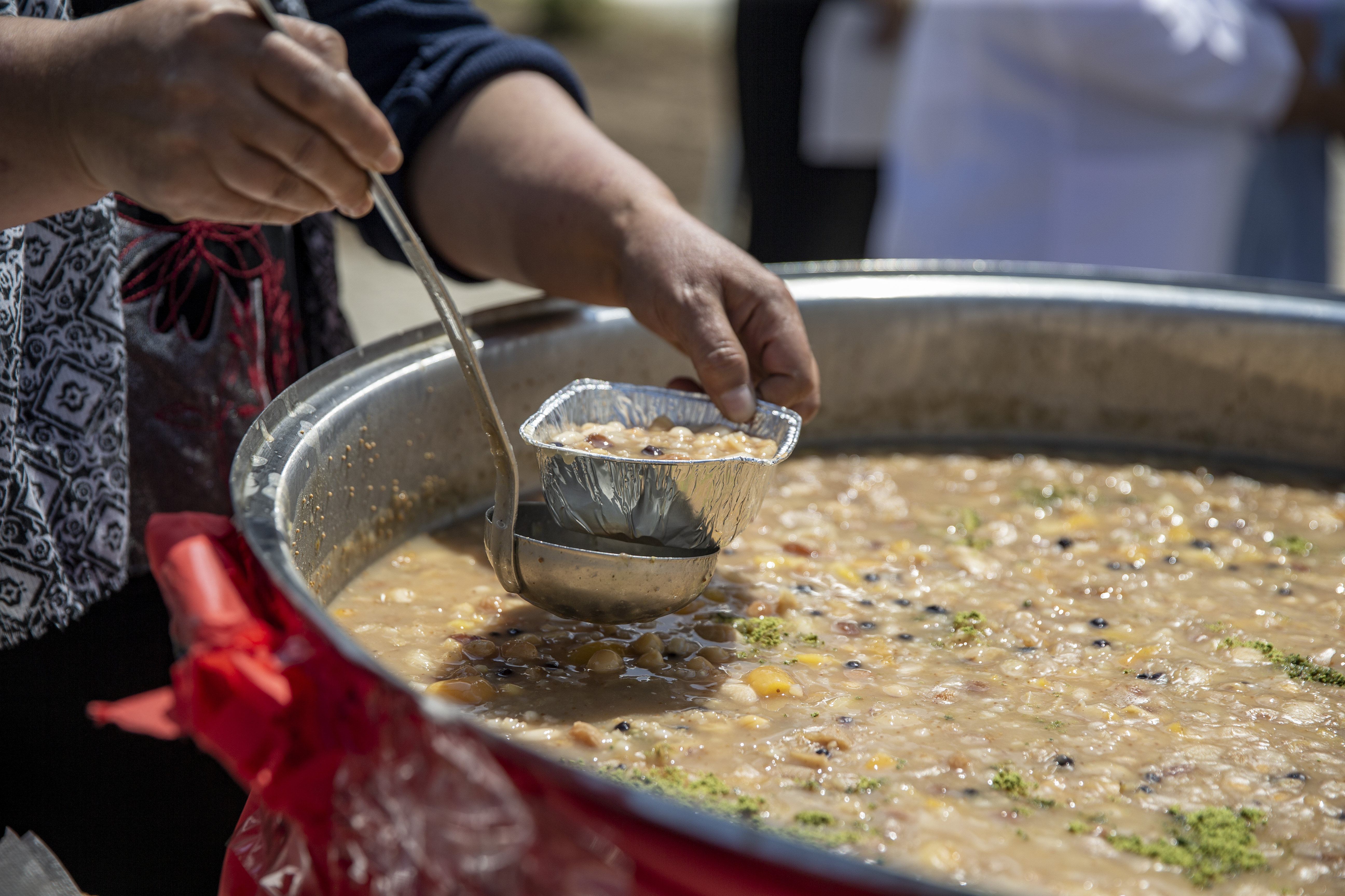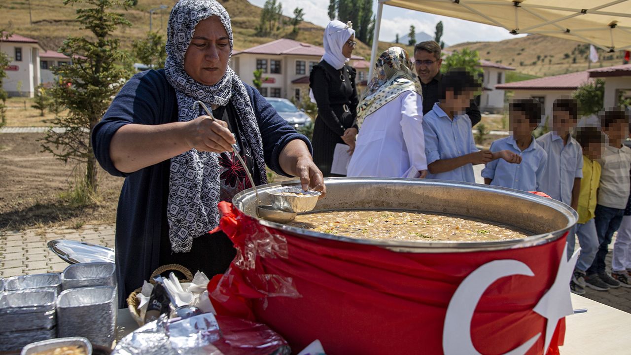Nene Hatun Çocuk Evleri Sitesi bahçesinde düzenlenen etkinlikte, çocuklar koruma evlerindeki ablalarıyla birlikte yaptıkları aşureleri, kendilerini ziyarete gelen konuklara ikram etti.