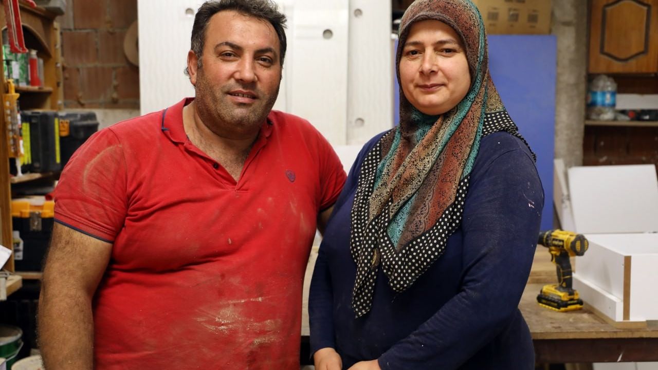 Mobilyacı eşinin çırak bulamaması üzerine bir günlüğüne yardıma giden Esra Tuncer, açtıkları atölyede eşiyle beraber mobilya, kapı ve merdiven imalatı yapmaya başladı.