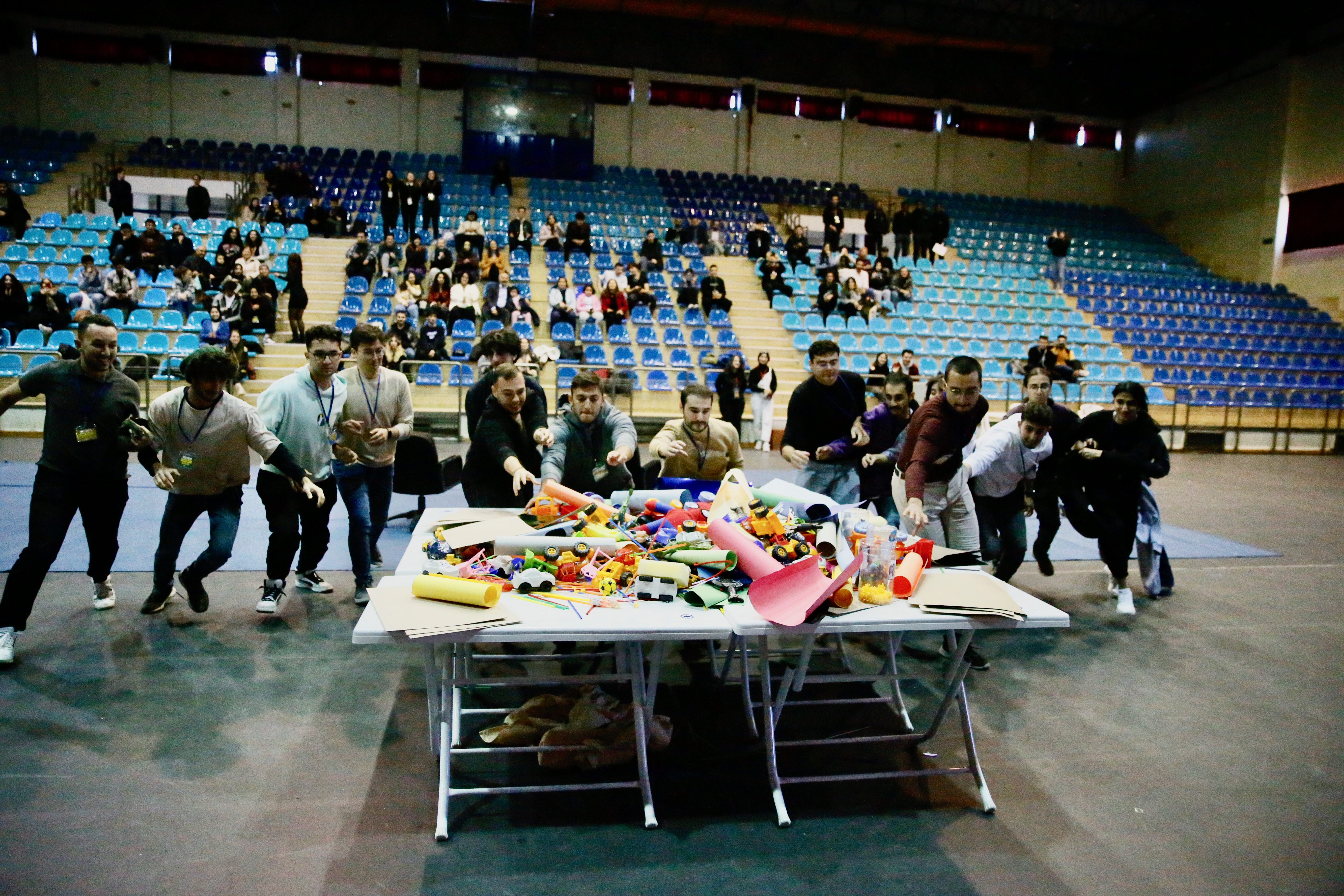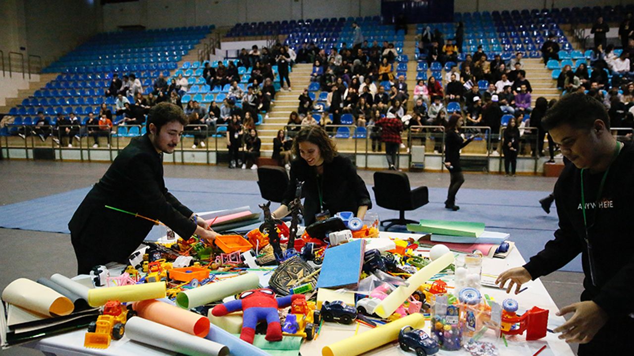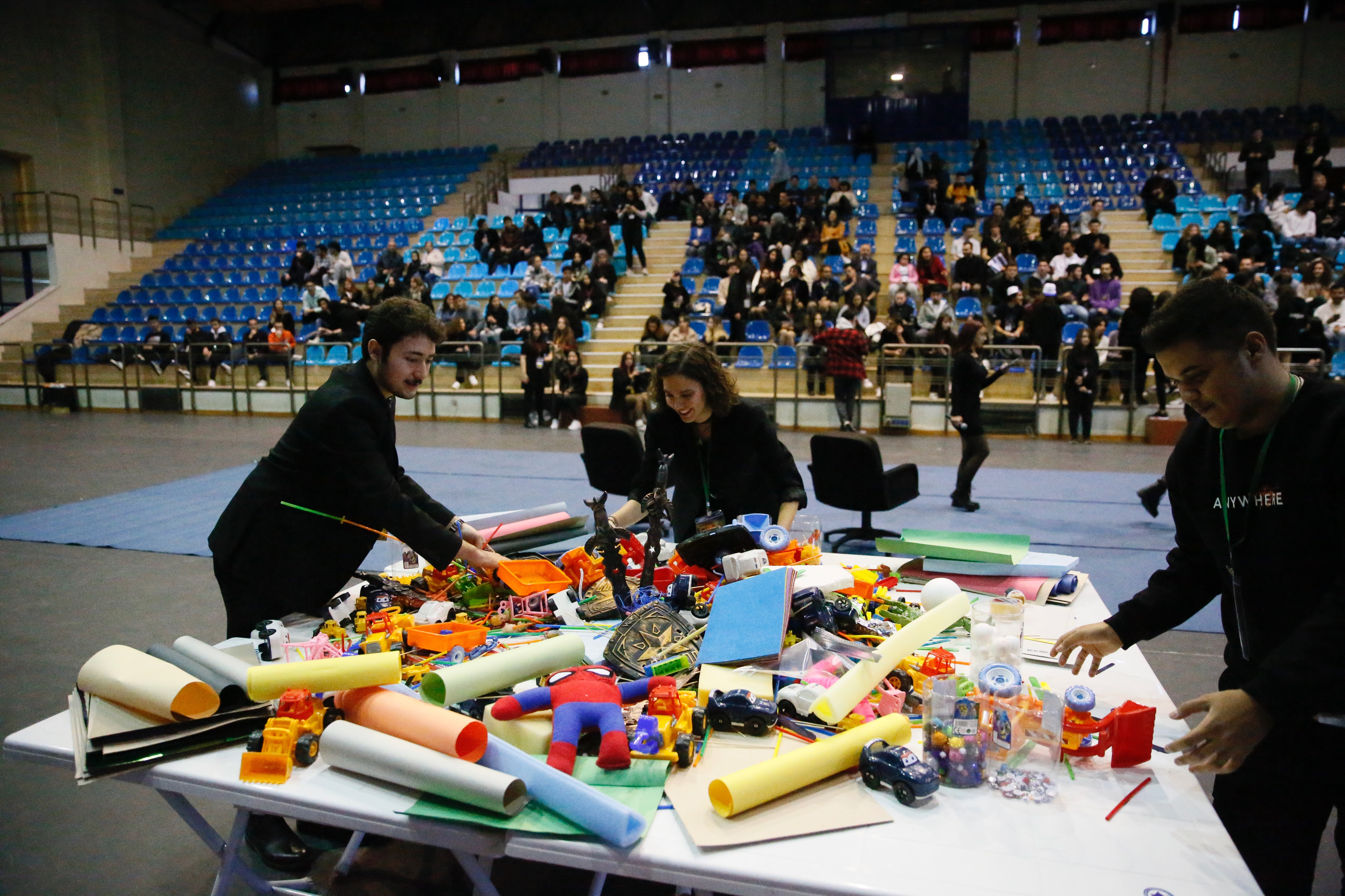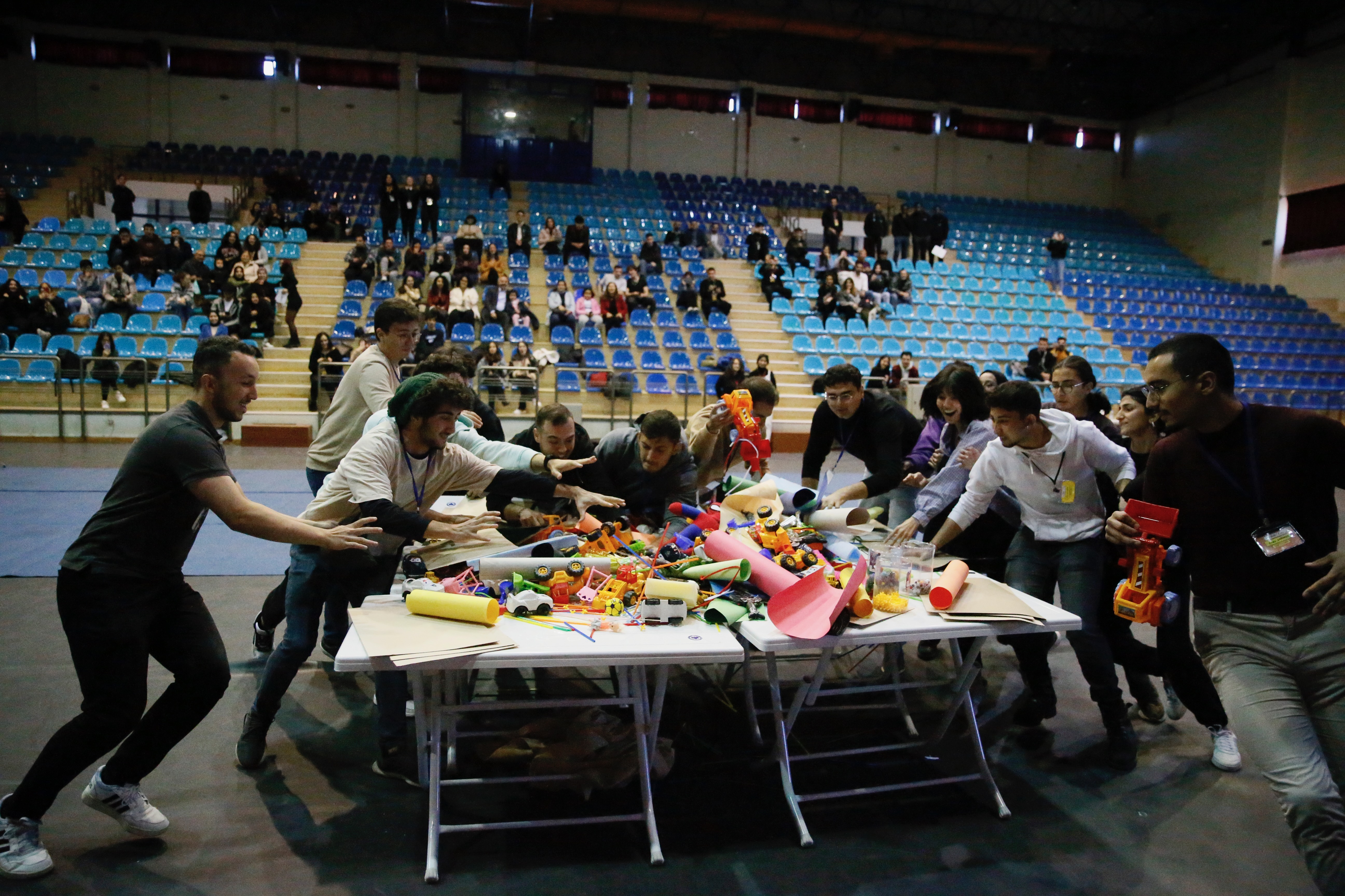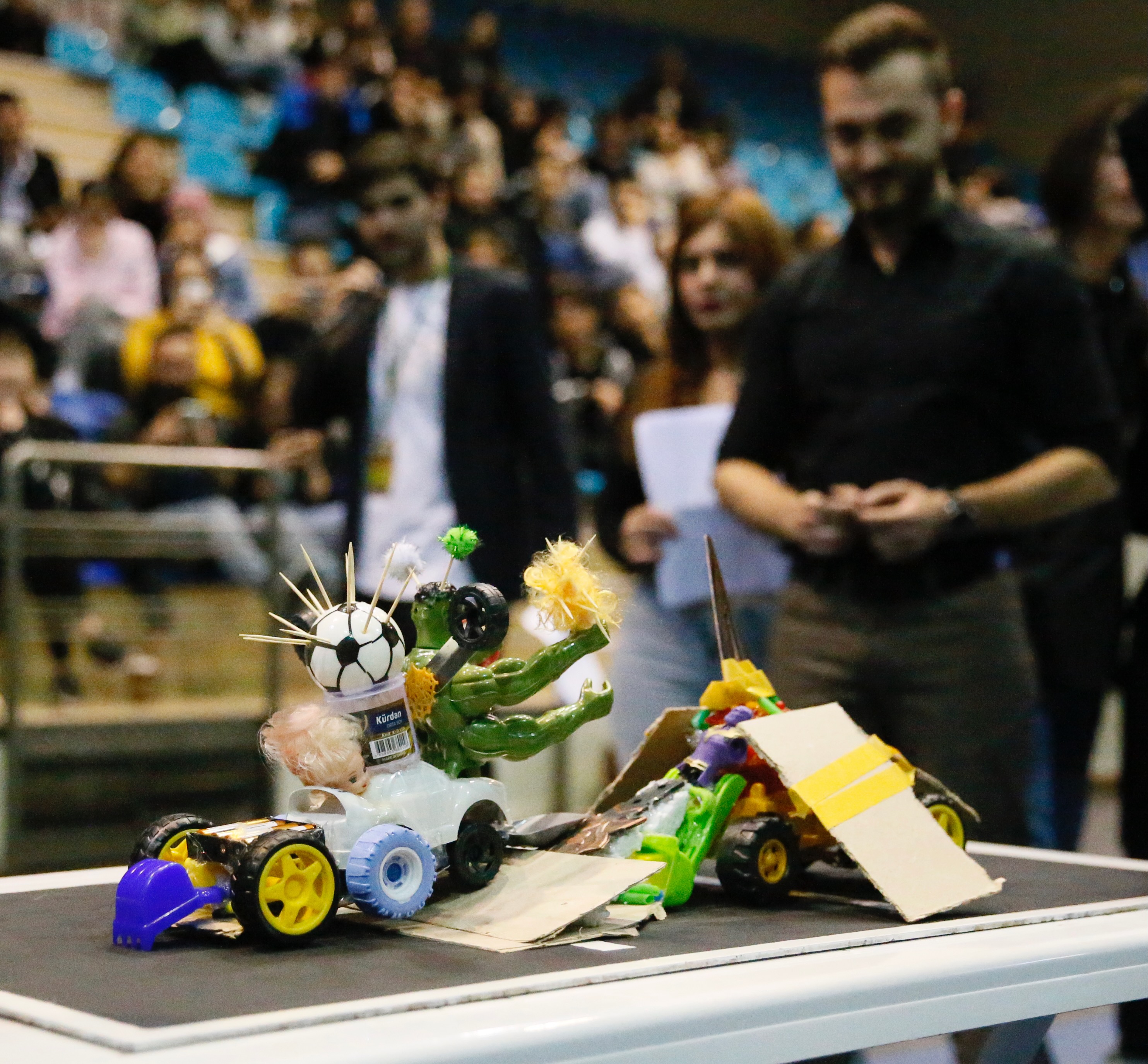 Takımlar, yarışmada robot yapmak için salon ortasına konulan masalarda aralarında hurda, oyuncak ve kağıtların olduğu malzemeleri 2 dakika içerisinde toplayıp kendi alanlarına götürdü. Öğrencilerin robot malzemeleri alabilmek için birbiriyle mücadele etti.