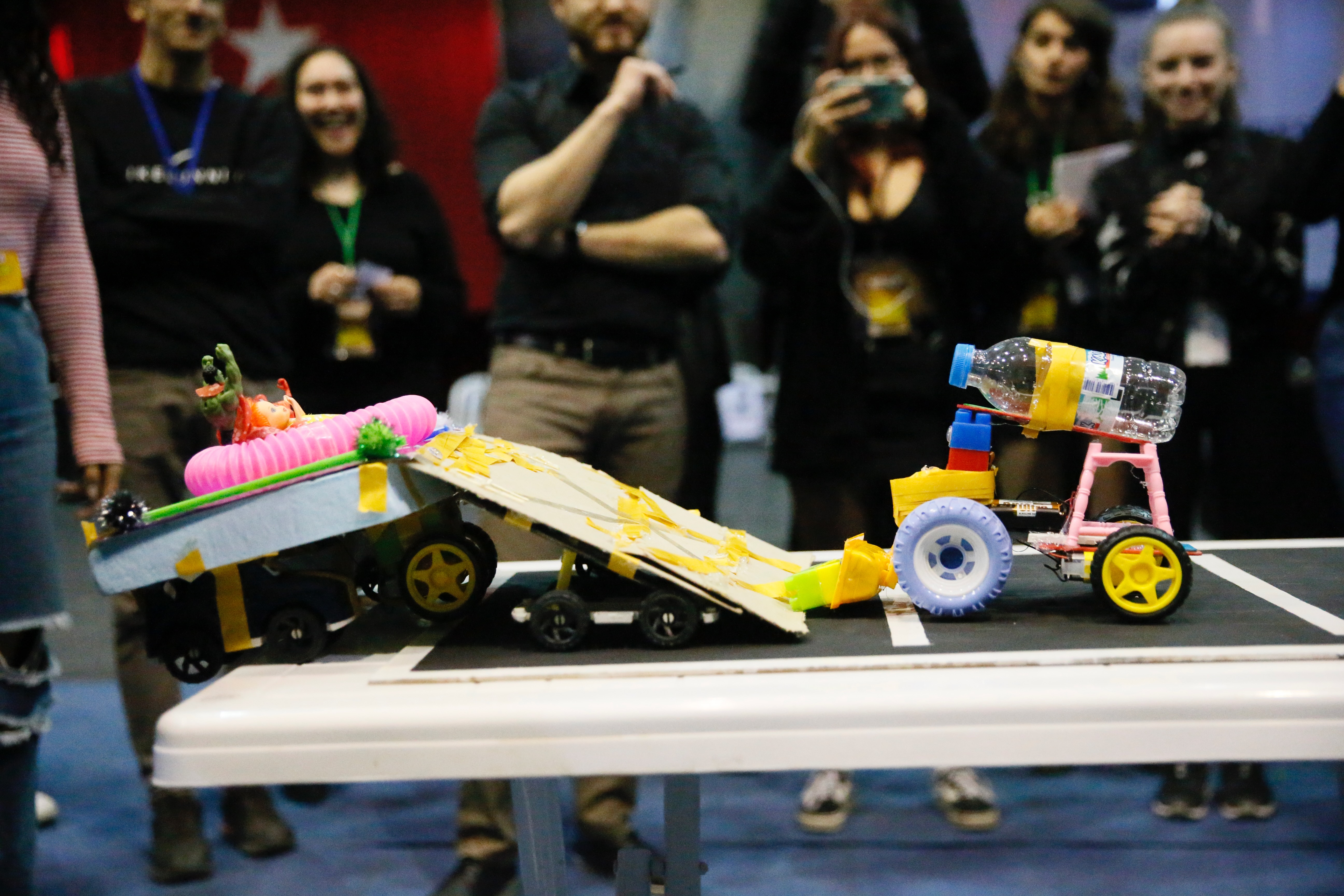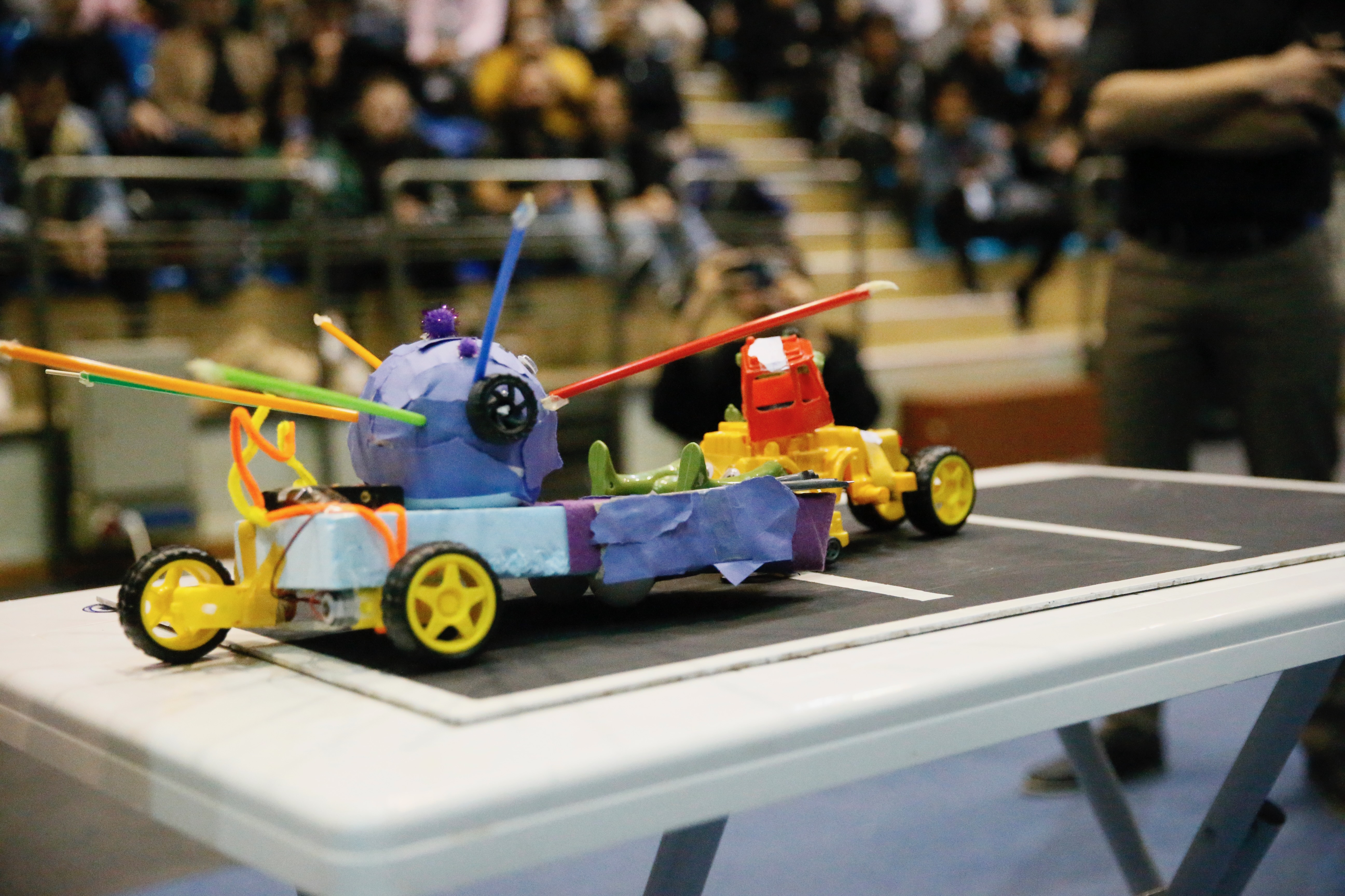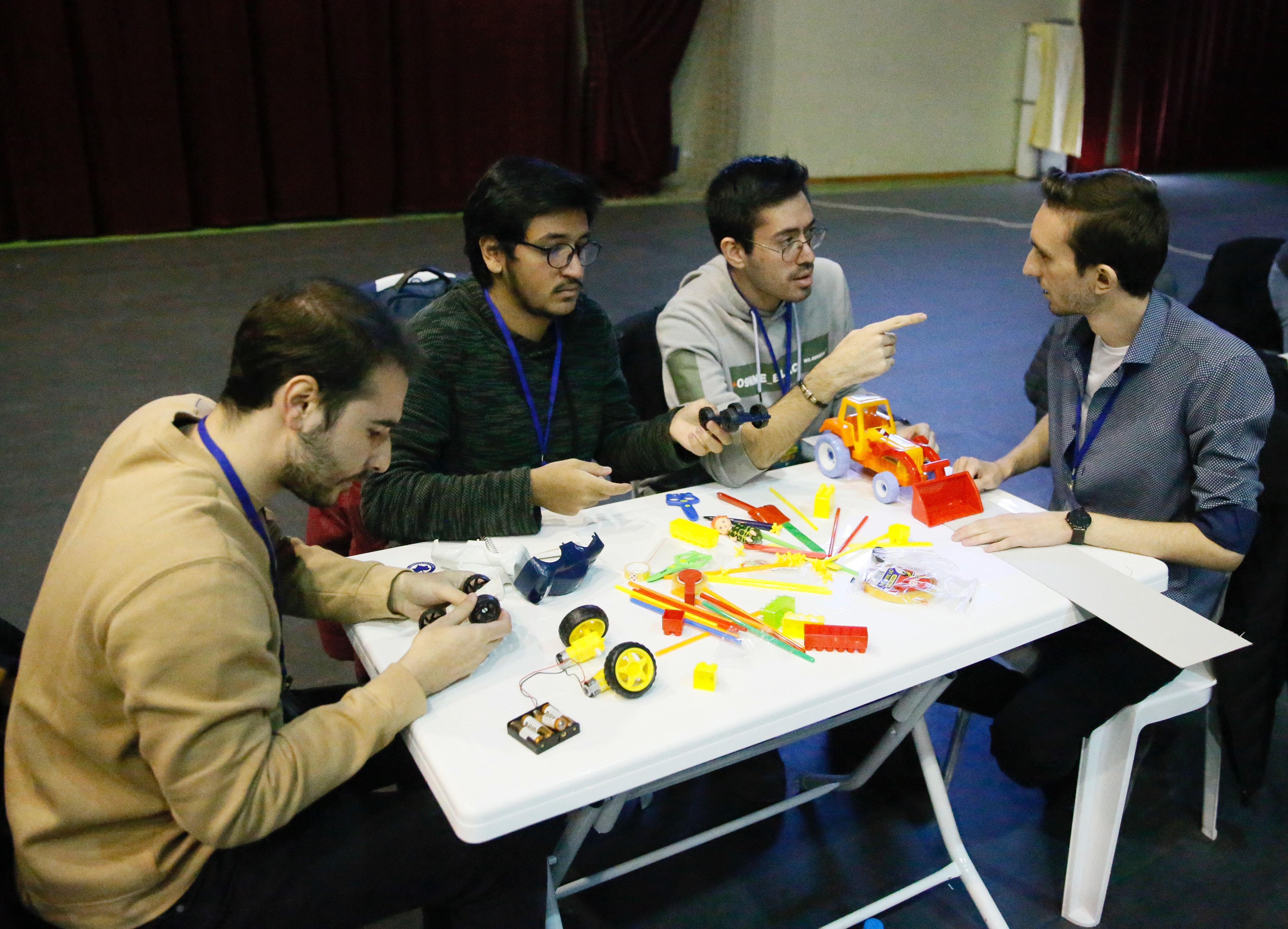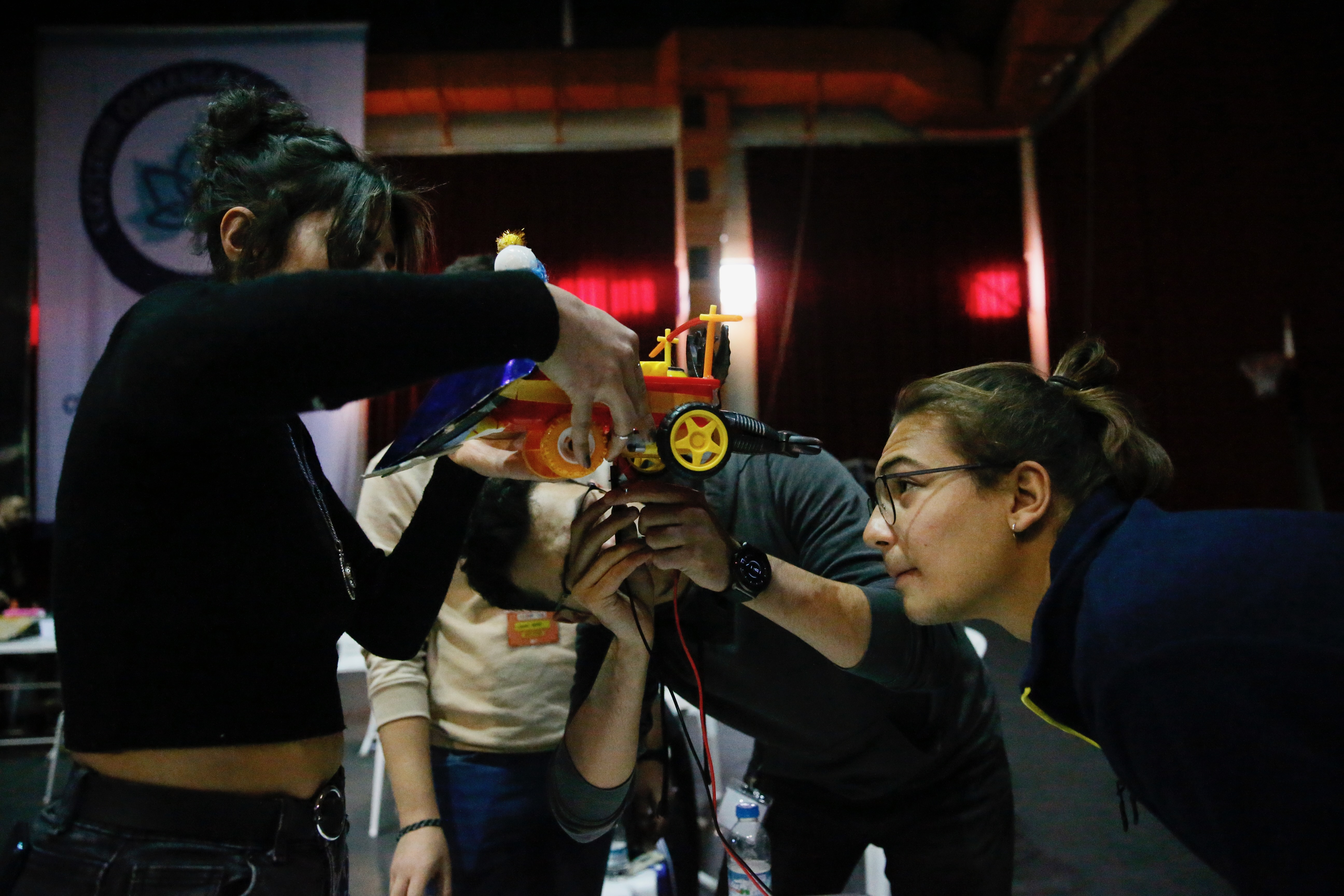 Takımlar, yarışmada robot yapmak için salon ortasına konulan masalarda aralarında hurda, oyuncak ve kağıtların olduğu malzemeleri 2 dakika içerisinde toplayıp kendi alanlarına götürdü. Öğrencilerin robot malzemeleri alabilmek için birbiriyle mücadele etti.