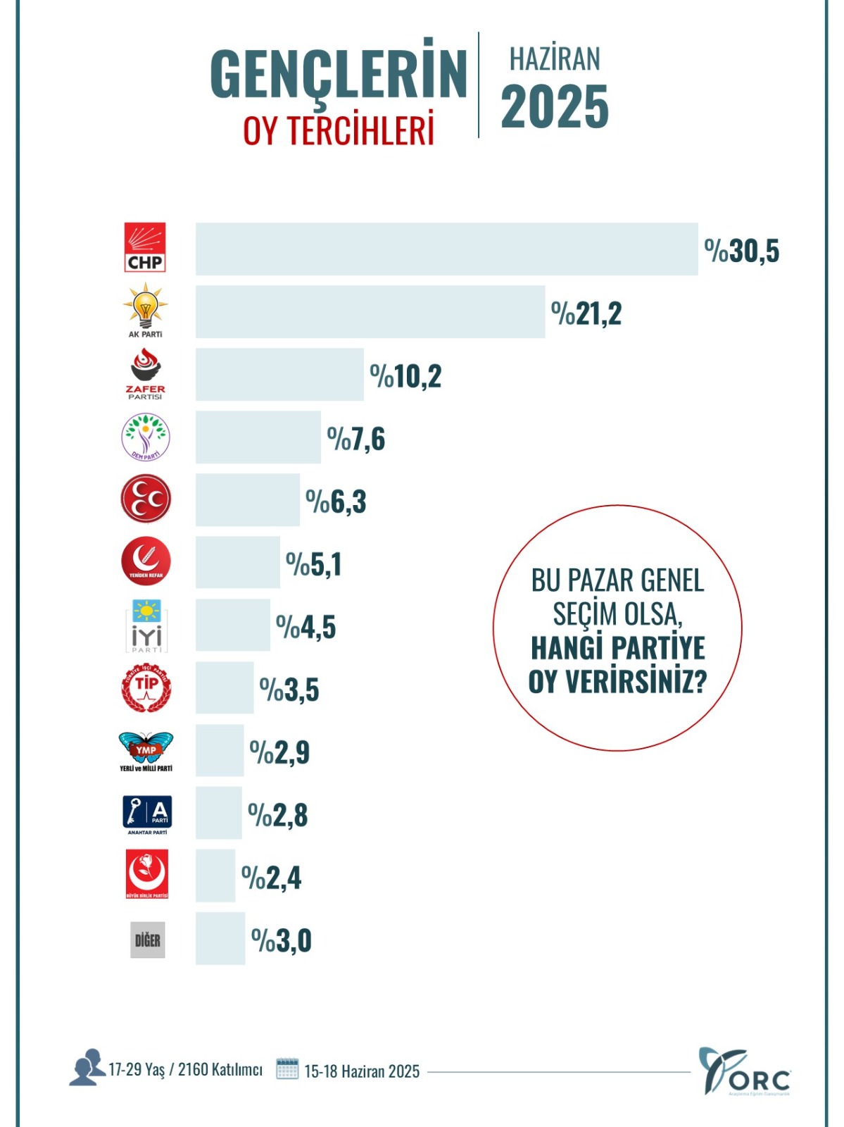 15-18 Haziran tarihlerinde 2 bin 160 kişiyle yapılan araştırmada, 17-29 yaş aralığındaki kişilere "Bu Pazar Genel Seçim Olsa" denildi ve oy tercihleri soruldu.