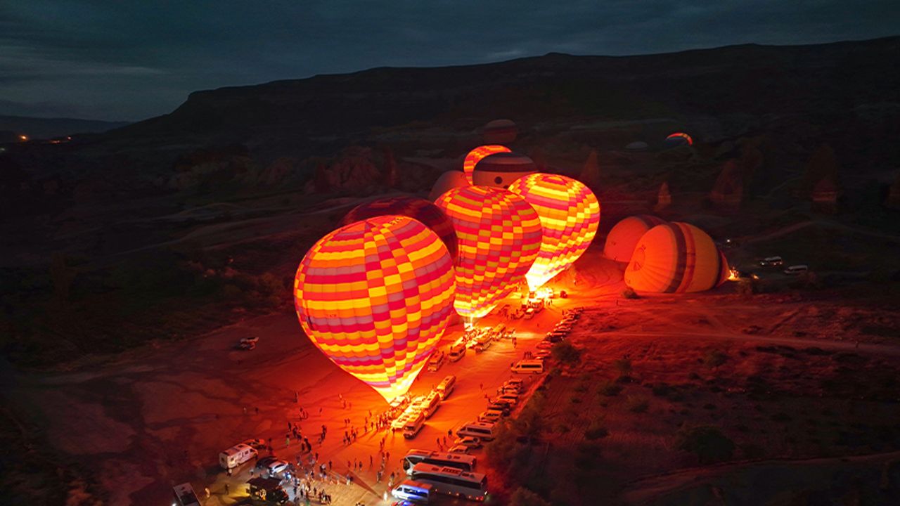 Alacakaranlıkta balonların içerisi sıcak hava doldurulurken, adeta bir fener gibi gözükmesi renkli görüntüler oluşturuyor. Uçuşuna izin verilen balonlar daha sonra sıcak hava ile doldurulup gün doğumunda gökyüzüne yükseliyor. Yaklaşık 1 saat boyunca gökyüzünden Kapadokya’yı izleyen turistler unutulmaz anların tadını çıkartıyor.