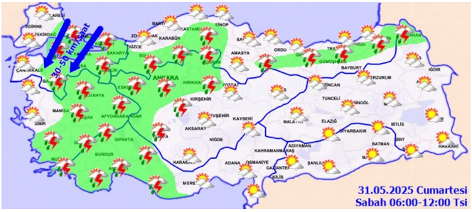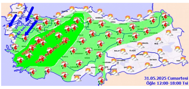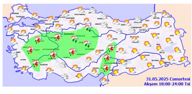 Ankara'da ise sabah saatlerinden itibaren başlayan gök gürültülü sağanak yağışların gün boyu etkisini sürdürmesi tahmin ediliyor. Sıcaklık en yüksek 21°C, en düşük 11°C olacak. Pazar günü de yağışlar devam edecek. Marmara’nın doğusu, İç Ege, Akdeniz’in iç kesimleri, İç Anadolu, Karadeniz ile Doğu Anadolu’nun kuzeyinde gök gürültülü sağanak bekleniyor. Yağışların Batı Karadeniz’in iç kesimleri ile çevrelerinde yer yer kuvvetli olması öngörülüyor. Doğu ve Güneydoğu Anadolu’da rüzgarın güney ve güneybatı yönlerden kuvvetli (40-60 km/sa) olarak eseceği tahmin ediliyor.