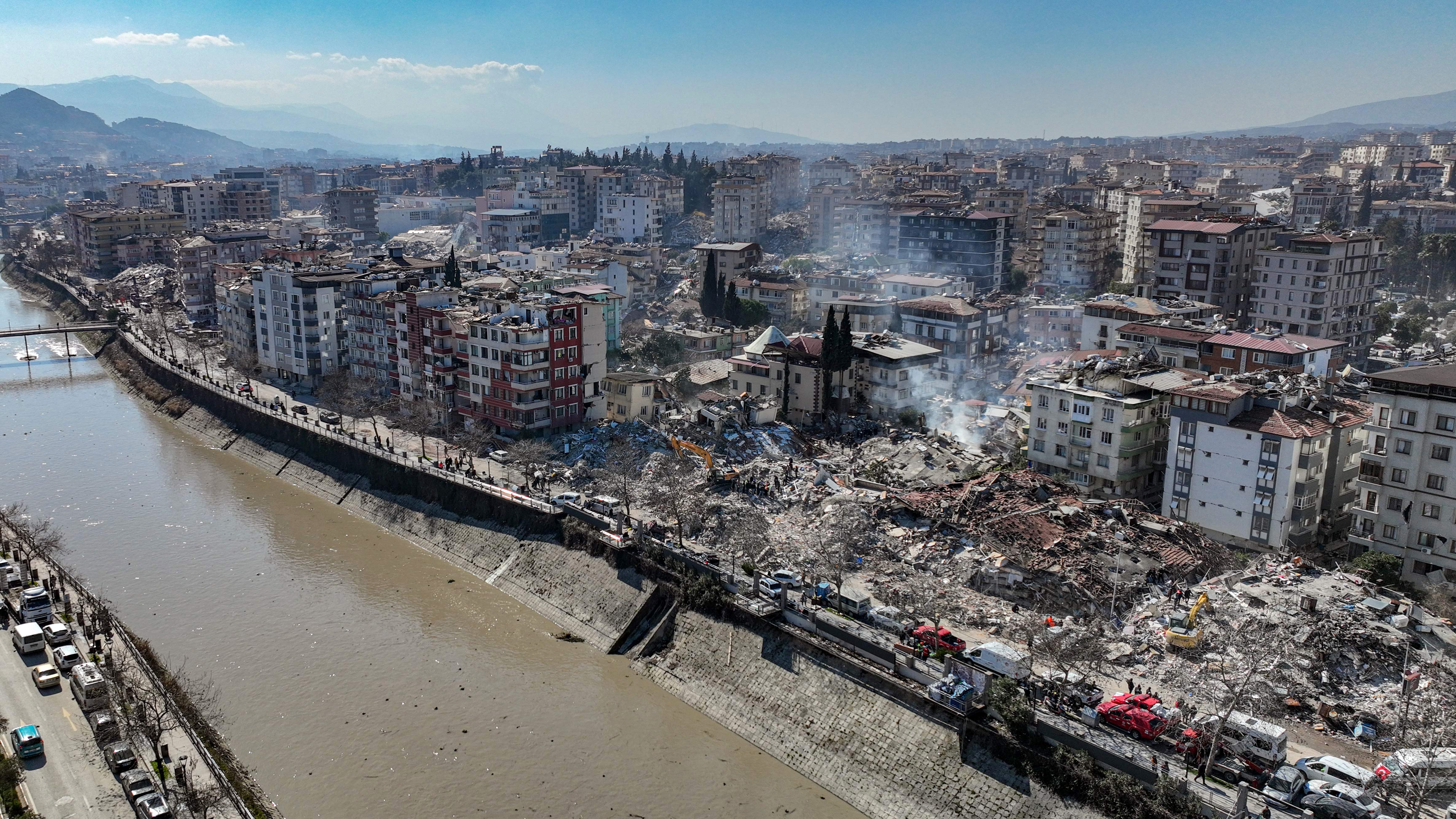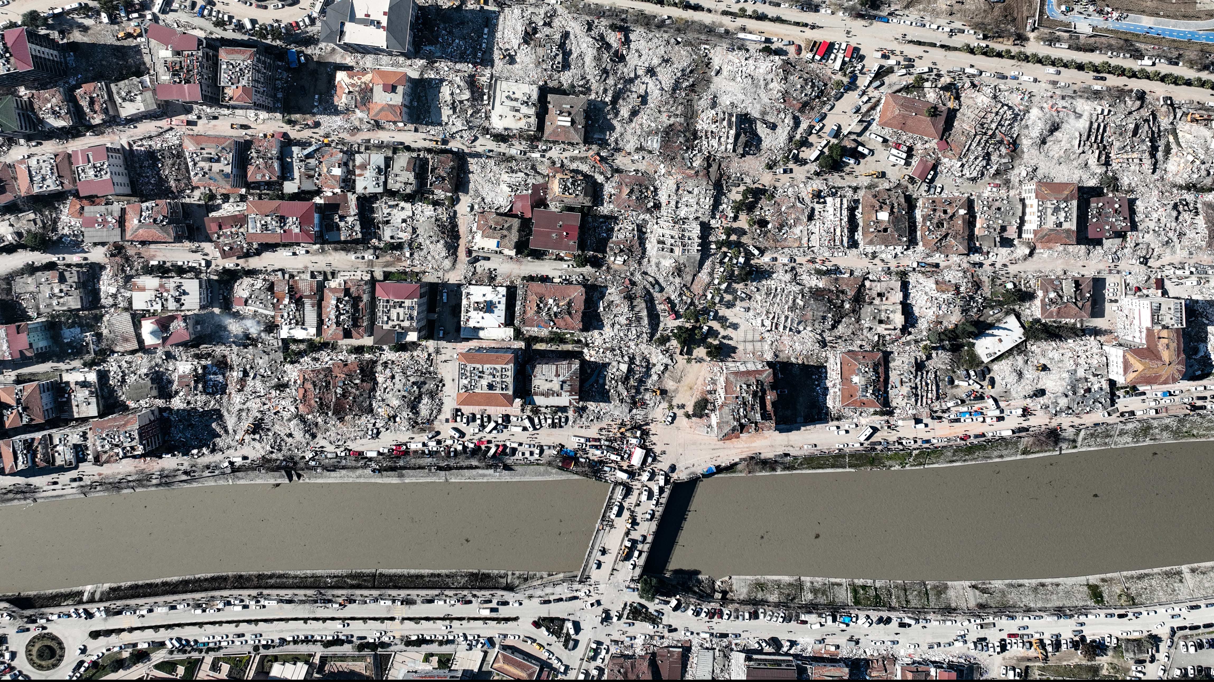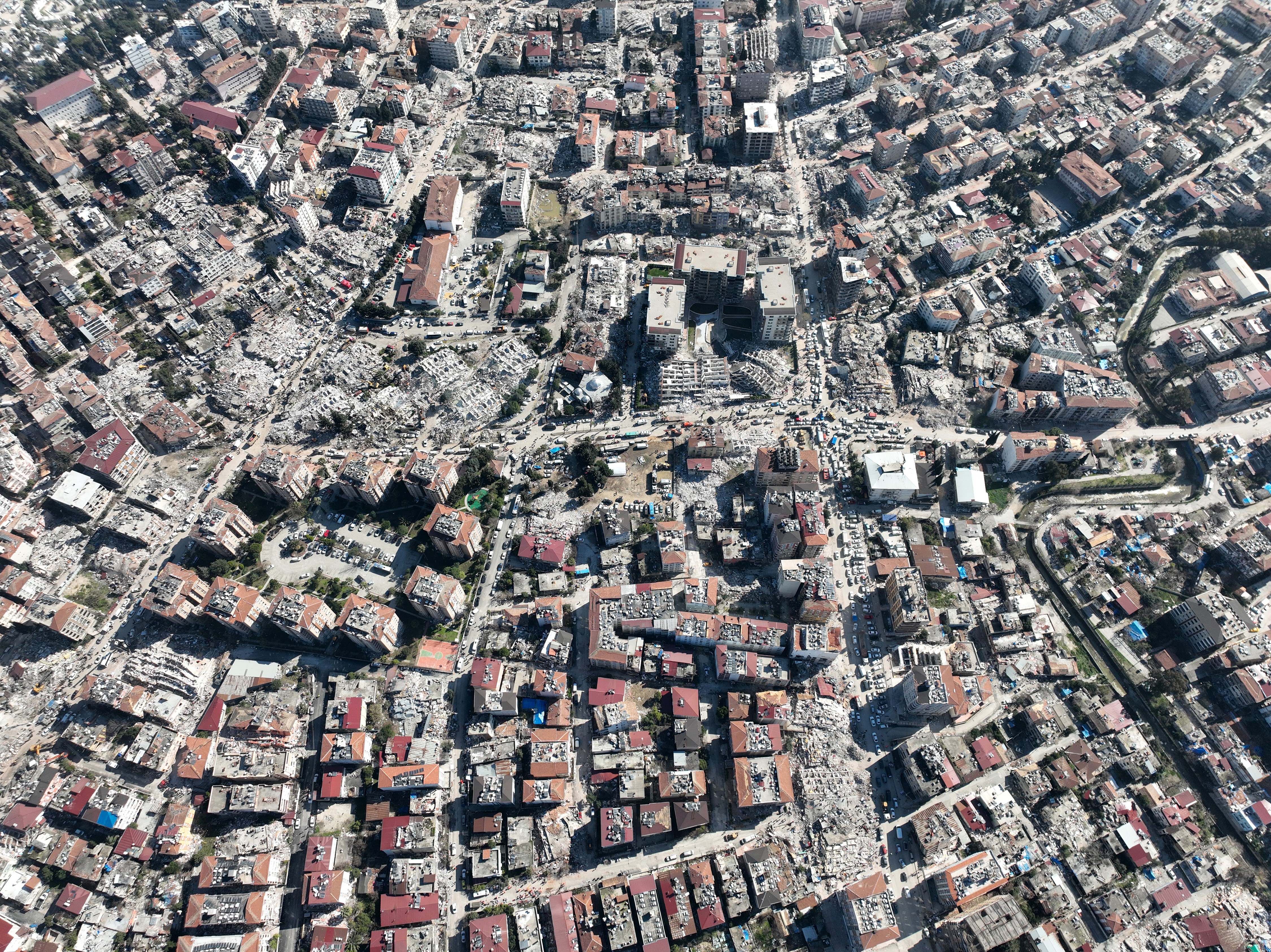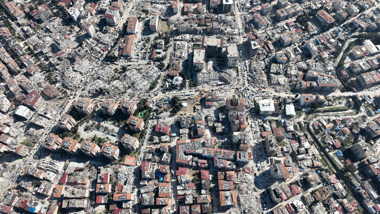 Üç binden fazla binanın yıkıldığı şehir merkezi adeta hayalet şehri andırıyor.Kahramanmaraş merkezli büyük depremin ve artçı depremlerin etkileri gün geçtikçe tüm ülkede ortaya çıkmaya devam ediyor. Hatay merkezde havadan çekilen görüntülerde depremin 5. gününde felaketin boyutu net bir şekilde gözler önüne seriliyor. Havadan çekilen görüntüler izleyenleri dehşete düşürüyor. Binlerce binanın yıkıldığı kent merkezi neredeyse tamamen harabeye dönmüş durumda. Bir çok ev ise yan yatmış bir şekilde her an yıkılma tehlikesi ile karşı karşıya kalmış durumda.