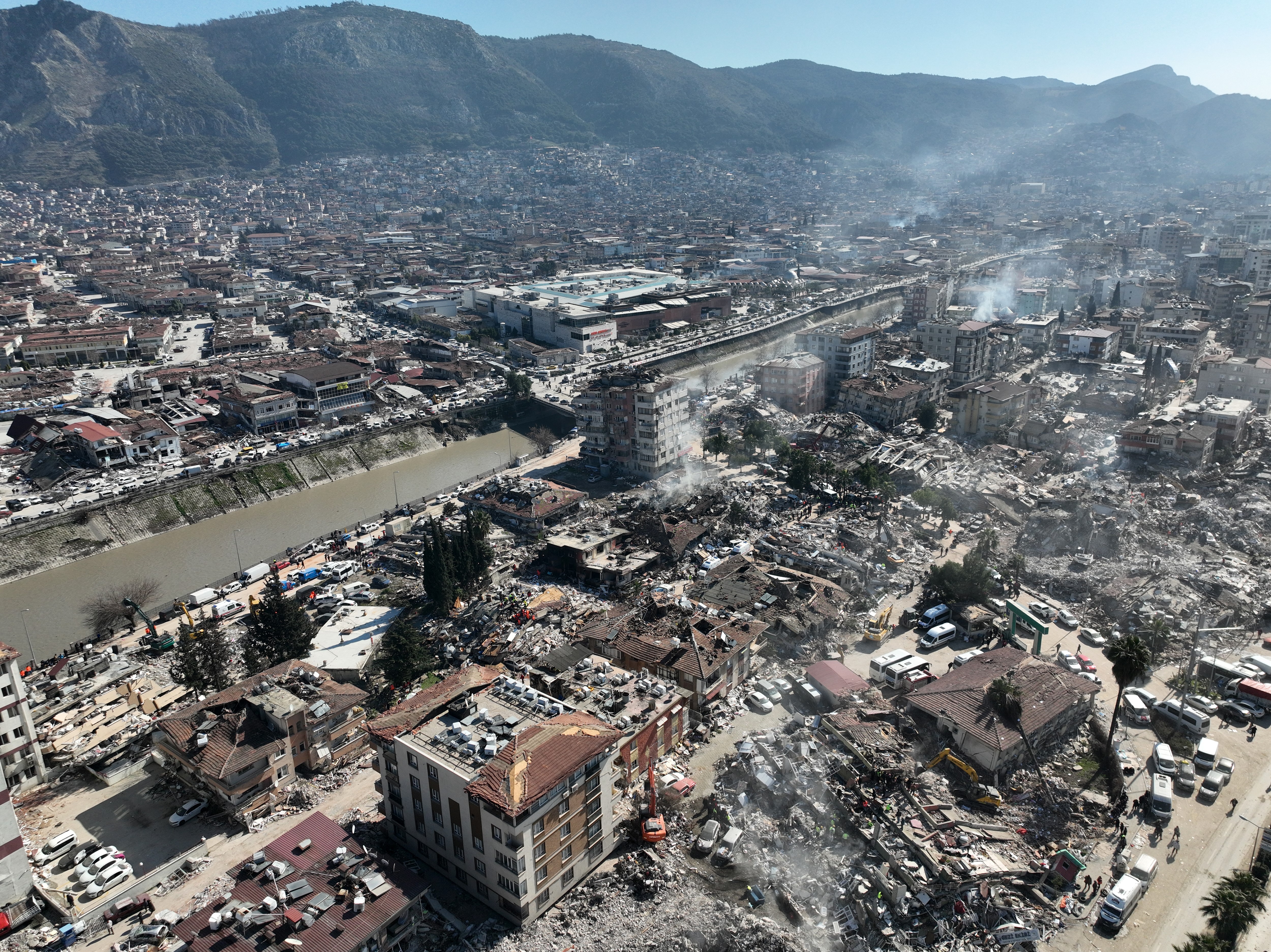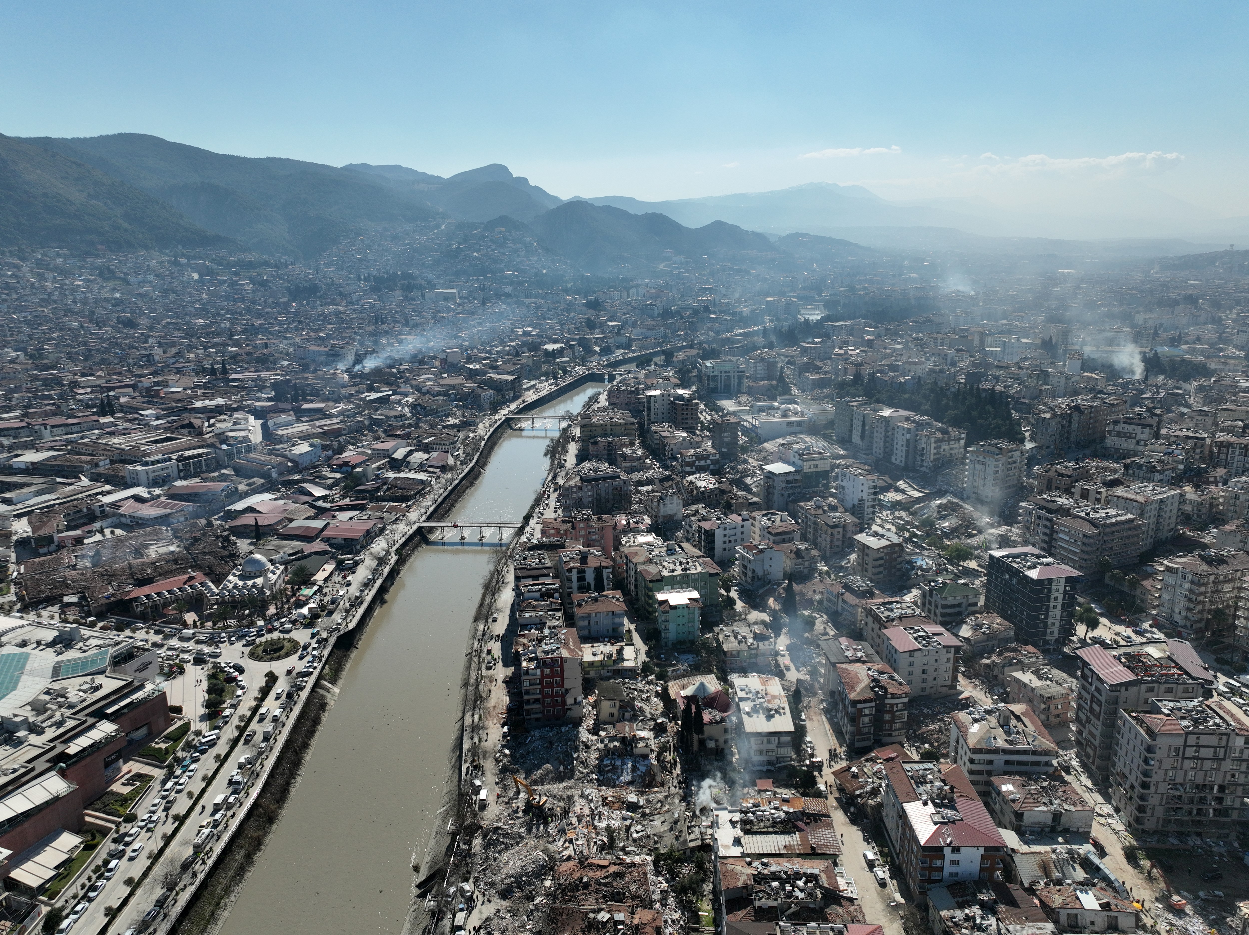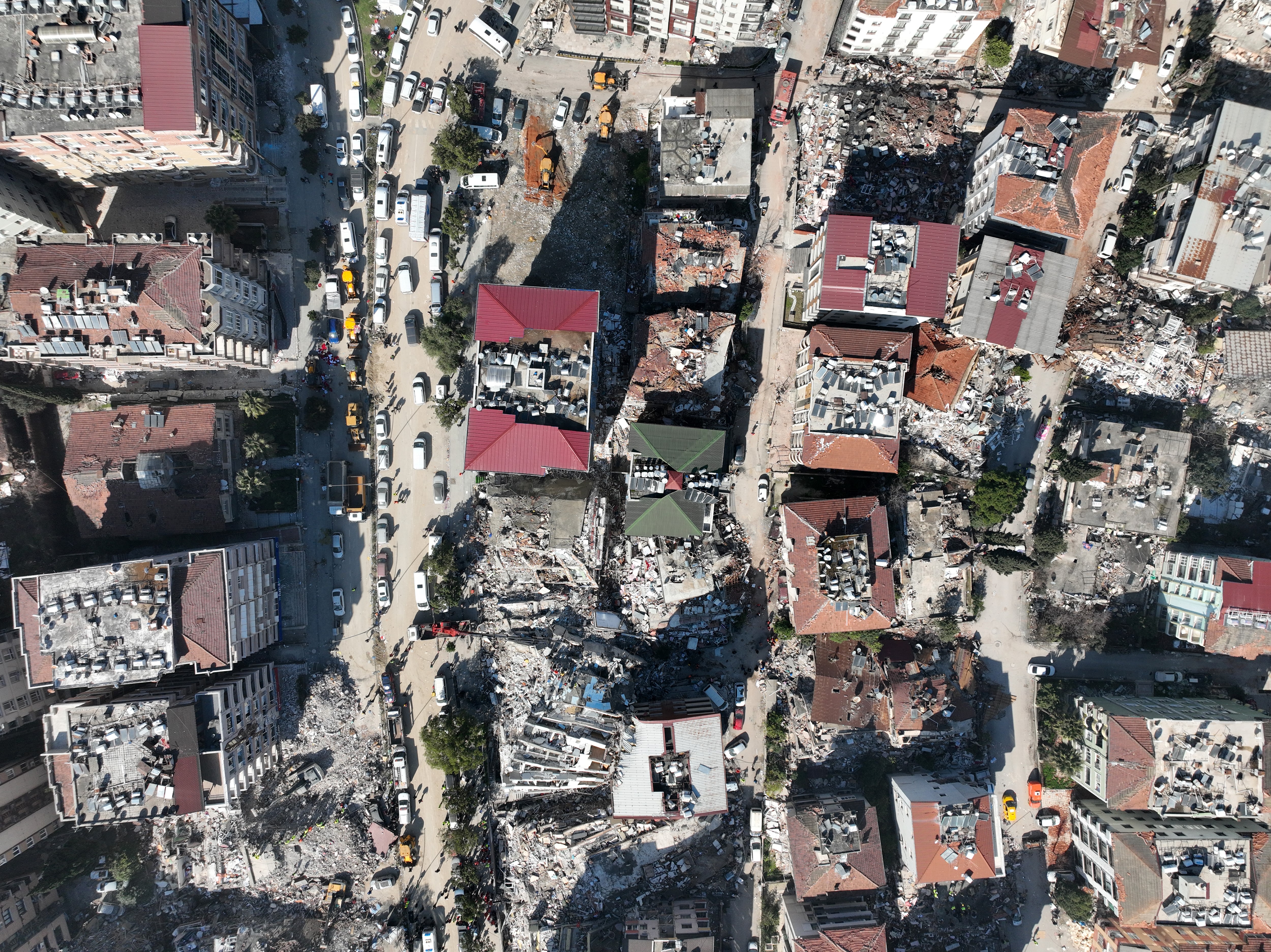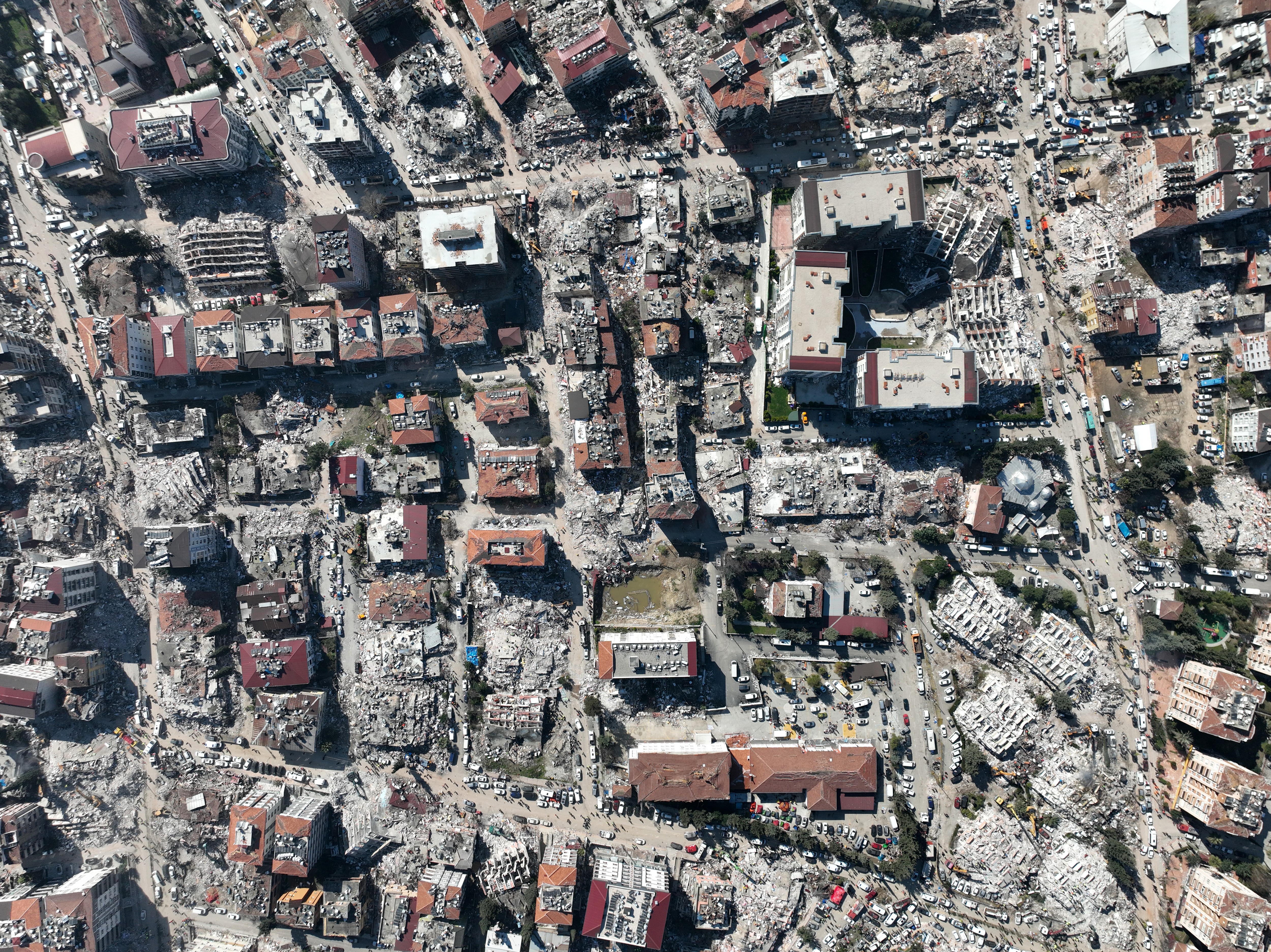 Üç binden fazla binanın yıkıldığı şehir merkezi adeta hayalet şehri andırıyor.Kahramanmaraş merkezli büyük depremin ve artçı depremlerin etkileri gün geçtikçe tüm ülkede ortaya çıkmaya devam ediyor. Hatay merkezde havadan çekilen görüntülerde depremin 5. gününde felaketin boyutu net bir şekilde gözler önüne seriliyor. Havadan çekilen görüntüler izleyenleri dehşete düşürüyor. Binlerce binanın yıkıldığı kent merkezi neredeyse tamamen harabeye dönmüş durumda. Bir çok ev ise yan yatmış bir şekilde her an yıkılma tehlikesi ile karşı karşıya kalmış durumda.