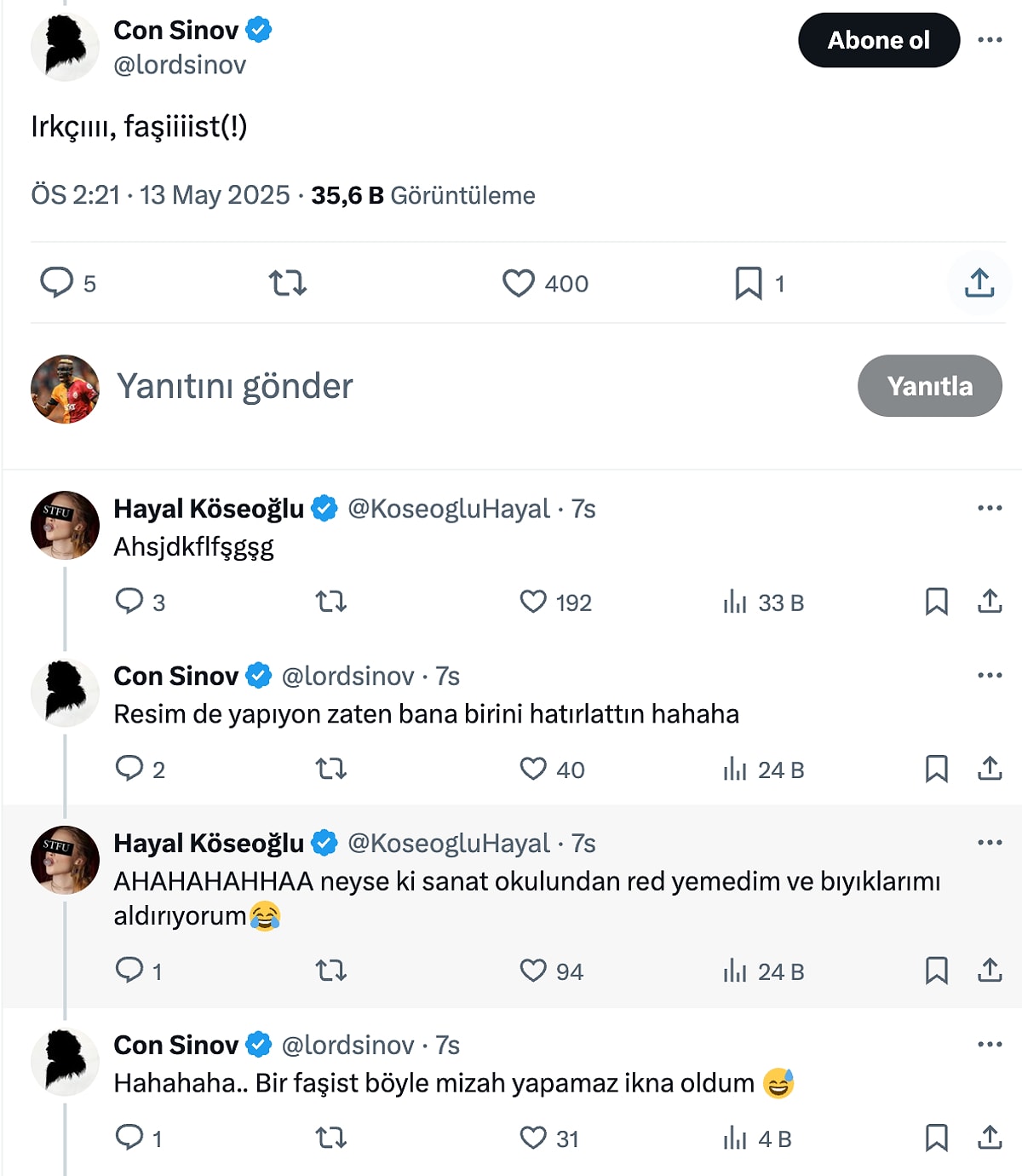 Genç oyuncunun yanıtı ise şöyle oldu: “30-40 sene öncesinden bahsediyorsunuz. Bireysel düzlemde nasıl 30-40 sene önceki bir olayı intikam/takıntı haline getirip önüne bakamayan, tüm hayatını ve varoluşunu haksızlık ve mağduriyet üzerinden tanımlayan birine terapiye git diyorsam, büyük ölçekte de aynısını diyorum.”