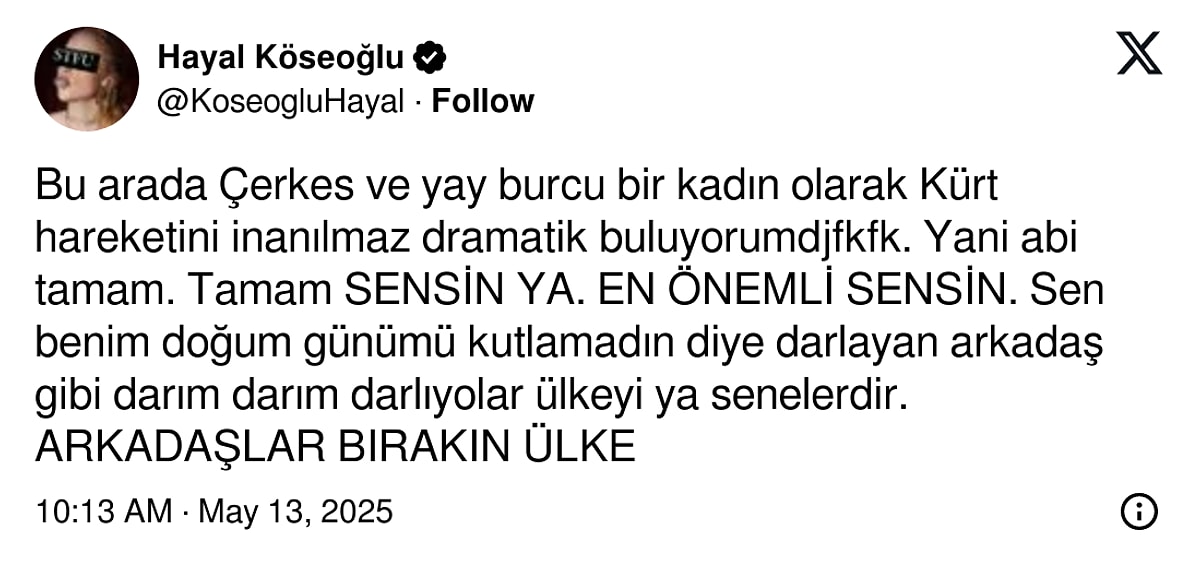 Hayal Köseoğlu paylaşımında şu ifadeleri kullandı: “Bu arada Çerkes ve yay burcu bir kadın olarak Kürt hareketini inanılmaz dramatik buluyorum. Yani abi tamam. Tamam sensin ya. En önemli sensin. Sen benim doğum günümü kutlamadın diye darlayan arkadaş gibi darım darım darlıyorlar ülkeyi ya senelerdir.
