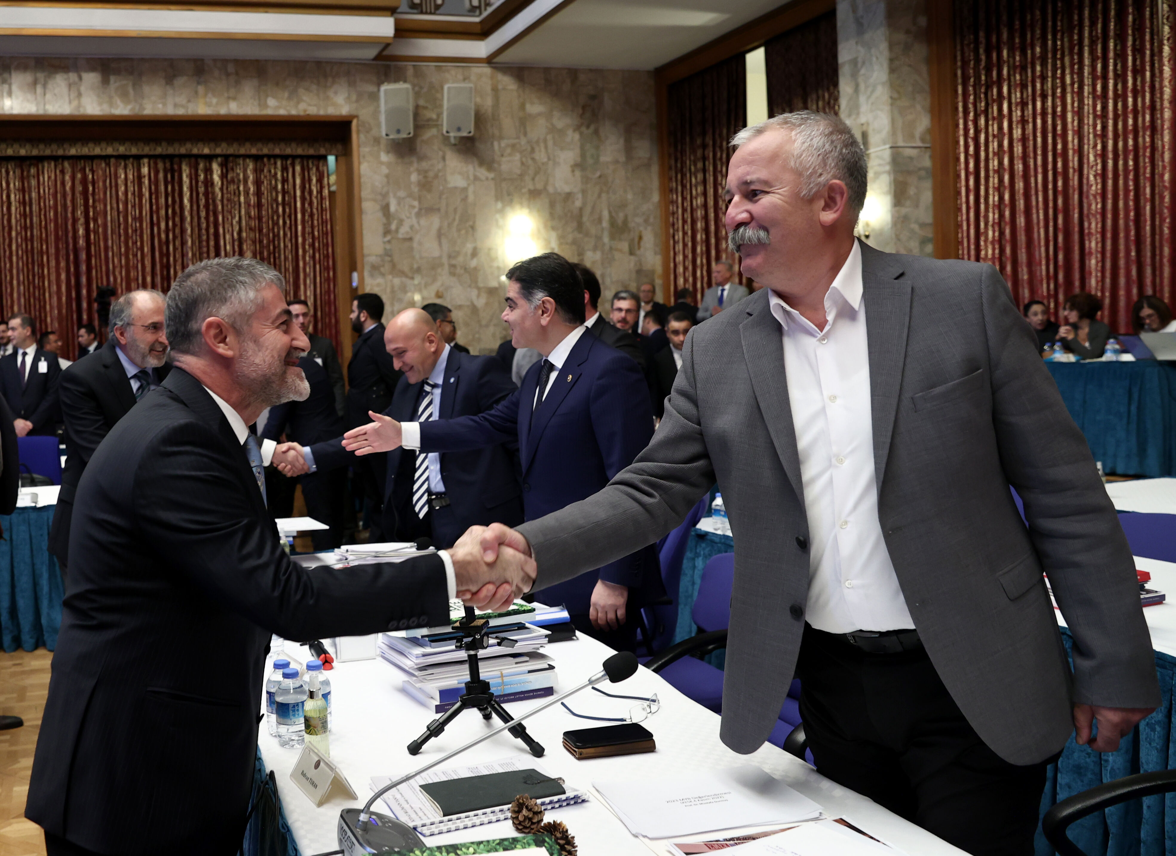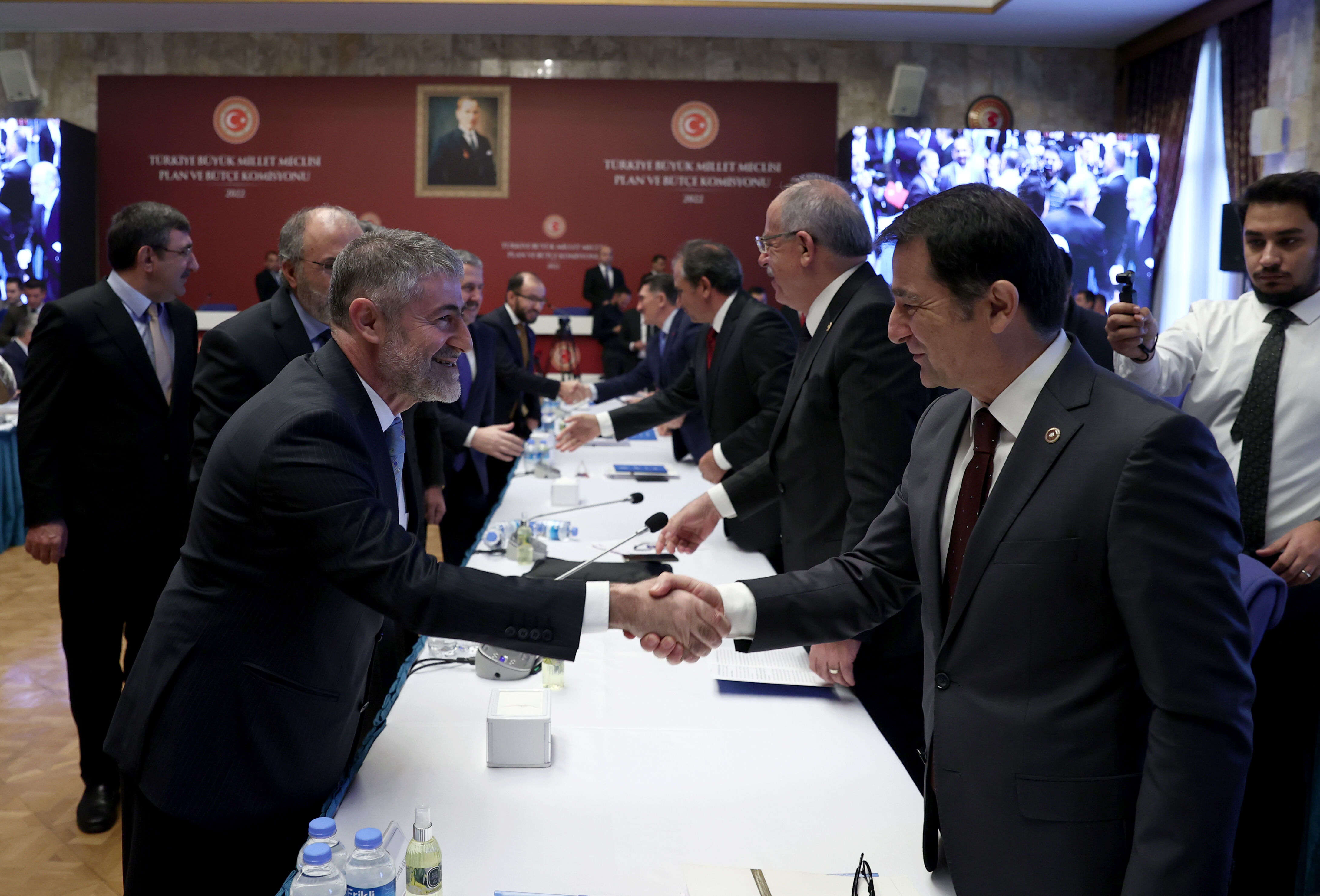 Hazine ve Maliye Bakanı Nureddin Nebati, TBMM Plan ve Bütçe Komisyonunda Hazine ve Maliye Bakanlığı ile bağlı ve ilgili kuruluşlarının 2023 yılı bütçesi görüşmelerine katıldı. Bakan Nebati, salon girişinde komisyon üyelerini selamladı.