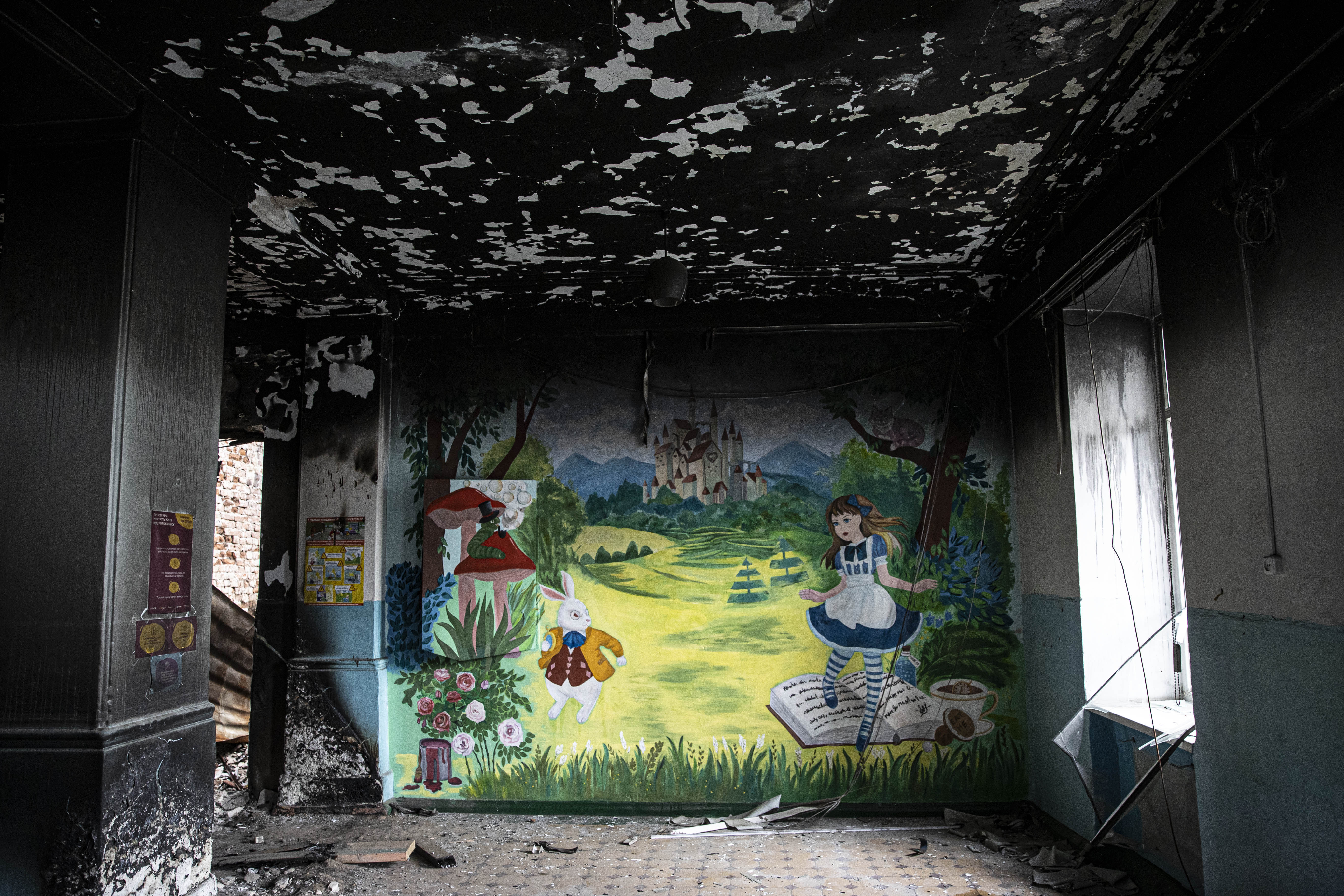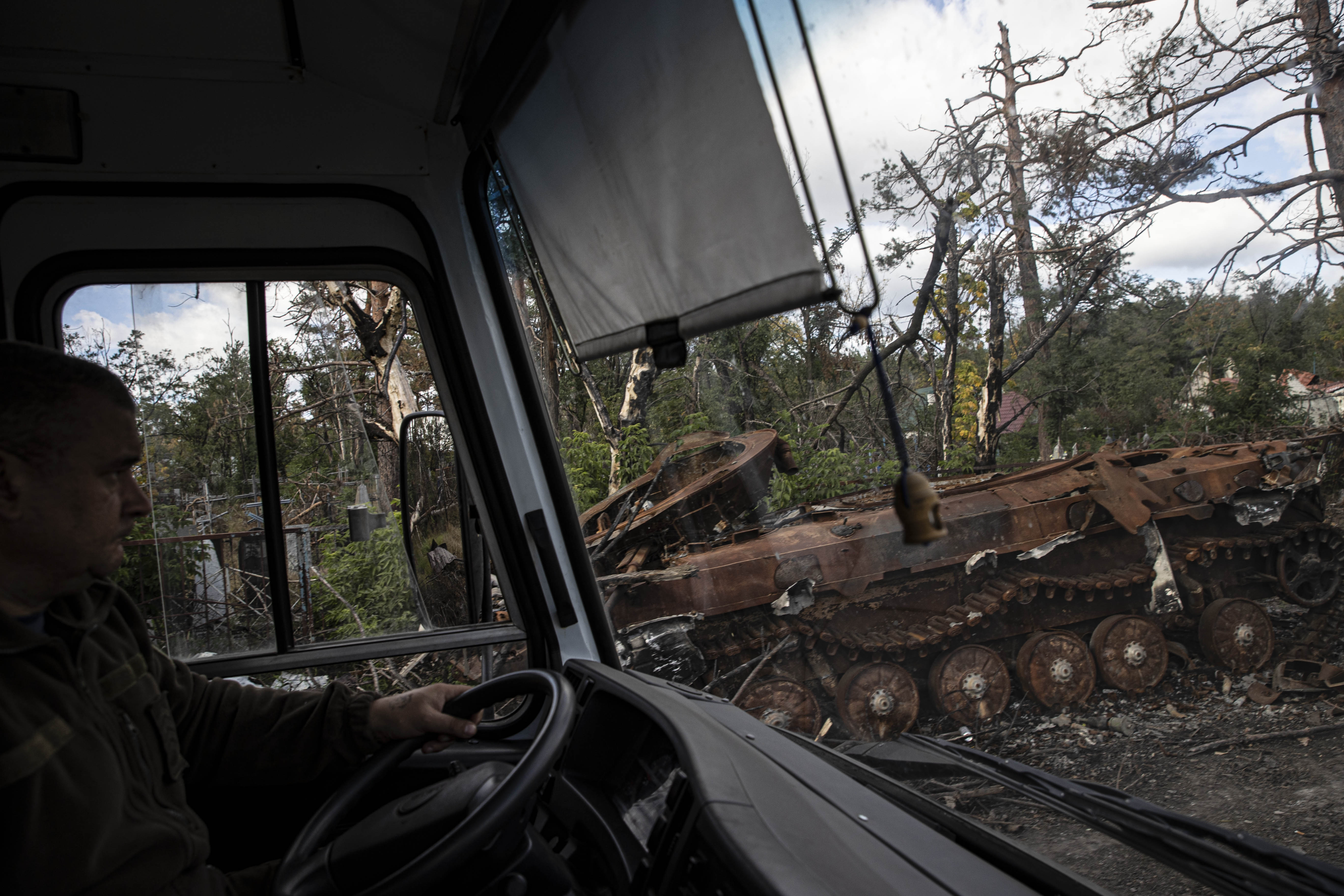 Şehrin girişinde, Ukrayna güçlerince top atışlarıyla hedef alınan Rus güçlerine ait yanmış bir konvoy da yer alıyor.