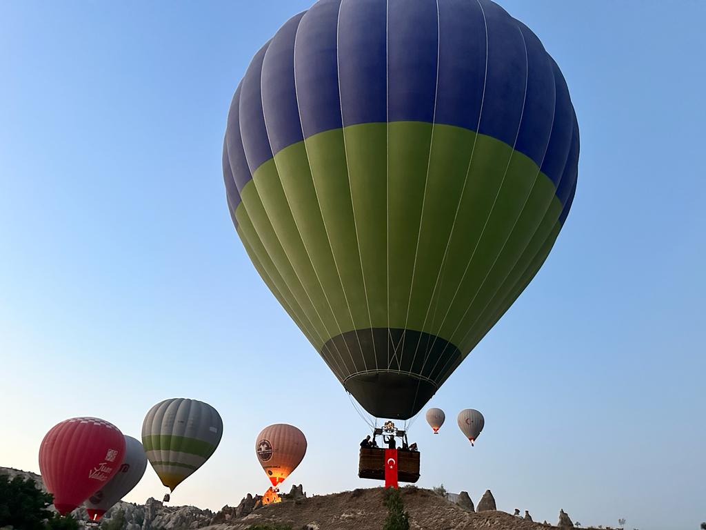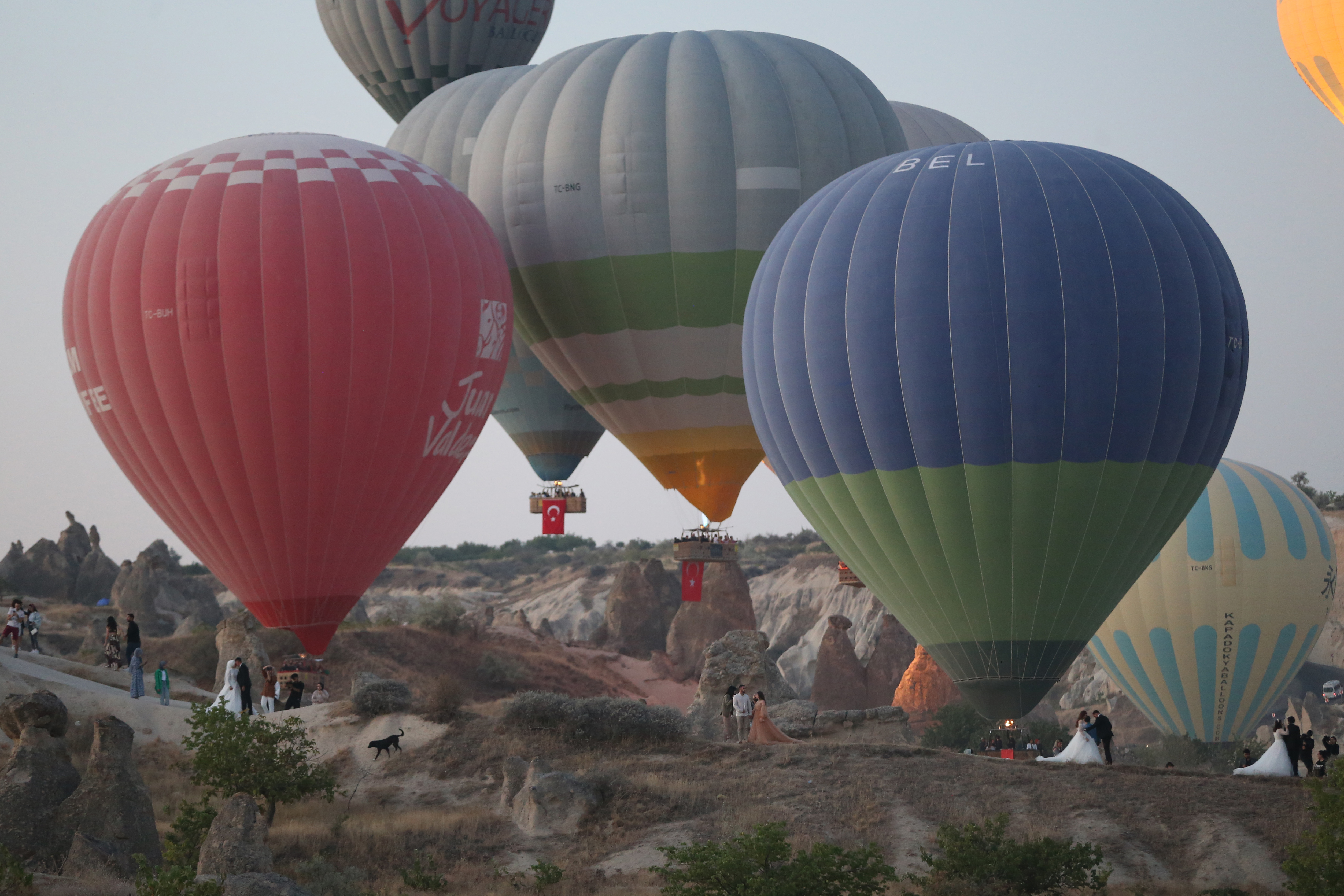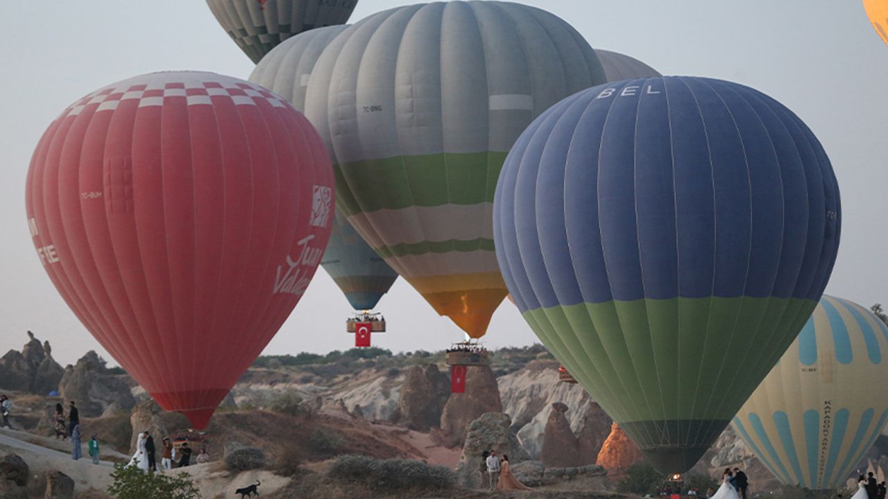 Peş peşe yükselen sıcak hava balonları, gökyüzünde Türk bayrağı taşıyarak bölgedeki peribacaları arasında fotoğraf çeken turistler için renkli bir görüntü oluşturdu.