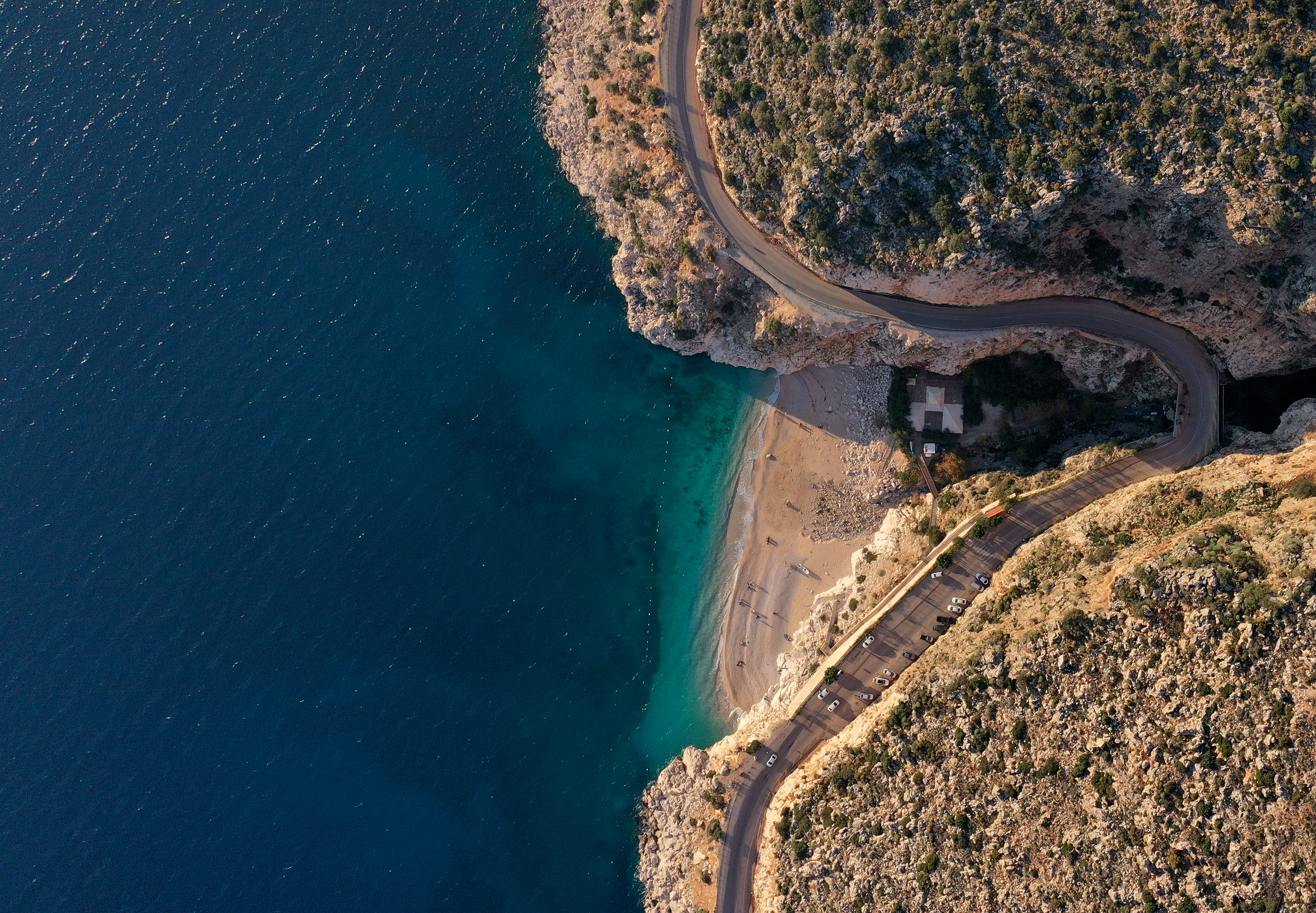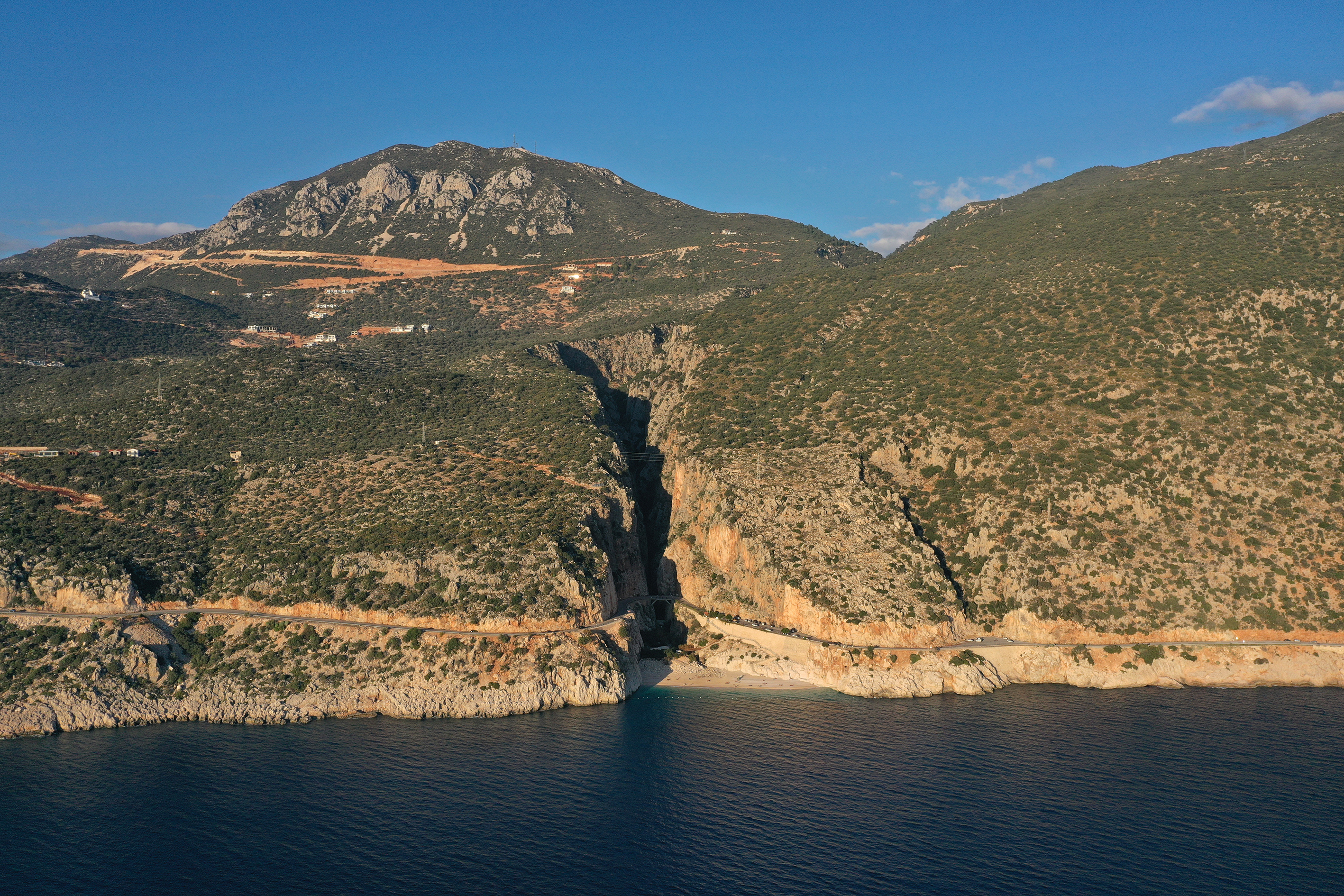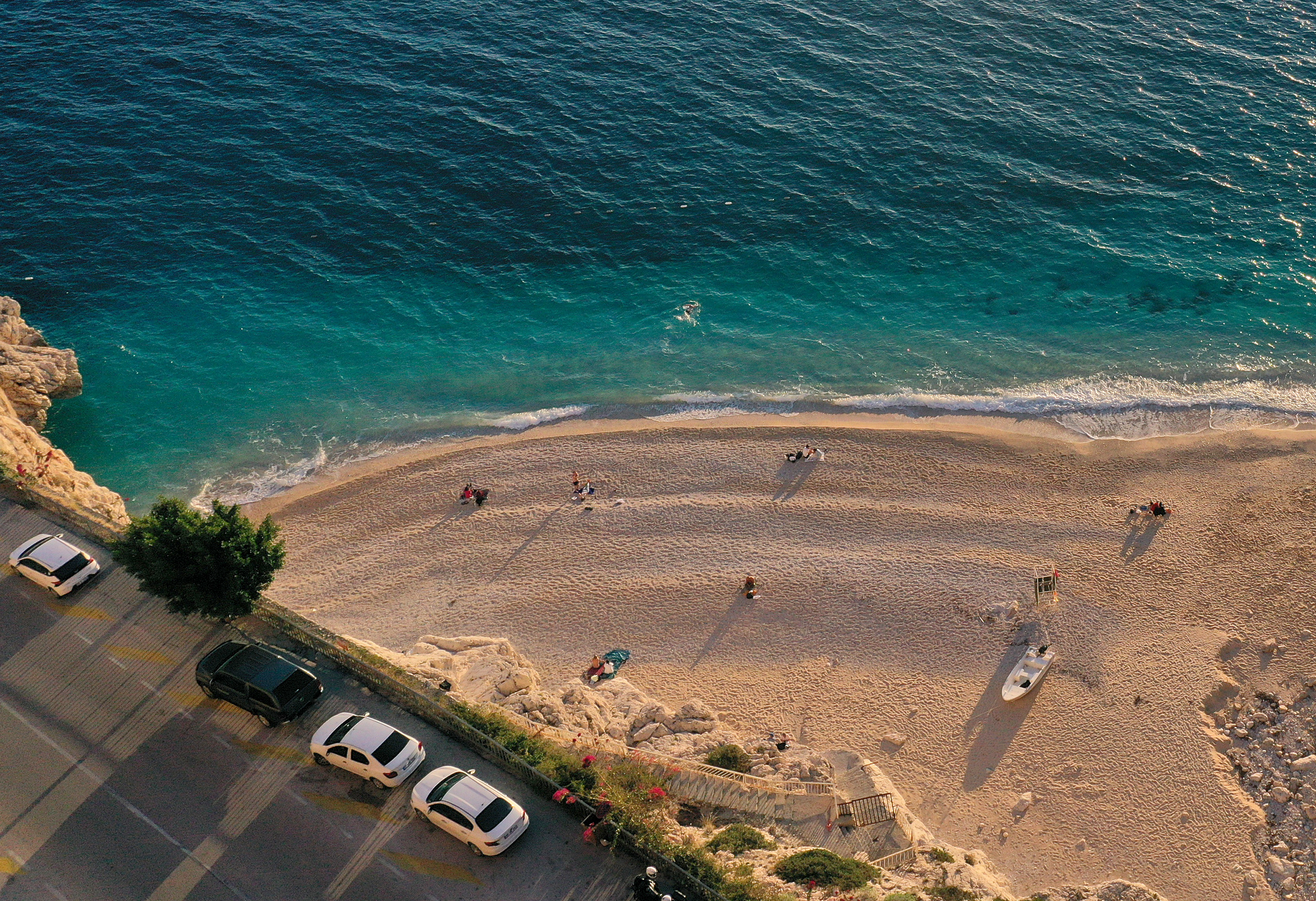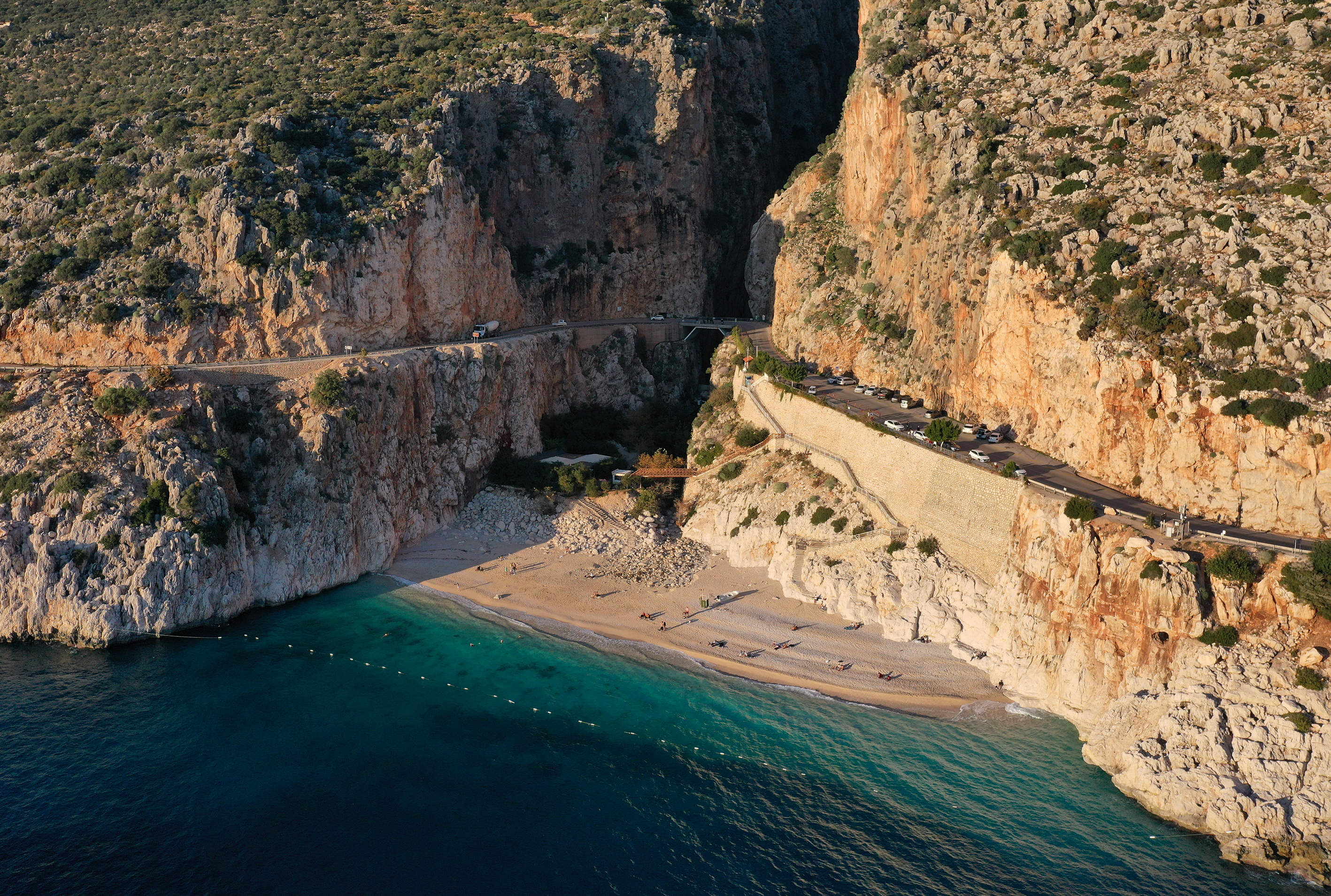 Kaputaş Plajı'nın turkuaz rengi ve gün batımı atmosferi, AA ekibince de dron ile görüntülendi.