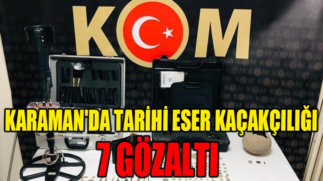 Edinilen bilgiye göre, Karaman Emniyet Müdürlüğü Kaçakçılık Ve Organize Suçlarla Mücadele Şube Müdürlüğü ekipleri, Cumhuriyet Başsavcılığının talimatıyla tarihi eser kaçakçılarına yönelik çalışma başlattı. Yapılan araştırmaların tamamlanmasının ardından çeşitli adreslere operasyon düzenlendi. İkamet, iş yeri ve araçlarda yapılan aramalarda, 277 adet sikke, 27 adet yüzük, 1 adet tarihi eser deri üzerine yazılmış kitap, 1 adet testi, 9 adet ok ucu, 28 adet muhtelif tarihi eser obje, 2 adet dedektör, 1 adet zemin ölçmede kullanılan cihaz ve dedektörlere ait muhtelif cihazlar ele geçirildi. Olayla ilgili 7 kişi ise gözaltına alındı. Şüpheliler ifadeleri alınmak üzere KOM Şube Müdürlüğüne götürüldü.