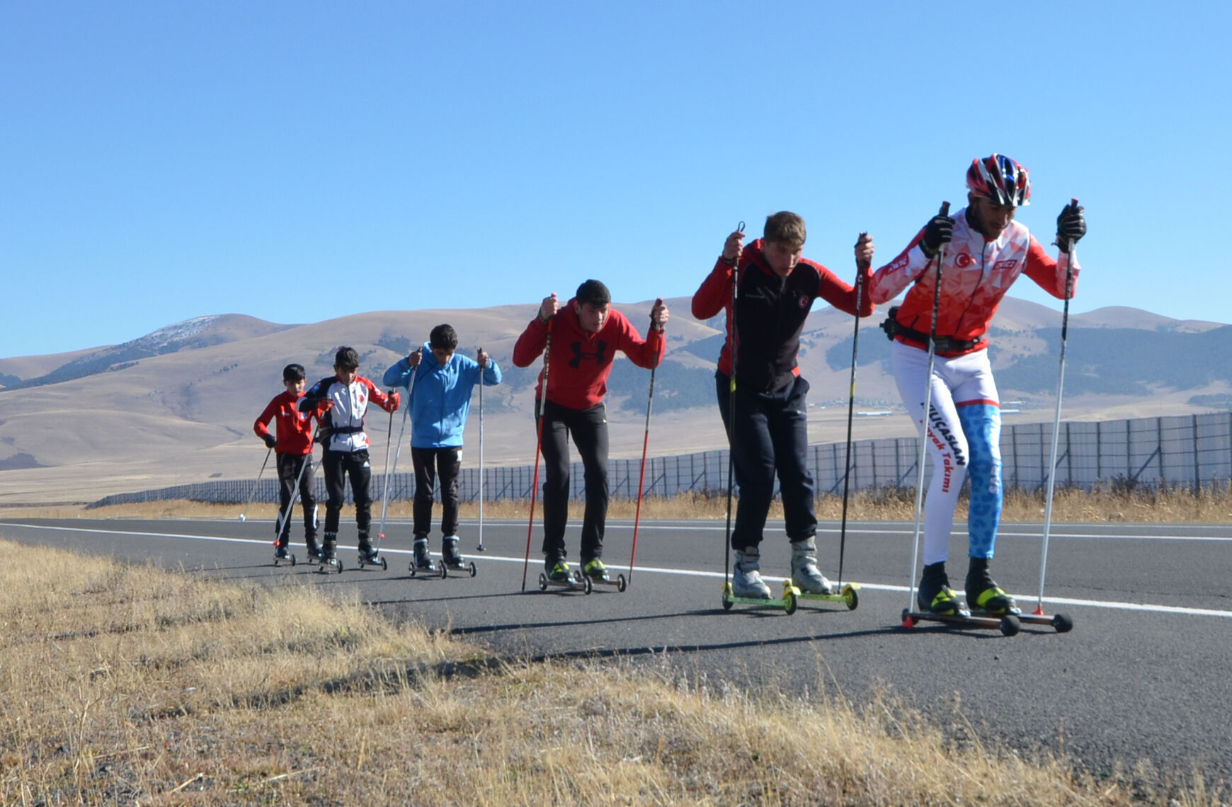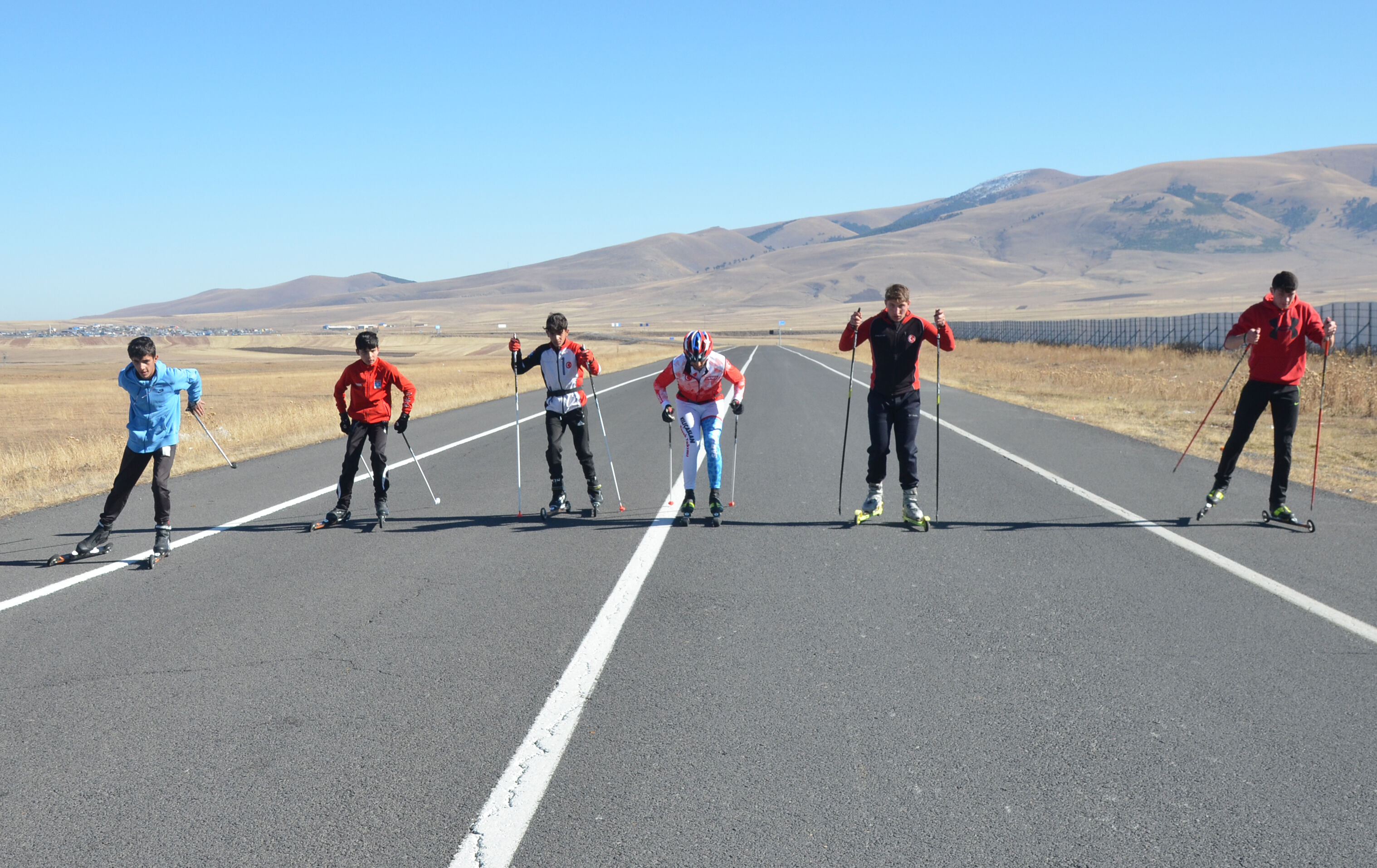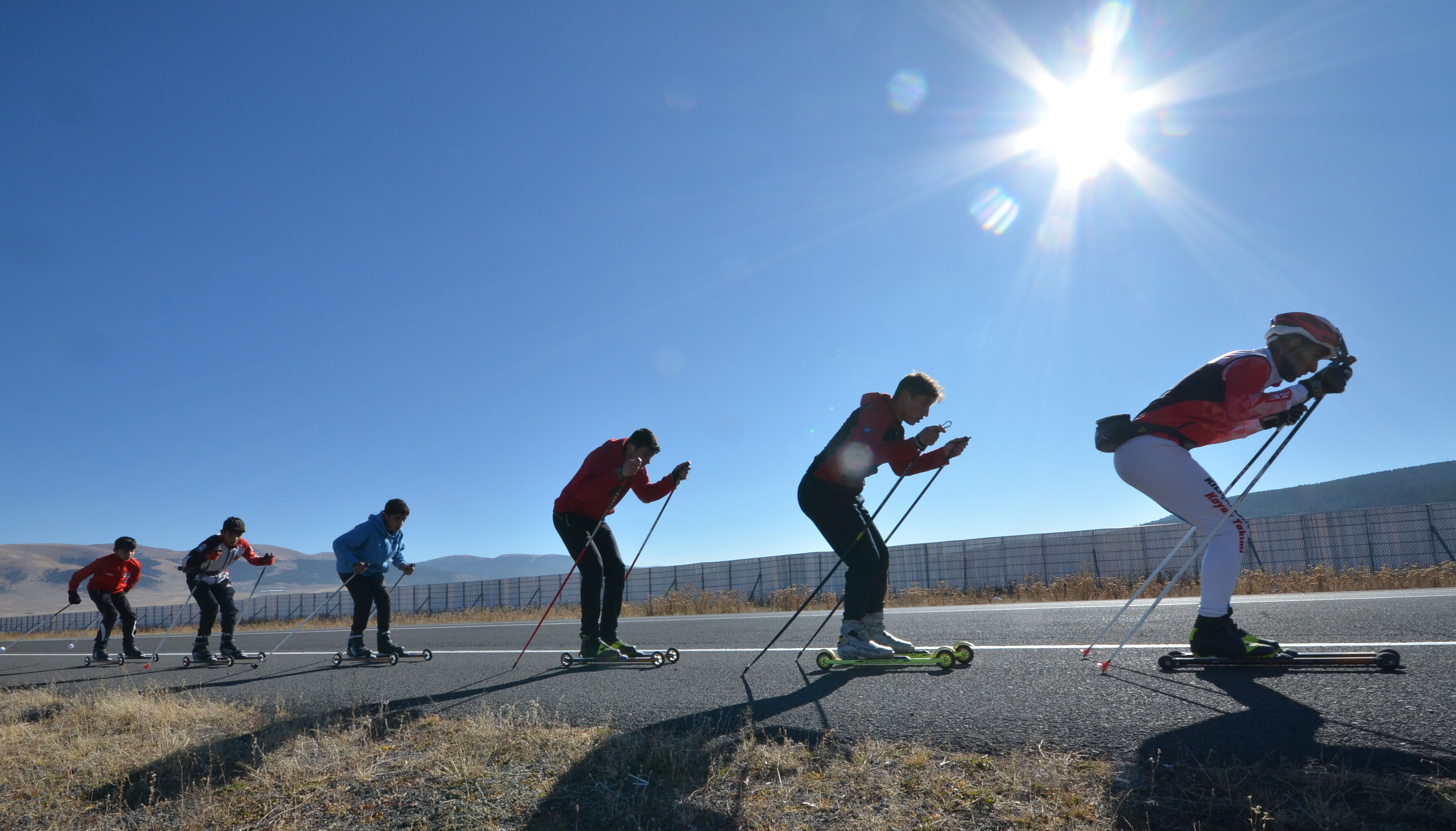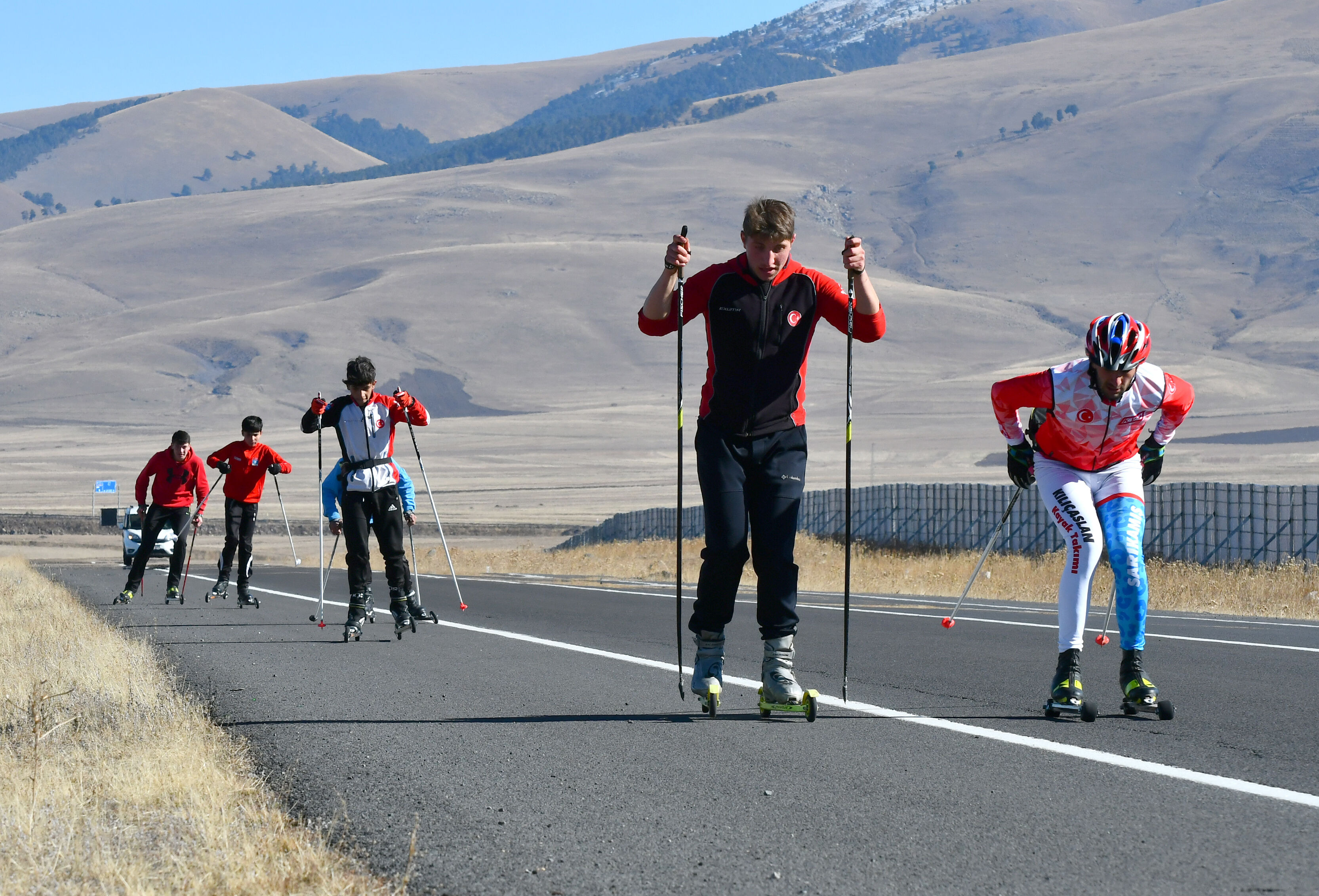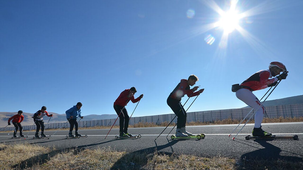Karslı kayaklı koşu sporcuları, kışın düzenlenecek milli takım seçmelerine asfaltta antrenman yaparak hazırlanıyor.