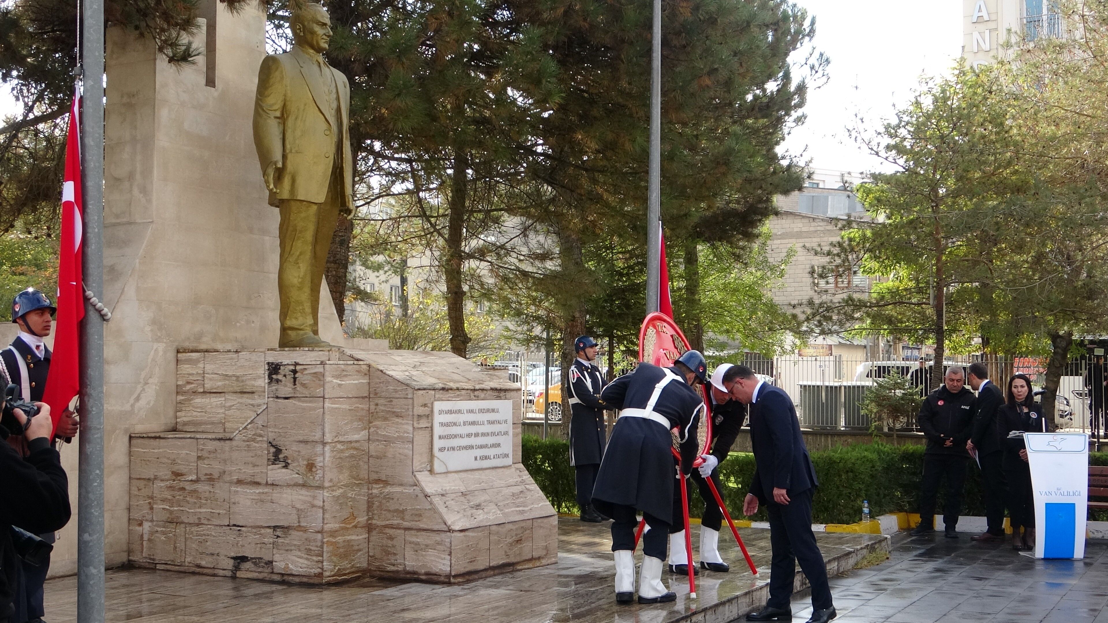 Beşyol Meydanı'ndaki valilik bahçesinde düzenlenen tören, Vali ve Büyükşehir Belediyesi Başkan Vekili Dr. Ozan Balcı ile Van Jandarma Asayiş Kolordu Komutanı Tümgeneral Aykut Tanrıverdi’nin Atatürk heykeline çelenk sunumuyla başladı.