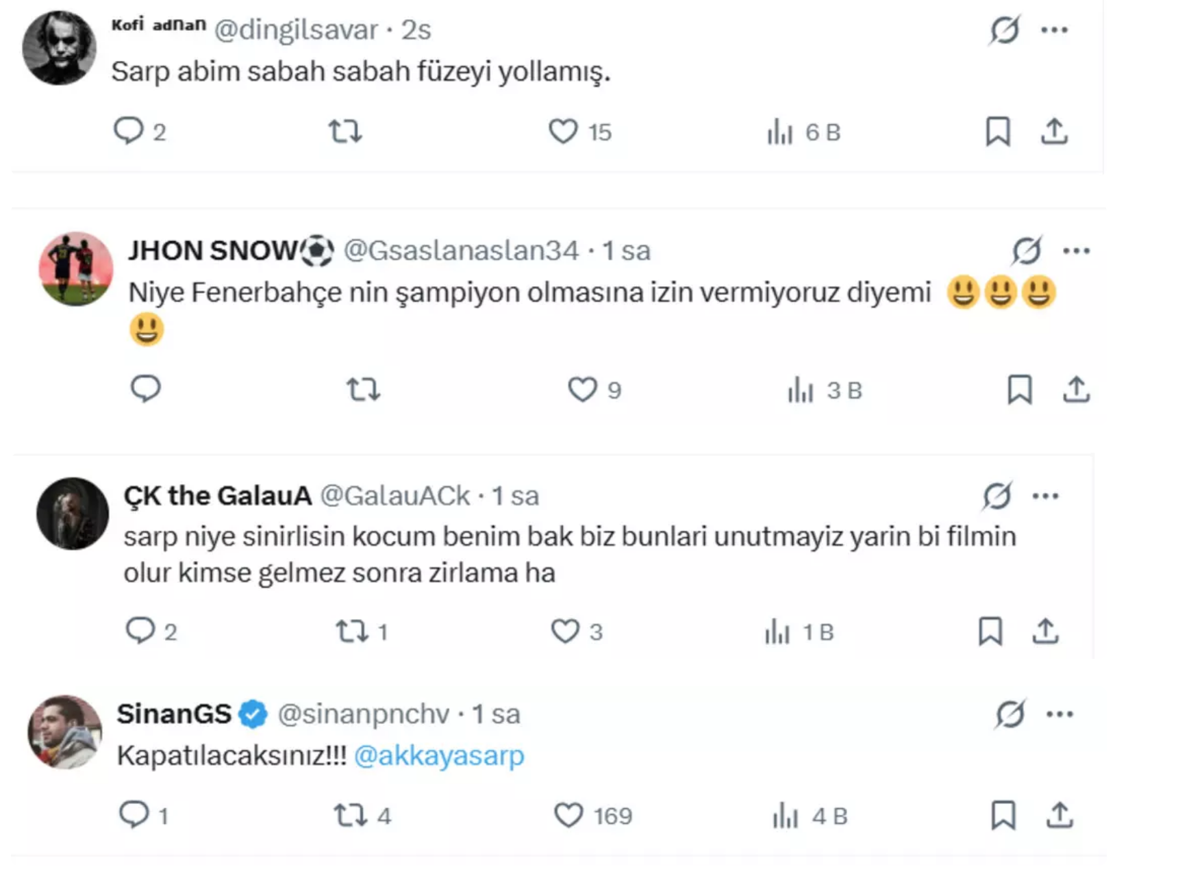 Sarp Akkaya'nın sabahın erken saatlerinde attığı bu tweet sonrası Galatasaraylı ve Fenerbahçeli taraftarlar sosyal medyada laf yarışına girerken, paylaşımın altında toplaşan kabalalık ortalığı karıştırdı. İşte paylaşıma gelen tepkilerden bazıları...