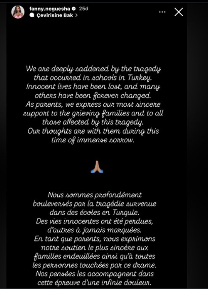 Galatasaraylı Mario Lemina'nın eşi Fanny Neguesha, "Türkiye'deki okullarda meydana gelen trajediden dolayı derin bir üzüntü duyuyoruz.
