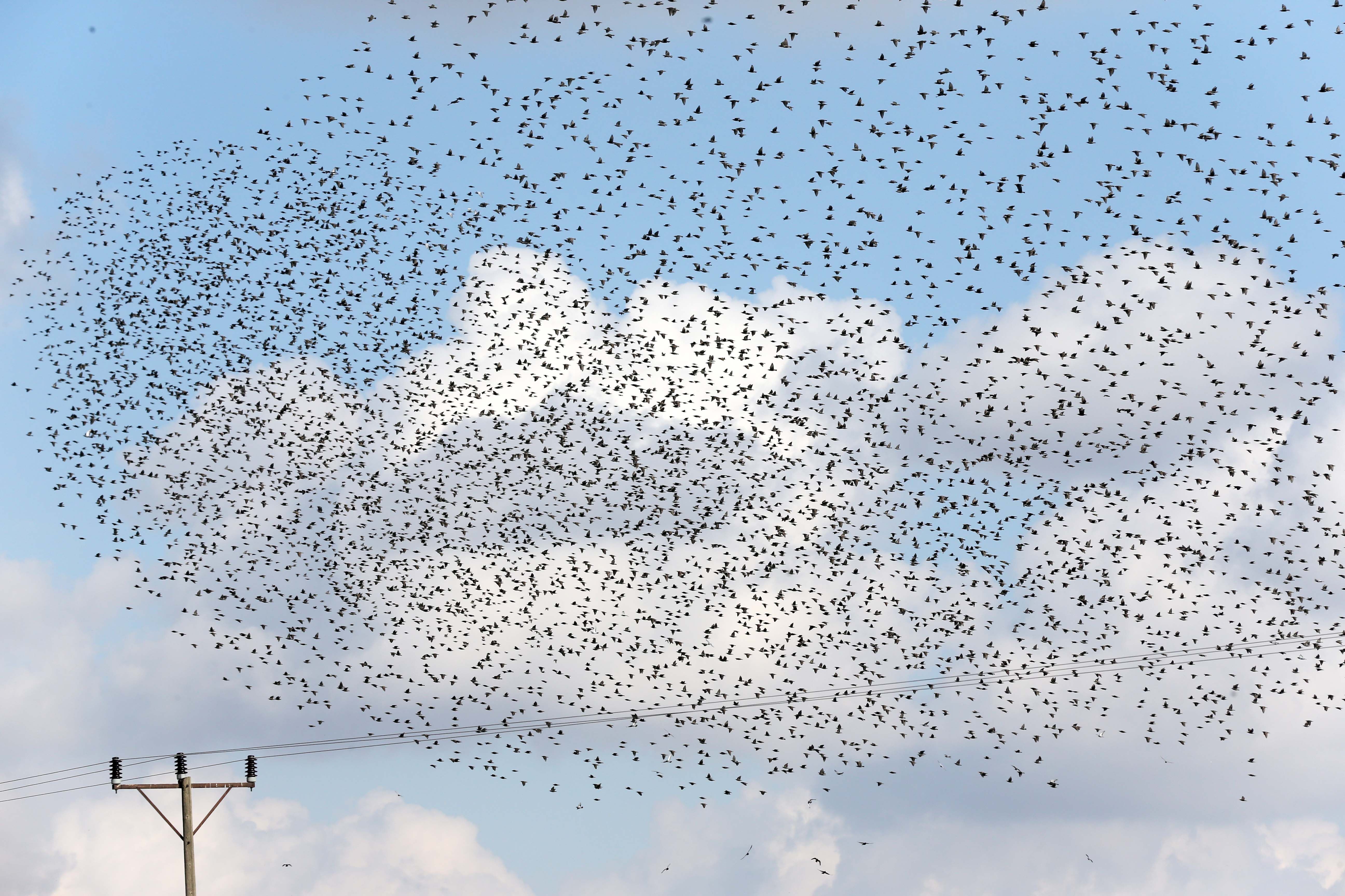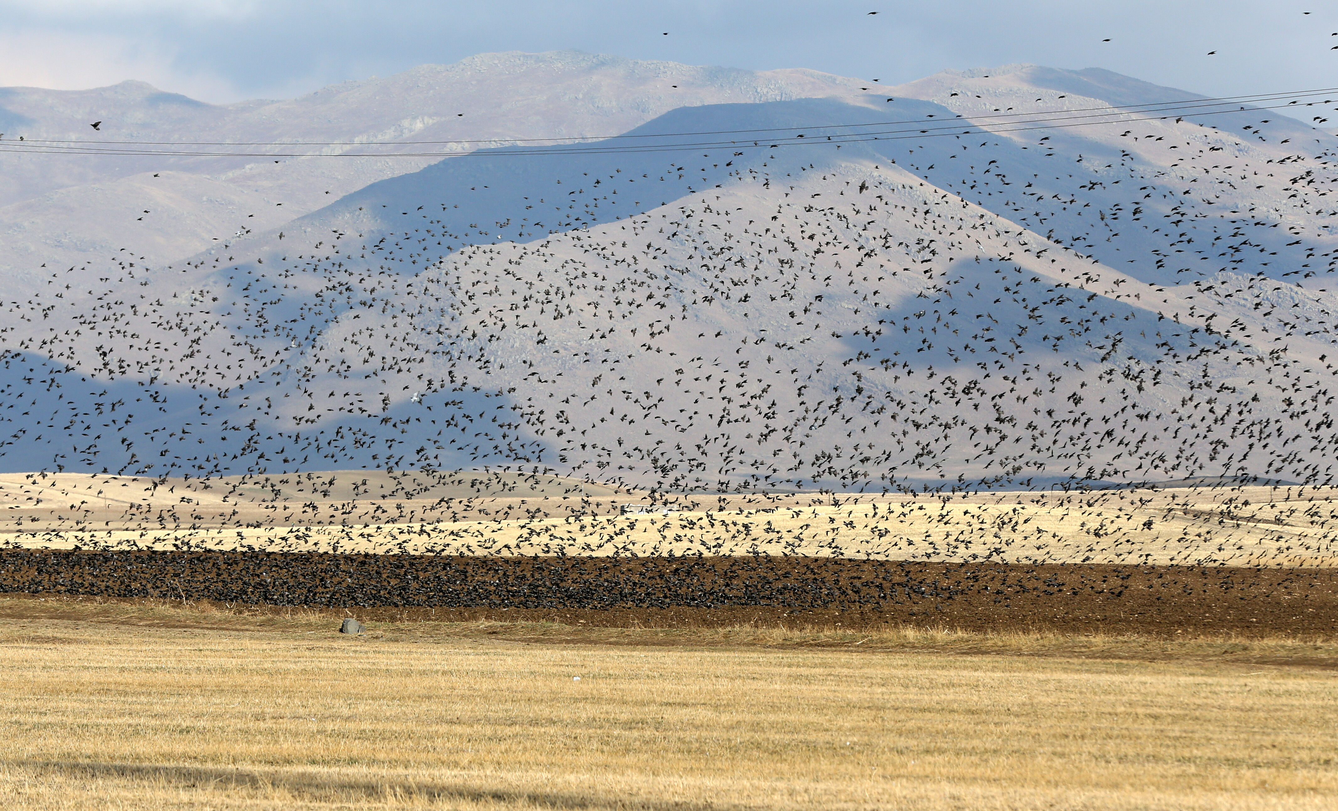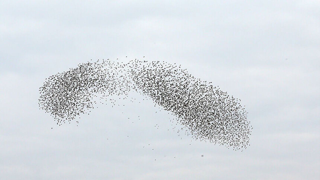Tarlalara konan binlerce sığırcık kuşunun, başka bir yere gitmek için aynı anda hareket etmesi kameralara yansıdı.