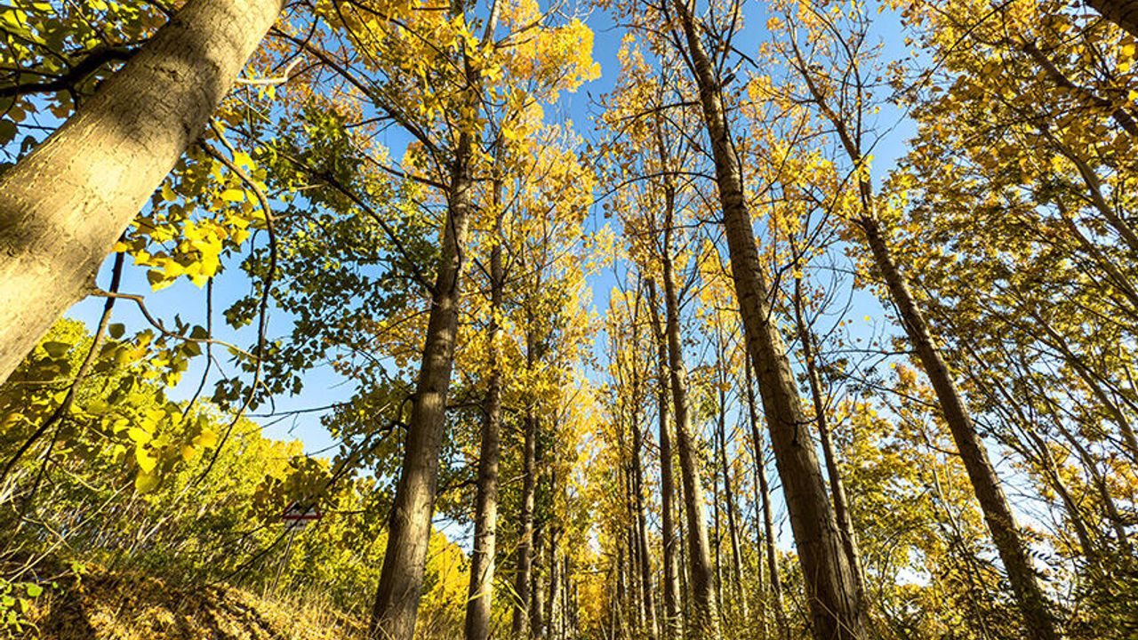 Yola karşılıklı dikilmiş kavak ağaçları, bir tarafta yeşil yapraklarını korurken diğer tarafta sarının tonlarına büründü.