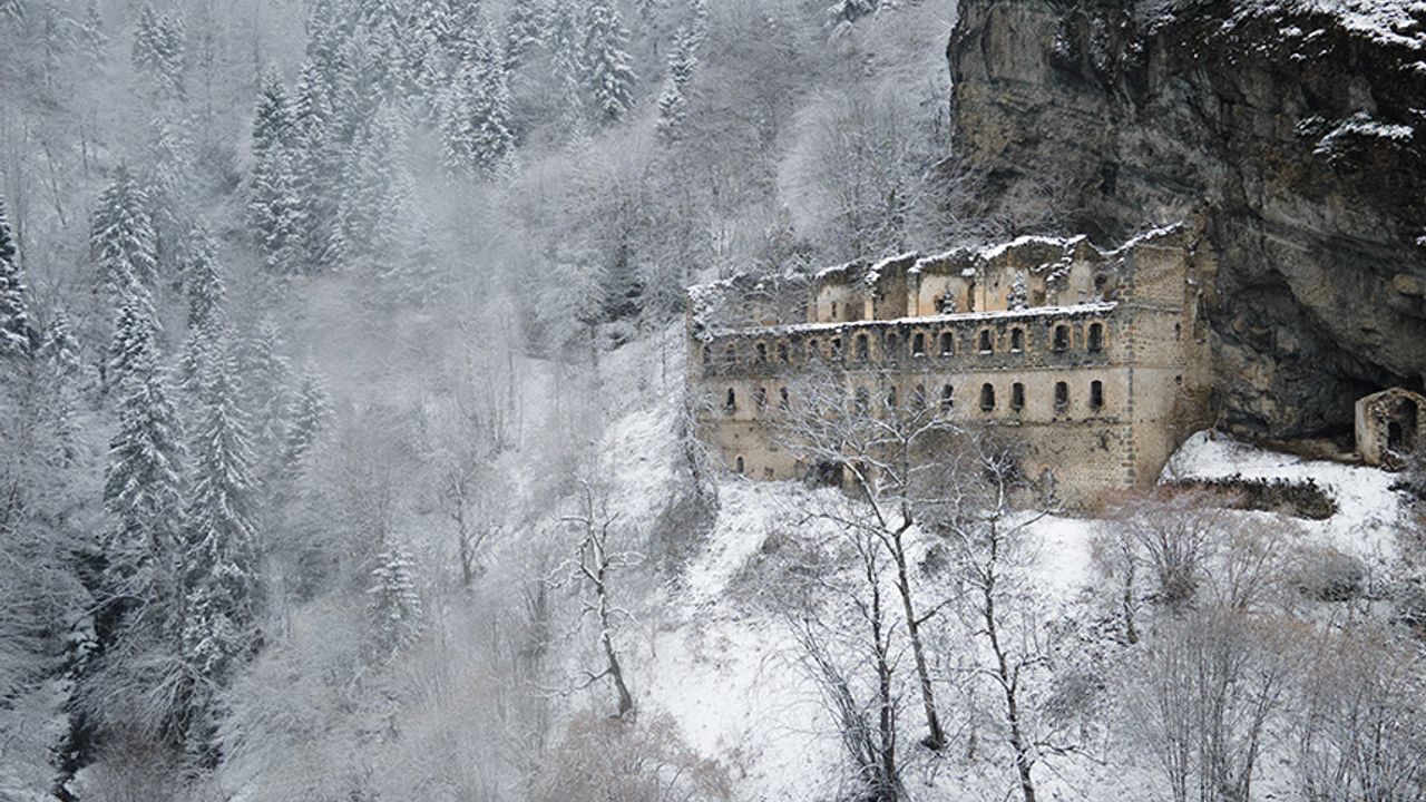 Trabzon'un Maçka ilçesine bağlı Kiremitli köyünde bulunan Vazelon Manastırı yoğun kar yağışının ardından beyaz örtüyle kaplandı.