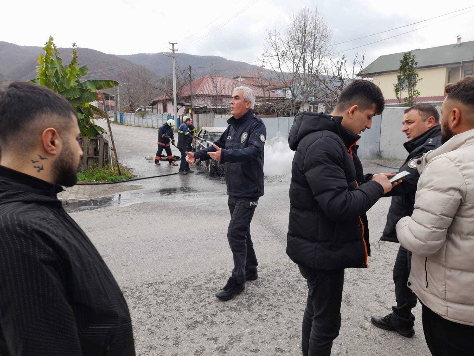 Bir anda alev topuna dönen araçtan zor kurtulan Kurnaz ve Çupukçi yangın söndürme tüpleri ile aracı söndürmeye çalışsa da başarılı olamadı.
