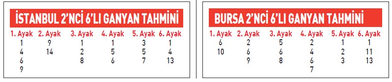 Ankara pistinde çıktığı son iki çim koşusunda da ikincilik elde ederek İstanbul pistine çıkacak olan 1 numara DEMİR BARBAR, 13 numara CENNETÇEŞME ve ilk defa start alacak olan 10 numara TAYKUTHAN şanslı gördüğüm isimler. Sıralamam; 1-13-10