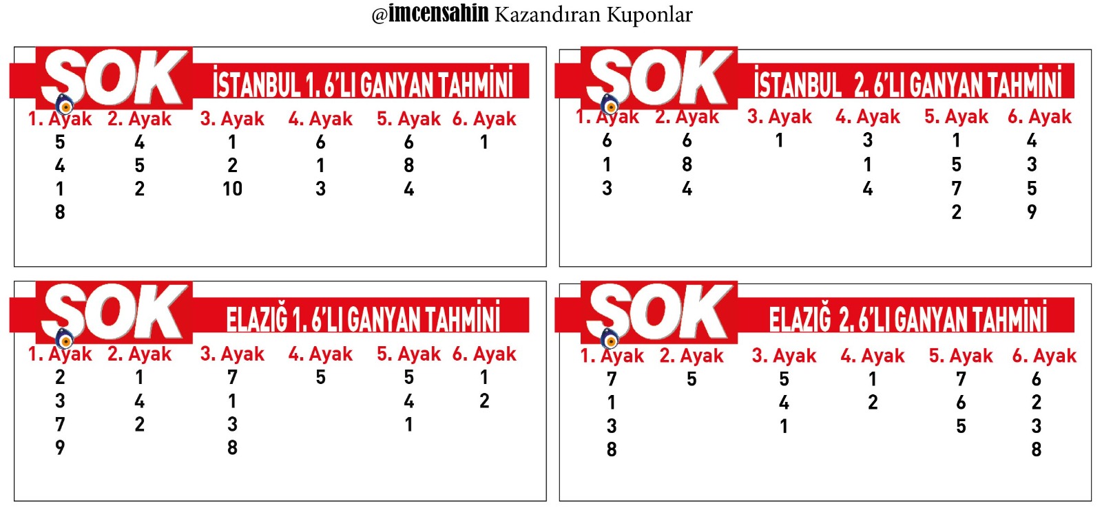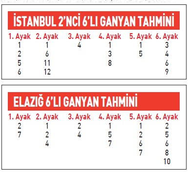 Sok Kocaeli koşusunda elde ettiği 3.lük ile 5 numara AYBARIM ve sürekli 2.likleri ile 1 numara GÜLALP KIZI arasında hata yapmayanın kazanacağı bir koşu bekliyorum. Sıralamam; 5-1