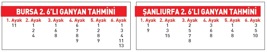 Koşuya erken adapte olması durumunda Bursa kum pistinde daha once başarılı sonuçlarını izlediğimiz 4 numara KAŞMİRTAY en iddialı isim olacaktır. 1 numara DEMİRKARDEŞLER kazandığı kosu ile formunun yüksek olduğunu gösterdi. Son koşusuna anlam veremediğim 6 numara İTAATSİZ bu mesafelerde oldukça etkili koşan bir isim. Ankara ve Kocaeli de katıldığı Grup2 ve Grup3 koşularda sert rakipleri yanında etkili olamayan 8 numara KAYALARIN ŞAHI bu gibi gruplarda her zaman söz sahibi olabilecek potansiyelde bir isim. Sıralamam; 4-1-6-8