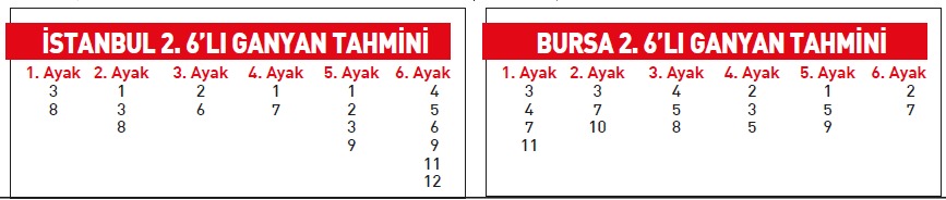 Sentetik pistte katıldığı koşularda başarılı sonuçlar alan 2 numara HOLA Y CHAO, 5 numara SYNDİCATION ve 3 numara KUBAT KASIRGASI koşuda öne çıkan isimler. Koşu hayatına kazanarak başlayan 7 numara KÜREN sonraki ihtimal. Sıralamam; 2-5-3-7