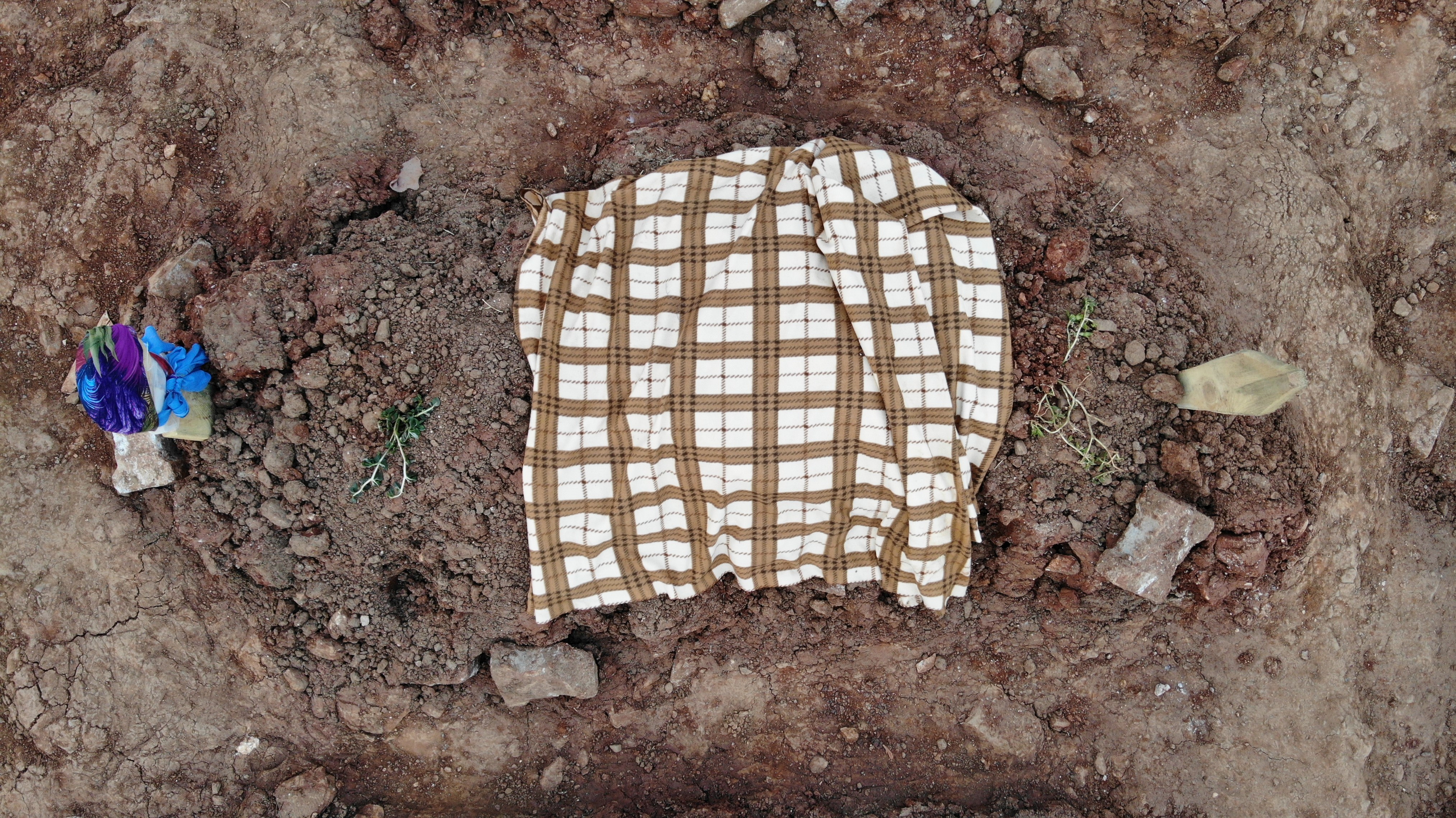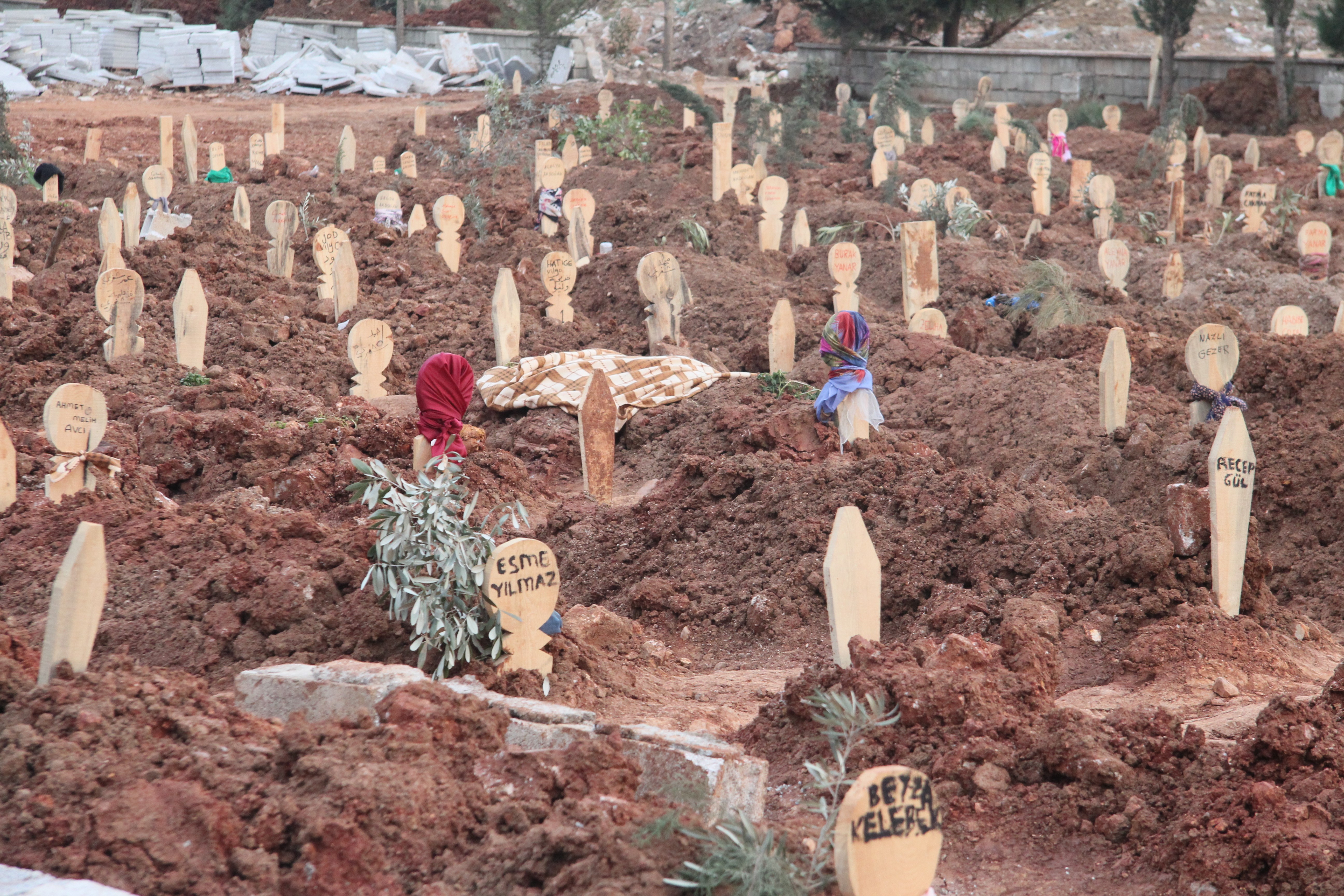 Büyük acının yaşandığı depremlerde vefat edenlerin yarım kalan hikayeleri mezarlıklara da yansıdı. Aynı soy isimden yan yana 6-7 kişinin yattığı mezarlar ilçedeki yıkımda enkaz altında yok olan ailelerin tanığı oldu. İsimleri Arapça harflerle yazılmış Suriyelilerin de yan yana defnedildiği mezarlara yarım kalan hikayeler de yansıdı. Kimi mezarların üzerine battaniye örtülürken, kim mezar taşlarına ise depremzedelerin enkaz altından kurtarılan bere, eşarp, atkı tişört gibi kişisel eşyaları da mezar taşına giydirildi.