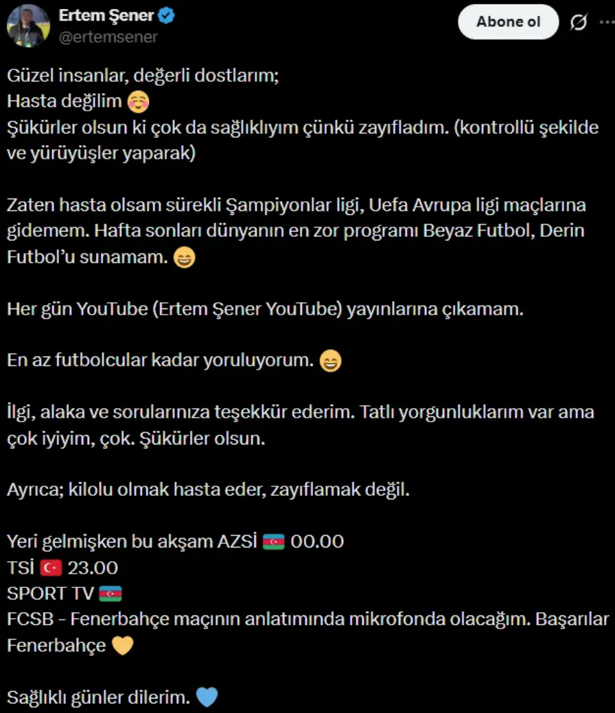 Ünlü spor spikeri ve program sunucusu Ertem Şener, son dönemde kilo kaybı sonrası gündeme gelen “hasta” olduğu iddialarına sosyal medya üzerinden yanıt verdi. Şener, sağlık durumunun iyi olduğunu belirterek spekülasyonları yalanladı.