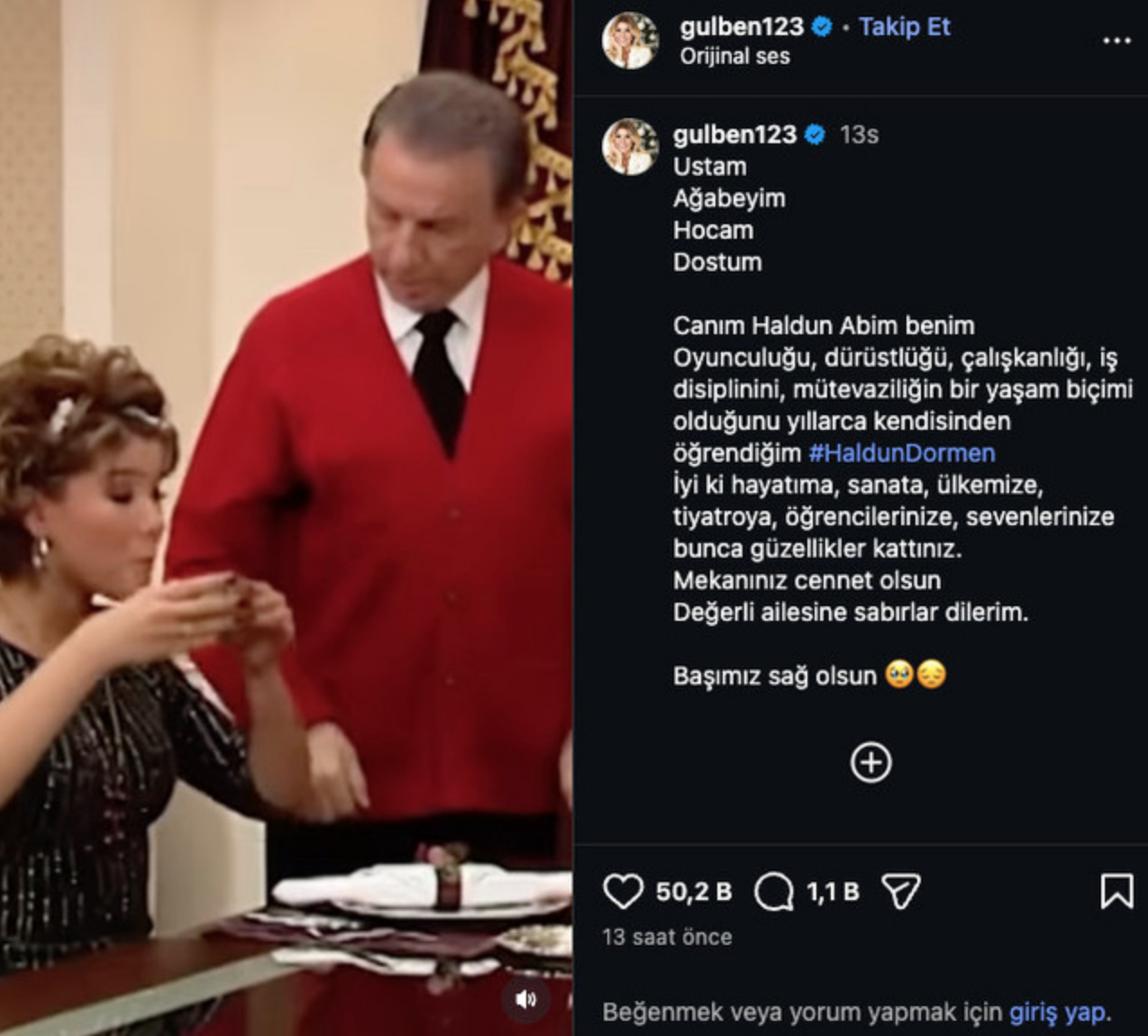 Oyunculuğu, dürüstlüğü, çalışkanlığı, iş disiplinini, mütevaziliğin bir yaşam biçimi olduğunu yıllarca kendisinden öğrendiğim #HaldunDormen…