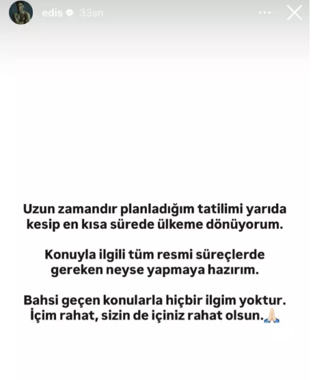 Gelişmenin ardından Edis'ten ilk açıklama da geldi. Ünlü şarkıcı, sosyal medya hesabından yaptığı paylaşımda, "Uzun zamandır planladığım tatilimi yarıda kesip en kısa sürede ülkeme dönüyorum. Konuyla ilgili tüm resmi süreçlerde gereken neyse yapmaya hazırım. Bahsi geçen konularla hiçbir ilgim yoktur. İçim rahat, sizin de içiniz rahat olsun." ifadelerine yer verdi.